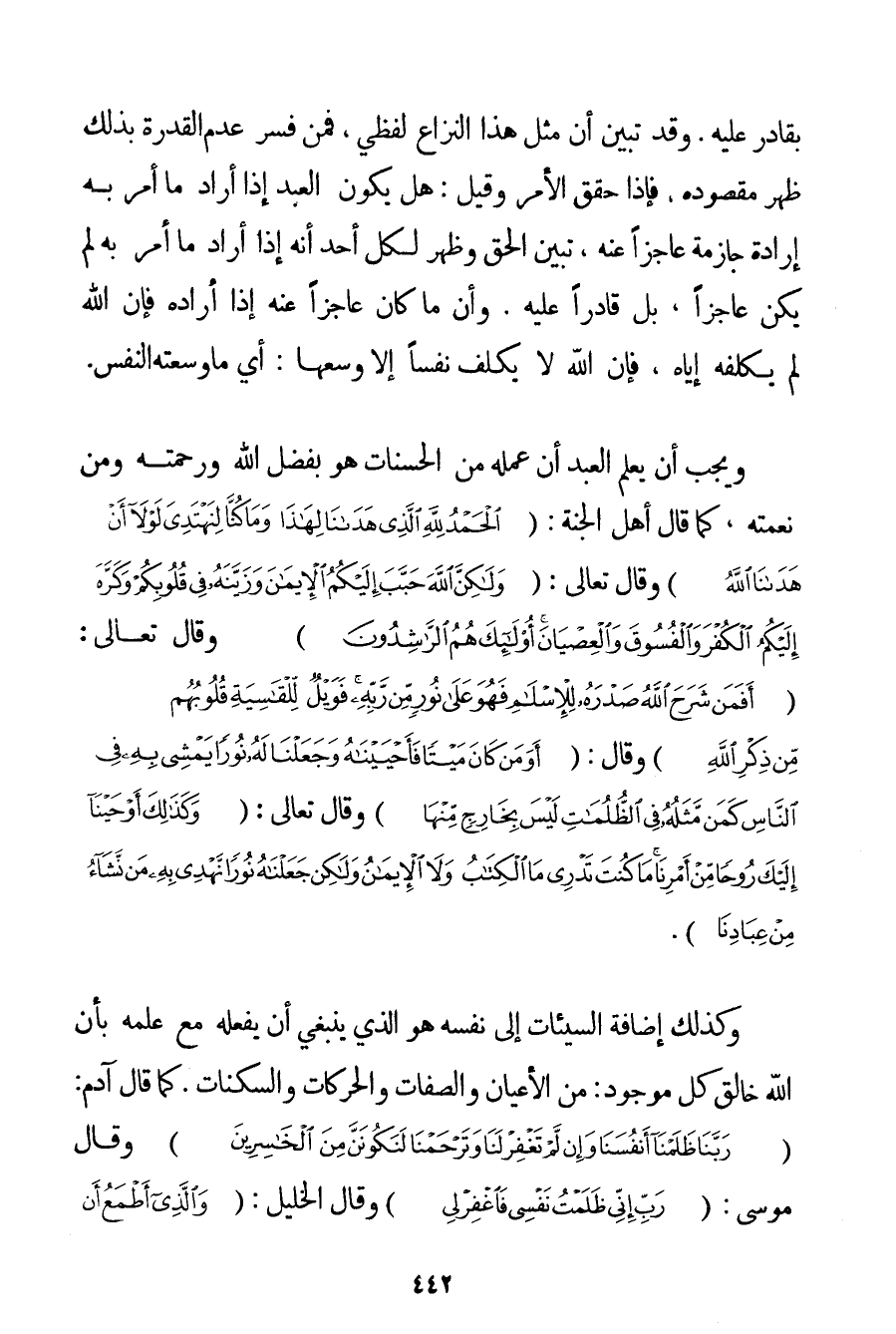 وَيَجِبُ أَنْ يَعْلَمَ الْعَبْدُ أَنَّ عَمَلَهُ مِنْ الْحَسَنَاتِ هُوَ بِفَضْلِ اللَّهِ وَرَحْمَتِهِ وَمِنْ نِعْمَتِهِ كَمَا قَالَ أَهْلُ الْجَنَّةِ: {الْحَمْدُ لِلَّهِ الَّذِي هَدَانَا لِهَذَا وَمَا كُنَّا لِنَهْتَدِيَ لَوْلَا أَنْ هَدَانَا اللَّهُ} وَقَالَ تَعَالَى: {وَلَكِنَّ اللَّهَ حَبَّبَ إلَيْكُمُ الْإِيمَانَ وَزَيَّنَهُ فِي قُلُوبِكُمْ وَكَرَّهَ إلَيْكُمُ الْكُفْرَ وَالْفُسُوقَ وَالْعِصْيَانَ أُولَئِكَ هُمُ الرَّاشِدُونَ} وَقَالَ تَعَالَى: {أَفَمَنْ شَرَحَ اللَّهُ صَدْرَهُ لِلْإِسْلَامِ فَهُوَ عَلَى نُورٍ مِنْ رَبِّهِ فَوَيْلٌ لِلْقَاسِيَةِ قُلُوبُهُمْ مِنْ ذِكْرِ اللَّهِ} وَقَالَ: {أَوَمَنْ كَانَ مَيْتًا فَأَحْيَيْنَاهُ وَجَعَلْنَا لَهُ نُورًا يَمْشِي بِهِ فِي النَّاسِ كَمَنْ مَثَلُهُ فِي الظُّلُمَاتِ لَيْسَ بِخَارِجٍ مِنْهَا} وَقَالَ تَعَالَى: {وَكَذَلِكَ أَوْحَيْنَا إلَيْكَ رُوحًا مِنْ أَمْرِنَا مَا كُنْتَ تَدْرِي مَا الْكِتَابُ وَلَا الْإِيمَانُ وَلَكِنْ جَعَلْنَاهُ نُورًا نَهْدِي بِهِ مَنْ نَشَاءُ مِنْ عِبَادِنَا} . وَكَذَلِكَ إضَافَةُ السَّيِّئَاتِ إلَى نَفْسِهِ هُوَ الَّذِي يَنْبَغِي أَنْ يَفْعَلَهُ مَعَ عِلْمِهِ بِأَنَّ اللَّهَ خَالِقُ كُلِّ مَوْجُودٍ: مِنْ الْأَعْيَانِ وَالصِّفَاتِ وَالْحَرَكَاتِ وَالسَّكَنَاتِ. كَمَا قَالَ آدَمَ: {رَبَّنَا ظَلَمْنَا أَنْفُسَنَا وَإِنْ لَمْ تَغْفِرْ لَنَا وَتَرْحَمْنَا لَنَكُونَنَّ مِنَ الْخَاسِرِينَ} وَقَالَ مُوسَى: {رَبِّ إنِّي ظَلَمْتُ نَفْسِي فَاغْفِرْ لِي} وَقَالَ الْخَلِيلُ: {وَالَّذِي أَطْمَعُ أَنْ