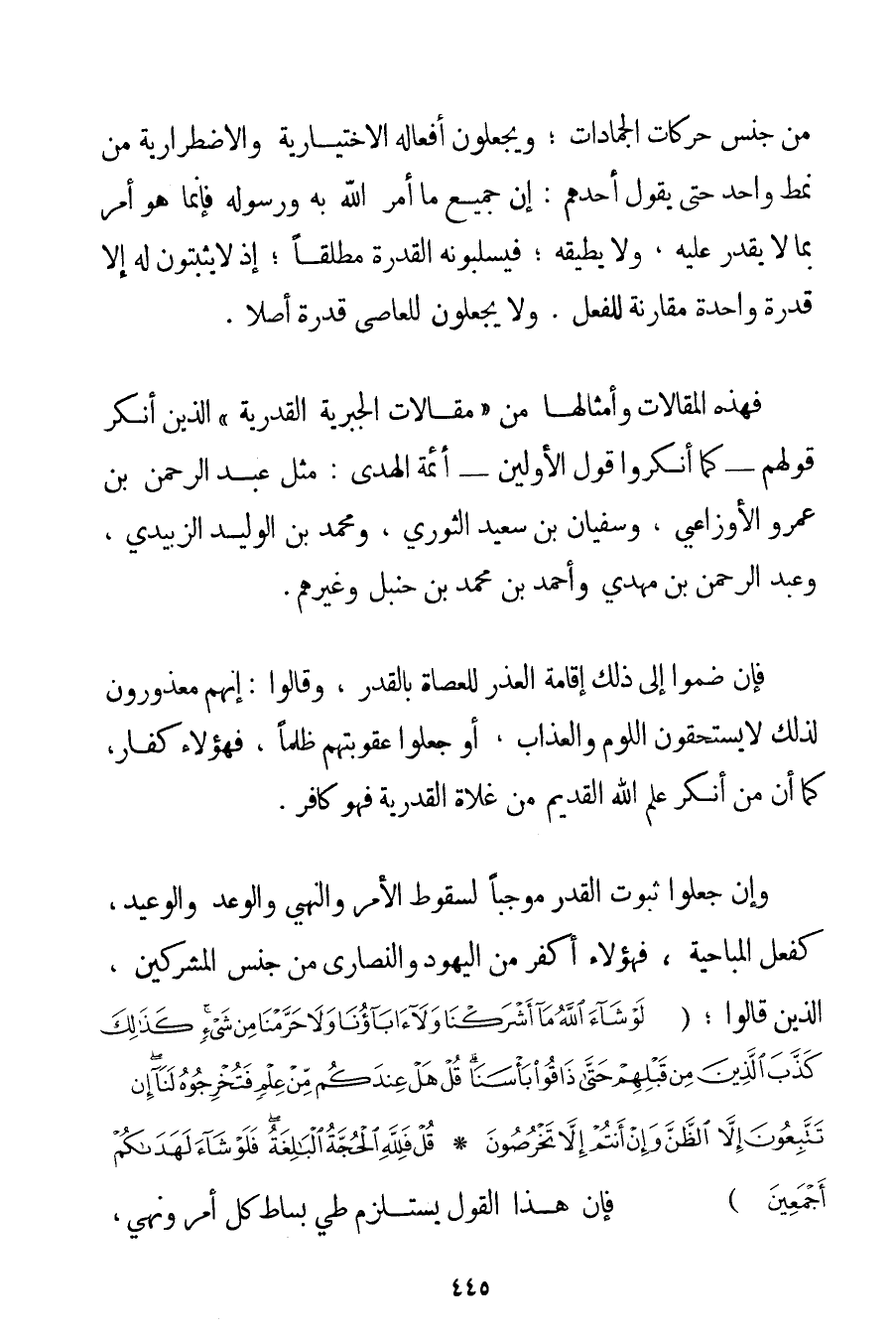 مِنْ جِنْسِ حَرَكَاتِ الْجَمَادَاتِ؛ وَيَجْعَلُونَ أَفْعَالَهُ الِاخْتِيَارِيَّةَ والاضطرارية مِنْ نَمَطٍ وَاحِدٍ حَتَّى يَقُولَ أَحَدُهُمْ: إنَّ جَمِيعَ مَا أَمَرَ اللَّهُ بِهِ وَرَسُولُهُ فَإِنَّمَا هُوَ أَمْرٌ بِمَا لَا يَقْدِرُ عَلَيْهِ وَلَا يُطِيقُهُ؛ فَيَسْلُبُونَهُ الْقُدْرَةَ مُطْلَقًا؛ إذْ لَا يَثْبُتُونَ لَهُ إلَّا قُدْرَةً وَاحِدَةً مُقَارِنَةً لِلْفِعْلِ. وَلَا يَجْعَلُونَ لِلْعَاصِي قُدْرَةً أَصْلًا. فَهَذِهِ الْمَقَالَاتُ وَأَمْثَالُهَا مِنْ " مَقَالَاتِ الْجَبْرِيَّةِ الْقَدَرِيَّةِ " الَّذِينَ أَنْكَرَ قَوْلَهُمْ - كَمَا أَنْكَرُوا قَوْلَ الْأَوَّلِينَ - أَئِمَّةَ الْهُدَى: مِثْلَ عَبْدِ الرَّحْمَنِ بْنِ عَمْرٍو الأوزاعي وَسُفْيَانَ بْنِ سَعِيدٍ الثَّوْرِيِّ وَمُحَمَّدِ بْنِ الْوَلِيدِ الزُّبَيْدِيِّ وَعَبْدِ الرَّحْمَنِ بْنِ مَهْدِيٍّ وَأَحْمَد بْنِ مُحَمَّدِ بْنِ حَنْبَلٍ وَغَيْرِهِمْ. فَإِنْ ضَمُّوا إلَى ذَلِكَ إقَامَةَ الْعُذْرِ لِلْعُصَاةِ بِالْقَدَرِ وَقَالُوا: إنَّهُمْ مَعْذُورُونَ لِذَلِكَ لَا يَسْتَحِقُّونَ اللَّوْمَ وَالْعَذَابَ أَوْ جَعَلُوا عُقُوبَتَهُمْ ظُلْمًا فَهَؤُلَاءِ كُفَّارٌ كَمَا أَنَّ مَنْ أَنْكَرَ عِلْمَ اللَّهِ الْقَدِيمَ مِنْ غُلَاةِ الْقَدَرِيَّةِ فَهُوَ كَافِرٌ. وَإِنْ جَعَلُوا ثُبُوتَ الْقَدَرِ مُوجِبًا لِسُقُوطِ الْأَمْرِ وَالنَّهْيِ وَالْوَعْدِ وَالْوَعِيدِ كَفِعْلِ المباحية فَهَؤُلَاءِ أَكْفَرُ مِنْ الْيَهُودِ وَالنَّصَارَى مِنْ جِنْسِ الْمُشْرِكِينَ الَّذِينَ قَالُوا؛ {لَوْ شَاءَ اللَّهُ مَا أَشْرَكْنَا وَلَا آبَاؤُنَا وَلَا حَرَّمْنَا مِنْ شَيْءٍ كَذَلِكَ كَذَّبَ الَّذِينَ مِنْ قَبْلِهِمْ حَتَّى ذَاقُوا بَأْسَنَا قُلْ هَلْ عِنْدَكُمْ مِنْ عِلْمٍ فَتُخْرِجُوهُ لَنَا إنْ تَتَّبِعُونَ إلَّا الظَّنَّ وَإِنْ أَنْتُمْ إلَّا تَخْرُصُونَ} {قُلْ فَلِلَّهِ الْحُجَّةُ الْبَالِغَةُ فَلَوْ شَاءَ لَهَدَاكُمْ أَجْمَعِينَ} فَإِنَّ هَذَا الْقَوْلَ يَسْتَلْزِمُ طَيَّ بِسَاطِ كُلِّ أَمْرٍ وَنَهْيٍ