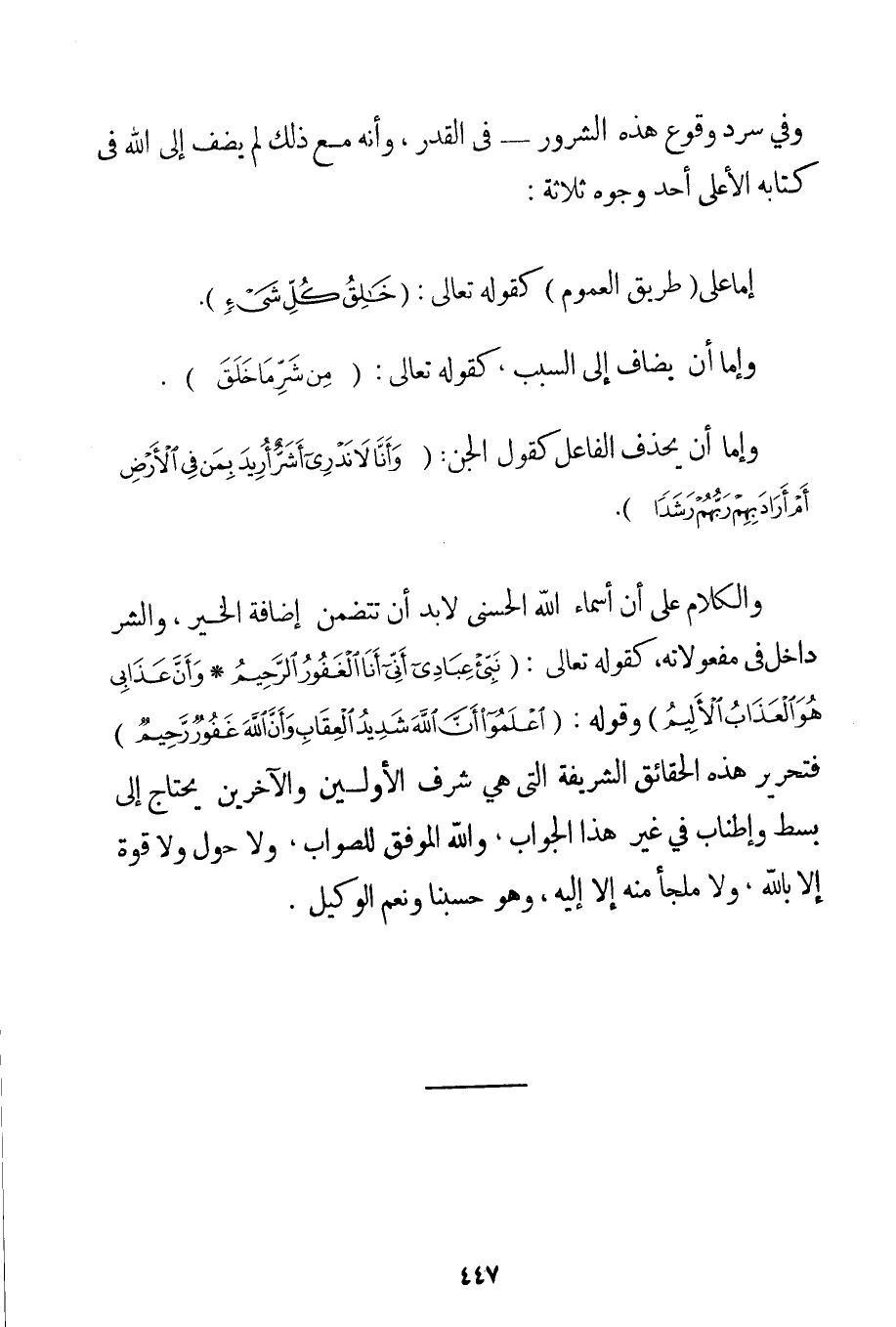 وَفِي سَرْدِ وُقُوعِ هَذِهِ الشُّرُورِ - فِي الْقَدَرِ وَأَنَّهُ مَعَ ذَلِكَ لَمْ يُضَفْ إلَى اللَّهِ فِي كِتَابِهِ إلَّا عَلَى أَحَدِ وُجُوهٍ ثَلَاثَةٍ: إمَّا عَلَى (طَرِيقِ الْعُمُومِ كَقَوْلِهِ تَعَالَى: {خَالِقُ كُلِّ شَيْءٍ} . وَإِمَّا أَنْ يُضَافَ إلَى السَّبَبِ كَقَوْلِهِ تَعَالَى: {مِنْ شَرِّ مَا خَلَقَ} . وَإِمَّا أَنْ يُحْذَفَ الْفَاعِلُ كَقَوْلِ الْجِنِّ: {وَأَنَّا لَا نَدْرِي أَشَرٌّ أُرِيدَ بِمَنْ فِي الْأَرْضِ أَمْ أَرَادَ بِهِمْ رَبُّهُمْ رَشَدًا} . وَالْكَلَامُ عَلَى أَنَّ أَسْمَاءَ اللَّهِ الْحُسْنَى لَا بُدَّ أَنْ تَتَضَمَّنَ إضَافَةَ الْخَيْرِ وَالشَّرِّ دَاخِلٌ فِي مَفْعُولَاتِهِ كَقَوْلِهِ تَعَالَى: {نَبِّئْ عِبَادِي أَنِّي أَنَا الْغَفُورُ الرَّحِيمُ} {وَأَنَّ عَذَابِي هُوَ الْعَذَابُ الْأَلِيمُ} وَقَوْلِهِ: {اعْلَمُوا أَنَّ اللَّهَ شَدِيدُ الْعِقَابِ وَأَنَّ اللَّهَ غَفُورٌ رَحِيمٌ} فَتَحْرِيرُ هَذِهِ الْحَقَائِقِ الشَّرِيفَةِ الَّتِي هِيَ شَرَفُ الْأَوَّلِينَ والآخرين يَحْتَاجُ إلَى بَسْطٍ وَإِطْنَابٍ فِي غَيْرِ هَذَا الْجَوَابِ وَاَللَّهُ الْمُوَفِّقُ لِلصَّوَابِ وَلَا حَوْلَ وَلَا قُوَّةَ إلَّا بِاَللَّهِ وَلَا مَلْجَأَ مِنْهُ إلَّا إلَيْهِ وَهُوَ حَسْبُنَا وَنِعْمَ الْوَكِيلُ.