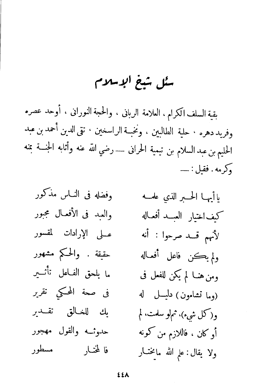 سُئِلَ شَيْخُ الْإِسْلَامِ بَقِيَّةُ السَّلَفِ الْكِرَامِ الْعَلَّامَةُ الرَّبَّانِيُّ وَالْحُجَّةُ النُّورَانِيُّ أَوْحَدُ عَصْرِهِ وَفَرِيدُ دَهْرِهِ حِلْيَةُ الطَّالِبِينَ وَنُخْبَةُ الرَّاسِخِينَ تَقِيُّ الدِّينِ أَحْمَد بْنُ عَبْدِ الْحَلِيمِ بْنِ عَبْدِ السَّلَامِ ابْنُ تَيْمِيَّة الْحَرَّانِي - رَضِيَ اللَّهُ عَنْهُ وَأَثَابَهُ الْجَنَّةَ بِمَنِّهِ وَكَرَمِهِ - فَقِيلَ: