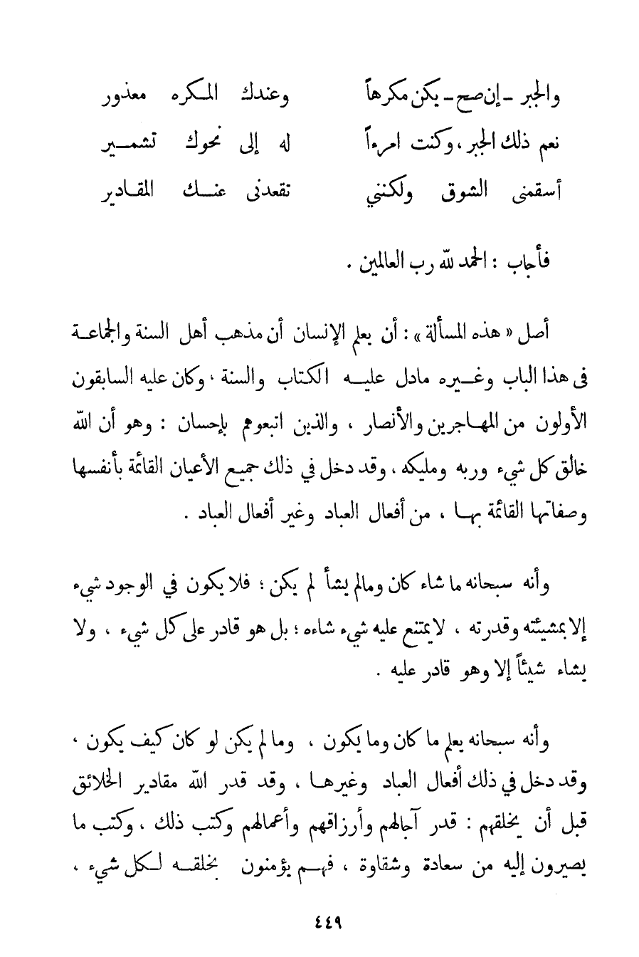 الْحَمْدُ لِلَّهِ رَبِّ الْعَالَمِينَ، أَصْلُ " هَذِهِ الْمَسْأَلَةِ ": أَنْ يَعْلَمَ الْإِنْسَانُ أَنَّ مَذْهَبَ أَهْلِ السُّنَّةِ وَالْجَمَاعَةِ فِي هَذَا الْبَابِ وَغَيْرِهِ مَا دَلَّ عَلَيْهِ الْكِتَابُ وَالسُّنَّةُ وَكَانَ عَلَيْهِ السَّابِقُونَ الْأَوَّلُونَ مِنْ الْمُهَاجِرِينَ وَالْأَنْصَارِ وَاَلَّذِينَ اتَّبَعُوهُمْ بِإِحْسَانِ: وَهُوَ أَنَّ اللَّهَ خَالِقُ كُلِّ شَيْءٍ وَرَبُّهُ وَمَلِيكُهُ وَقَدْ دَخَلَ فِي ذَلِكَ جَمِيعُ الْأَعْيَانِ الْقَائِمَةُ بِأَنْفُسِهَا وَصِفَاتِهَا الْقَائِمَةِ بِهَا مِنْ أَفْعَالِ الْعِبَادِ وَغَيْرِ أَفْعَالِ الْعِبَادِ. وَأَنَّهُ سُبْحَانَهُ مَا شَاءَ كَانَ وَمَا لَمْ يَشَأْ لَمْ يَكُنْ؛ فَلَا يَكُونُ فِي الْوُجُودِ شَيْءٌ إلَّا بِمَشِيئَتِهِ وَقُدْرَتِهِ لَا يَمْتَنِعُ عَلَيْهِ شَيْءٌ شَاءَهُ؛ بَلْ هُوَ قَادِرٌ عَلَى كُلِّ شَيْءٍ وَلَا يَشَاءُ شَيْئًا إلَّا وَهُوَ قَادِرٌ عَلَيْهِ. وَأَنَّهُ سُبْحَانَهُ يَعْلَمُ مَا كَانَ وَمَا يَكُونُ وَمَا لَمْ يَكُنْ لَوْ كَانَ كَيْفَ يَكُونُ وَقَدْ دَخَلَ فِي ذَلِكَ أَفْعَالُ الْعِبَادِ وَغَيْرُهَا وَقَدْ قَدَّرَ اللَّهُ مَقَادِيرَ الْخَلَائِقِ قَبْلَ أَنْ يَخْلُقَهُمْ: قَدَّرَ آجَالَهُمْ وَأَرْزَاقَهُمْ وَأَعْمَالَهُمْ وَكَتَبَ ذَلِكَ وَكَتَبَ مَا يَصِيرُونَ إلَيْهِ مِنْ سَعَادَةٍ وَشَقَاوَةٍ فَهُمْ يُؤْمِنُونَ بِخَلْقِهِ لِكُلِّ شَيْءٍ