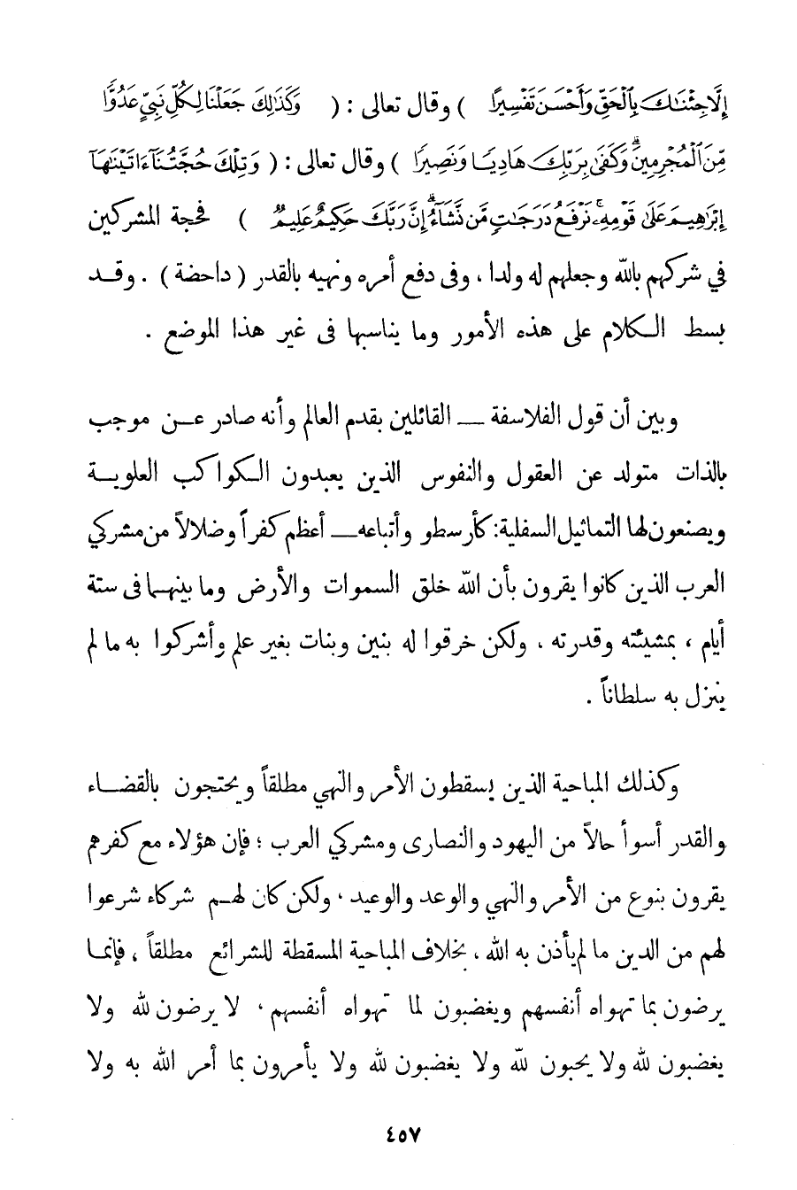 وَبَيِّنٌ أَنَّ قَوْلَ الْفَلَاسِفَةِ - الْقَائِلِينَ بِقِدَمِ الْعَالَمِ وَأَنَّهُ صَادِرٌ عَنْ مُوجَبٍ بِالذَّاتِ مُتَوَلَّدٌ عَنْ الْعُقُولِ وَالنُّفُوسِ الَّذِينَ يَعْبُدُونَ الْكَوَاكِبَ الْعُلْوِيَّةَ وَيَصْنَعُونَ لَهَا التَّمَاثِيلَ السُّفْلِيَّةَ: كَأَرِسْطُو وَأَتْبَاعِهِ - أَعْظَمُ كُفْرًا وَضَلَالًا مِنْ مُشْرِكِي الْعَرَبِ الَّذِينَ كَانُوا يُقِرُّونَ بِأَنَّ اللَّهَ خَلَقَ السَّمَوَاتِ وَالْأَرْضَ وَمَا بَيْنَهُمَا فِي سِتَّةِ أَيَّامٍ بِمَشِيئَتِهِ وَقُدْرَتِهِ وَلَكِنْ خَرَقُوا لَهُ بَنِينَ وَبَنَاتٍ بِغَيْرِ عِلْمٍ وَأَشْرَكُوا بِهِ مَا لَمْ يُنَزِّلْ بِهِ سُلْطَانًا. وَكَذَلِكَ المباحية الَّذِينَ يُسْقِطُونَ الْأَمْرَ وَالنَّهْيَ مُطْلَقًا وَيَحْتَجُّونَ بِالْقَضَاءِ وَالْقَدَرِ أَسْوَأُ حَالًا مِنْ الْيَهُودِ وَالنَّصَارَى وَمُشْرِكِي الْعَرَبِ؛ فَإِنَّ هَؤُلَاءِ مَعَ كُفْرِهِمْ يُقِرُّونَ بِنَوْعِ مِنْ الْأَمْرِ وَالنَّهْيِ وَالْوَعْدِ وَالْوَعِيدِ وَلَكِنْ كَانَ لَهُمْ شُرَكَاءُ شَرَعُوا لَهُمْ مِنْ الدِّينِ مَا لَمْ يَأْذَنْ بِهِ اللَّهُ بِخِلَافِ المباحية الْمُسْقِطَةِ لِلشَّرَائِعِ مُطْلَقًا فَإِنَّمَا يَرْضَوْنَ بِمَا تَهْوَاهُ أَنْفُسُهُمْ وَيَغْضَبُونَ لِمَا تَهْوَاهُ أَنْفُسُهُمْ لَا يَرْضُونَ لِلَّهِ وَلَا يَغْضَبُونَ لِلَّهِ وَلَا يُحِبُّونَ لِلَّهِ وَلَا يَغْضَبُونَ لِلَّهِ وَلَا يَأْمُرُونَ بِمَا أَمَرَ اللَّهُ بِهِ وَلَا