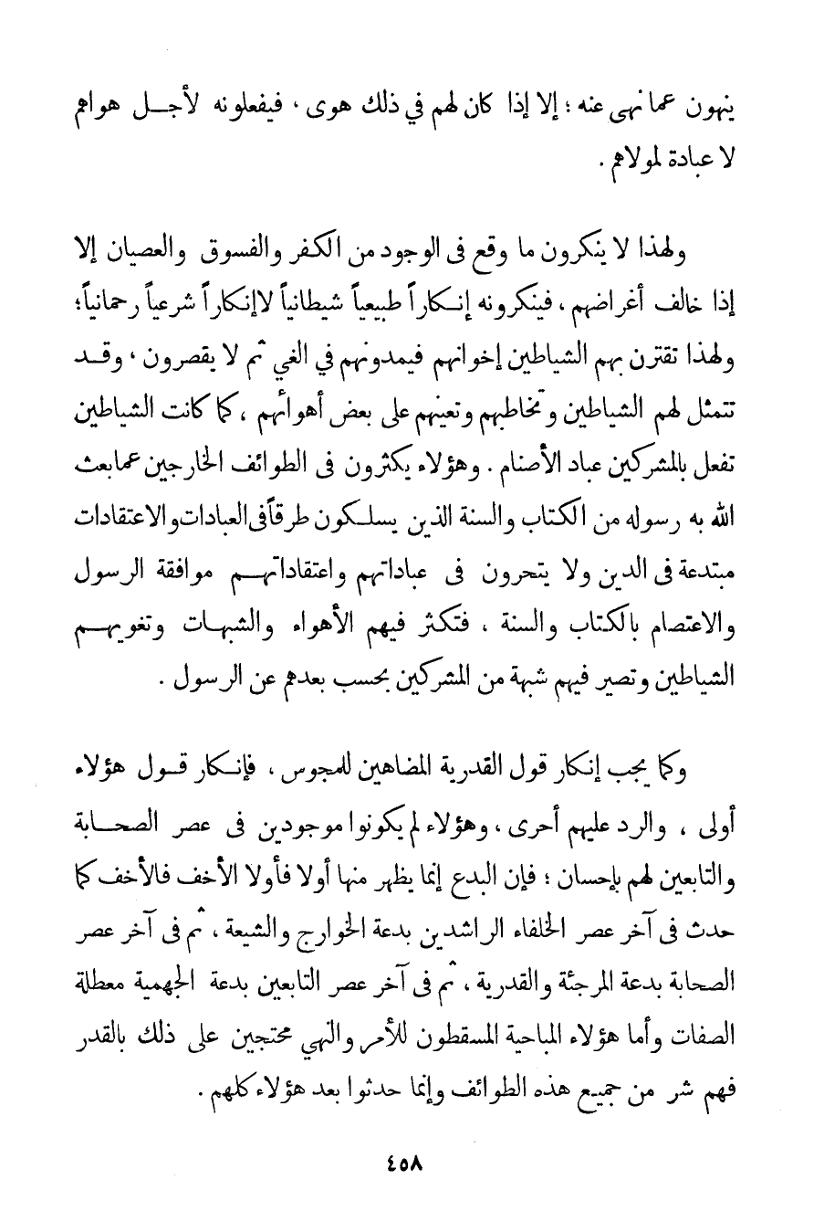 يَنْهَوْنَ عَمَّا نَهَى عَنْهُ؛ إلَّا إذَا كَانَ لَهُمْ فِي ذَلِكَ هَوًى فَيَفْعَلُونَهُ لِأَجْلِ هَوَاهُمْ لَا عِبَادَةً لِمَوْلَاهُمْ؛ وَلِهَذَا لَا يُنْكِرُونَ مَا وَقَعَ فِي الْوُجُودِ مِنْ الْكُفْرِ وَالْفُسُوقِ وَالْعِصْيَانِ إلَّا إذَا خَالَفَ أَغْرَاضَهُمْ فَيُنْكِرُونَهُ إنْكَارًا طَبِيعِيًّا شَيْطَانِيًّا لَا إنْكَارًا شَرْعِيًّا رَحْمَانِيًّا؛ وَلِهَذَا تَقْتَرِنُ بِهِمْ الشَّيَاطِينُ إخْوَانُهُمْ فَيَمُدُّونَهُمْ فِي الْغَيِّ ثُمَّ لَا يَقْصُرُونَ وَقَدْ تَتَمَثَّلُ لَهُمْ الشَّيَاطِينُ وَتُخَاطِبُهُمْ وَتُعِينُهُمْ عَلَى بَعْضِ أَهْوَائِهِمْ كَمَا كَانَتْ الشَّيَاطِينُ تَفْعَلُ بِالْمُشْرِكِينَ عُبَّادِ الْأَصْنَامِ. وَهَؤُلَاءِ يَكْثُرُونَ فِي الطَّوَائِفِ الْخَارِجِينَ عَمَّا بَعَثَ اللَّهُ بِهِ رَسُولَهُ مِنْ الْكِتَابِ وَالسُّنَّةِ الَّذِينَ يَسْلُكُونَ طُرُقًا فِي الْعِبَادَاتِ وَالِاعْتِقَادَاتِ مُبْتَدَعَةً فِي الدِّينِ وَلَا يَتَحَرَّوْنَ فِي عِبَادَاتِهِمْ واعتقاداتهم مُوَافَقَةَ الرَّسُولِ وَالِاعْتِصَامَ بِالْكِتَابِ وَالسُّنَّةِ فَتَكْثُرُ فِيهِمْ الْأَهْوَاءُ وَالشُّبُهَاتُ وَتُغْوِيهِمْ الشَّيَاطِينُ وَتَصِيرُ فِيهِمْ شُبْهَةٌ مِنْ الْمُشْرِكِينَ بِحَسَبِ بُعْدِهِمْ عَنْ الرَّسُولِ وَكَمَا يَجِبُ إنْكَارُ قَوْلِ الْقَدَرِيَّةِ الْمُضَاهِينَ لِلْمَجُوسِ فَإِنْكَارُ قَوْلِ هَؤُلَاءِ أَوْلَى وَالرَّدُّ عَلَيْهِمْ أَحْرَى وَهَؤُلَاءِ لَمْ يَكُونُوا مَوْجُودِينَ فِي عَصْرِ الصَّحَابَةِ وَالتَّابِعِينَ لَهُمْ بِإِحْسَانِ؛ فَإِنَّ الْبِدَعَ إنَّمَا يَظْهَرُ مِنْهَا أَوَّلًا فَأَوَّلًا الْأَخَفُّ فَالْأَخَفُّ كَمَا حَدَثَ فِي آخِرِ عَصْرِ الْخُلَفَاءِ الرَّاشِدِينَ بِدْعَةُ الْخَوَارِجِ وَالشِّيعَةِ ثُمَّ فِي آخِرِ عَصْرِ الصَّحَابَةِ بِدْعَةُ الْمُرْجِئَةِ وَالْقَدَرِيَّةِ ثُمَّ فِي آخِرِ عَصْرِ التَّابِعِينَ بِدْعَةُ الْجَهْمِيَّة مُعَطِّلَةِ الصِّفَاتِ وَأَمَّا هَؤُلَاءِ المباحية الْمُسْقِطُونَ لِلْأَمْرِ وَالنَّهْيِ مُحْتَجِّينَ عَلَى ذَلِكَ بِالْقَدَرِ فَهُمْ شَرٌّ مِنْ جَمِيعِ هَذِهِ الطَّوَائِفِ وَإِنَّمَا حَدَثُوا بَعْدَ هَؤُلَاءِ كُلِّهِمْ.
