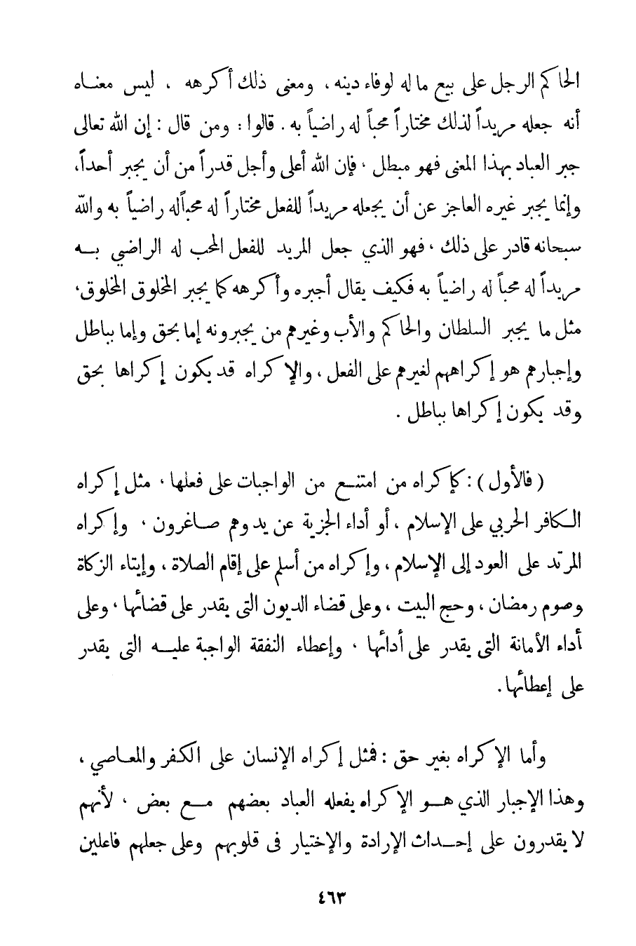 وَجَبَرَ الْحَاكِمُ الرَّجُلَ عَلَى بَيْعِ مَالِهِ لِوَفَاءِ دَيْنِهِ وَمَعْنَى ذَلِكَ أَكْرَهَهُ لَيْسَ مَعْنَاهُ أَنَّهُ جَعَلَهُ مُرِيدًا لِذَلِكَ مُخْتَارًا مُحِبًّا لَهُ رَاضِيًا بِهِ. قَالُوا: وَمَنْ قَالَ: إنَّ اللَّهَ تَعَالَى جَبَرَ الْعِبَادَ بِهَذَا الْمَعْنَى فَهُوَ مُبْطِلٌ فَإِنَّ اللَّهَ أَعْلَى وَأَجَلُّ قَدْرًا مِنْ أَنْ يُجْبِرَ أَحَدًا وَإِنَّمَا يُجْبِرُ غَيْرُهُ الْعَاجِزُ عَنْ أَنْ يَجْعَلَهُ مُرِيدًا لِلْفِعْلِ مُخْتَارًا لَهُ مُحِبًّا لَهُ رَاضِيًا بِهِ وَاَللَّهُ سُبْحَانَهُ قَادِرٌ عَلَى ذَلِكَ فَهُوَ الَّذِي جَعَلَ الْمُرِيدَ لِلْفِعْلِ الْمُحِبَّ لَهُ الرَّاضِيَ بِهِ مُرِيدًا لَهُ مُحِبًّا لَهُ رَاضِيًا بِهِ فَكَيْفَ يُقَالُ أَجْبَرَهُ وَأَكْرَهَهُ كَمَا يُجْبِرُ الْمَخْلُوقُ الْمَخْلُوقَ مِثْلَ مَا يُجْبِرُ السُّلْطَانُ وَالْحَاكِمُ وَالْأَبُ وَغَيْرُهُمْ مَنْ يَجْبُرُونَهُ إمَّا بِحَقِّ وَإِمَّا بِبَاطِلِ وَإِجْبَارُهُمْ هُوَ إكْرَاهُهُمْ لِغَيْرِهِمْ عَلَى الْفِعْلِ وَالْإِكْرَاهُ قَدْ يَكُونُ إكْرَاهًا بِحَقِّ وَقَدْ يَكُونُ إكْرَاهًا بِبَاطِلِ. (فَالْأَوَّلُ: كَإِكْرَاهِ مَنْ امْتَنَعَ مِنْ الْوَاجِبَاتِ عَلَى فِعْلِهَا مِثْلَ إكْرَاهِ الْكَافِرِ الْحَرْبِيِّ عَلَى الْإِسْلَامِ أَوْ أَدَاءِ الْجِزْيَةِ عَنْ يَدٍ وَهُمْ صَاغِرُونَ وَإِكْرَاهُ الْمُرْتَدِّ عَلَى الْعَوْدِ إلَى الْإِسْلَامِ وَإِكْرَاهُ مَنْ أَسْلَمَ عَلَى إقَامِ الصَّلَاةِ وَإِيتَاءِ الزَّكَاةِ وَصَوْمِ رَمَضَانَ وَحَجِّ الْبَيْتِ وَعَلَى قَضَاءِ الدُّيُونِ الَّتِي يَقْدِرُ عَلَى قَضَائِهَا وَعَلَى أَدَاءِ الْأَمَانَةِ الَّتِي يَقْدِرُ عَلَى أَدَائِهَا وَإِعْطَاءِ النَّفَقَةِ الْوَاجِبَةِ عَلَيْهِ الَّتِي يَقْدِرُ عَلَى إعْطَائِهَا. وَأَمَّا الْإِكْرَاهُ بِغَيْرِ حَقٍّ: فَمِثْلُ إكْرَاهِ الْإِنْسَانِ عَلَى الْكُفْرِ وَالْمَعَاصِي وَهَذَا الْإِجْبَارُ الَّذِي هُوَ الْإِكْرَاهُ يَفْعَلُهُ الْعِبَادُ بَعْضُهُمْ مَعَ بَعْضٍ لِأَنَّهُمْ لَا يَقْدِرُونَ عَلَى إحْدَاثِ الْإِرَادَةِ وَالِاخْتِيَارِ فِي قُلُوبِهِمْ وَعَلَى جَعْلِهِمْ فَاعِلِينَ