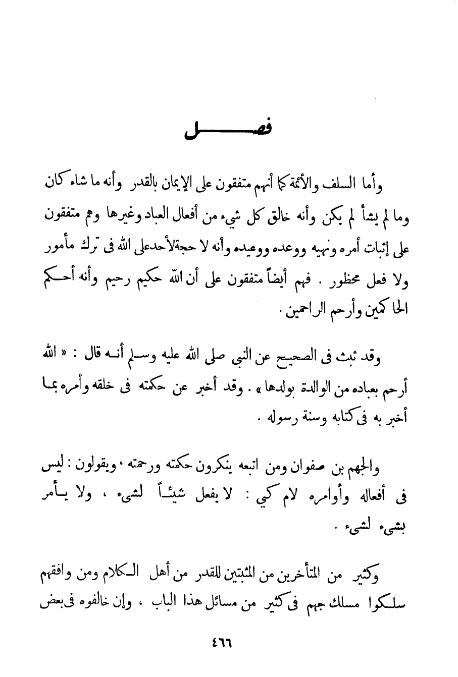 وَأَمَّا السَّلَفُ وَالْأَئِمَّةُ كَمَا أَنَّهُمْ مُتَّفِقُونَ عَلَى الْإِيمَانِ بِالْقَدَرِ وَأَنَّهُ مَا شَاءَ كَانَ وَمَا لَمْ يَشَأْ لَمْ يَكُنْ وَأَنَّهُ خَالِقُ كُلِّ شَيْءٍ مِنْ أَفْعَالِ الْعِبَادِ وَغَيْرِهَا وَهُمْ مُتَّفِقُونَ عَلَى إثْبَاتِ أَمْرِهِ وَنَهْيِهِ وَوَعْدِهِ وَوَعِيدِهِ وَأَنَّهُ لَا حُجَّةَ لِأَحَدِ عَلَى اللَّهِ فِي تَرْكِ مَأْمُورٍ وَلَا فِعْلِ مَحْظُورٍ. فَهُمْ أَيْضًا مُتَّفِقُونَ عَلَى أَنَّ اللَّهَ حَكِيمٌ رَحِيمٌ وَأَنَّهُ أَحْكَمُ الْحَاكِمِينَ وَأَرْحَمُ الرَّاحِمِينَ. وَقَدْ ثَبَتَ فِي الصَّحِيحِ عَنْ النَّبِيِّ صَلَّى اللَّهُ عَلَيْهِ وَسَلَّمَ أَنَّهُ قَالَ: {اللَّهُ أَرْحَمُ بِعِبَادِهِ مِنْ الْوَالِدَةِ بِوَلَدِهَا} . وَقَدْ أَخْبَرَ عَنْ حِكْمَتِهِ فِي خَلْقِهِ وَأَمْرِهِ بِمَا أَخْبَرَ بِهِ فِي كِتَابِهِ وَسُنَّةِ رَسُولِهِ. وَالْجَهْمُ بْنُ صَفْوَانَ وَمَنْ اتَّبَعَهُ يُنْكِرُونَ حِكْمَتَهُ وَرَحْمَتَهُ وَيَقُولُونَ: لَيْسَ فِي أَفْعَالِهِ وَأَوَامِرِهِ لَامُ كَيْ: لَا يَفْعَلُ شَيْئًا لِشَيْءِ وَلَا يَأْمُرُ بِشَيْءِ لِشَيْءِ. وَكَثِيرٌ مِنْ الْمُتَأَخِّرِينَ مِنْ الْمُثْبِتِينَ لِلْقَدَرِ مِنْ أَهْلِ الْكَلَامِ وَمَنْ وَافَقَهُمْ سَلَكُوا مَسْلَكَ جَهْمٍ فِي كَثِيرٍ مِنْ مَسَائِلِ هَذَا الْبَابِ وَإِنْ خَالَفُوهُ فِي بَعْضِ