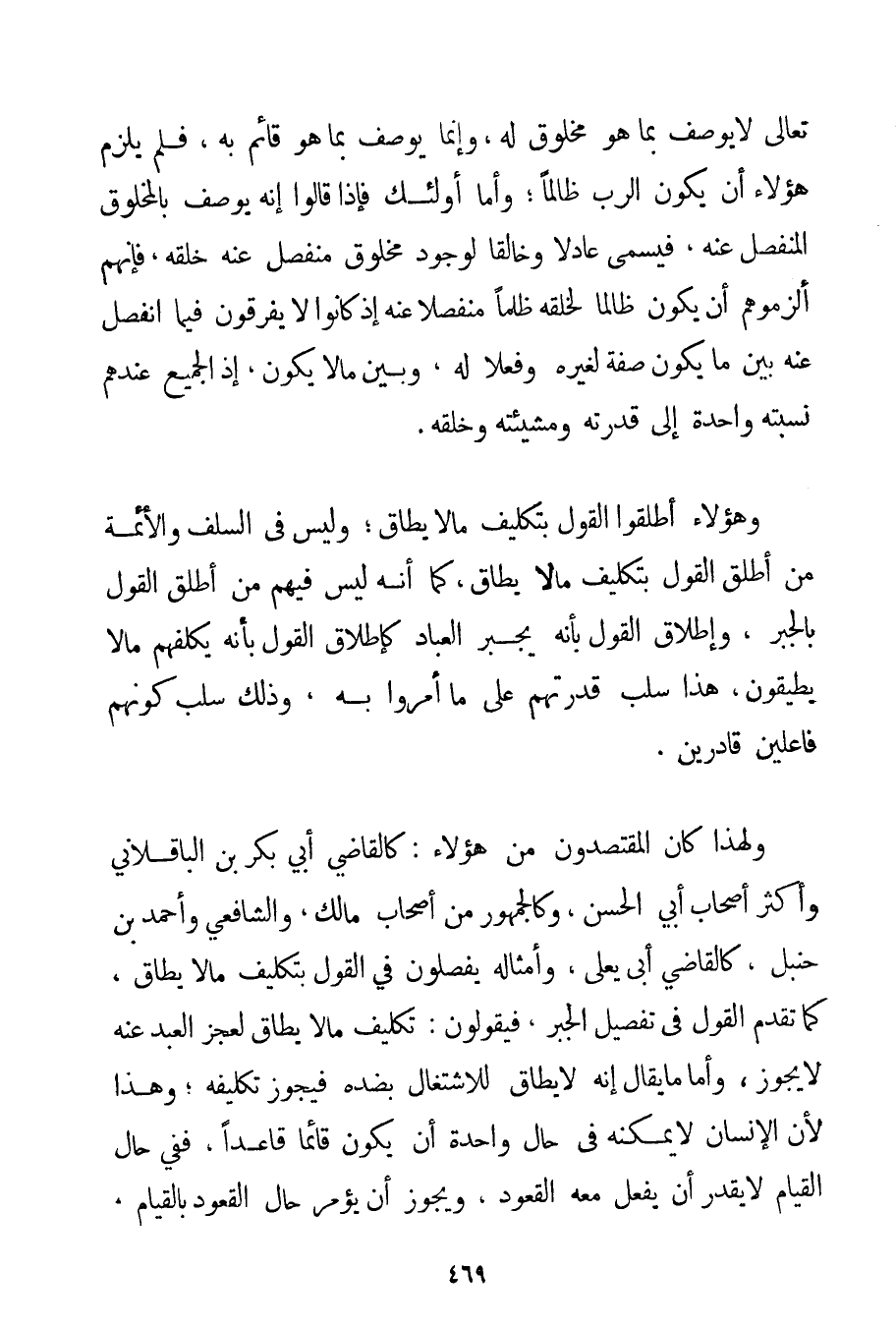 تَعَالَى لَا يُوصَفُ بِمَا هُوَ مَخْلُوقٌ لَهُ وَإِنَّمَا يُوصَفُ بِمَا هُوَ قَائِمٌ بِهِ فَلَمْ يَلْزَمْ هَؤُلَاءِ أَنْ يَكُونَ الرَّبُّ ظَالِمًا؛ وَأَمَّا أُولَئِكَ فَإِذَا قَالُوا إنَّهُ يُوصَفُ بِالْمَخْلُوقِ الْمُنْفَصِلِ عَنْهُ فَيُسَمَّى عَادِلًا وَخَالِقًا لِوُجُودِ مَخْلُوقٍ مُنْفَصِلٍ عَنْهُ خَلَقَهُ فَإِنَّهُمْ أَلْزَمُوهُمْ أَنْ يَكُونَ ظَالِمًا لِخَلْقِهِ ظُلْمًا مُنْفَصِلًا عَنْهُ إذْ كَانُوا لَا يُفَرِّقُونَ فِيمَا انْفَصَلَ عَنْهُ بَيْنَ مَا يَكُونُ صِفَةً لِغَيْرِهِ وَفِعْلًا لَهُ وَبَيْنَ مَا لَا يَكُونُ إذْ الْجَمِيعُ عِنْدَهُمْ نِسْبَتُهُ وَاحِدَةٌ إلَى قُدْرَتِهِ وَمَشِيئَتِهِ وَخَلْقِهِ. وَهَؤُلَاءِ أَطْلَقُوا الْقَوْلَ بِتَكْلِيفِ مَا لَا يُطَاقُ؛ وَلَيْسَ فِي السَّلَفِ وَالْأَئِمَّةِ مَنْ أَطْلَقَ الْقَوْلَ بِتَكْلِيفِ مَا لَا يُطَاقُ كَمَا أَنَّهُ لَيْسَ فِيهِمْ مَنْ أَطْلَقَ الْقَوْلَ بِالْجَبْرِ وَإِطْلَاقُ الْقَوْلِ بِأَنَّهُ يُجْبِرُ الْعِبَادَ كَإِطْلَاقِ الْقَوْلِ بِأَنَّهُ يُكَلِّفُهُمْ مَا لَا يُطِيقُونَ هَذَا سَلَبَ قُدْرَتَهُمْ عَلَى مَا أُمِرُوا بِهِ وَذَلِكَ سَلَبَ كَوْنَهُمْ فَاعِلِينَ قَادِرِينَ. وَلِهَذَا كَانَ الْمُقْتَصِدُونَ مِنْ هَؤُلَاءِ: كَالْقَاضِي أَبِي بَكْرِ بْنِ الْبَاقِلَانِي وَأَكْثَرِ أَصْحَابِ أَبِي الْحَسَنِ وَكَالْجُمْهُورِ مِنْ أَصْحَابِ مَالِكٍ وَالشَّافِعِيِّ وَأَحْمَد بْنِ حَنْبَلٍ كَالْقَاضِي أَبِي يَعْلَى وَأَمْثَالِهِ يُفَصِّلُونَ فِي الْقَوْلِ بِتَكْلِيفِ مَا لَا يُطَاقُ كَمَا تَقَدَّمَ الْقَوْلُ فِي تَفْصِيلِ الْجَبْرِ فَيَقُولُونَ: تَكْلِيفُ مَا لَا يُطَاقُ لِعَجْزِ الْعَبْدِ عَنْهُ لَا يَجُوزُ وَأَمَّا مَا يُقَالُ إنَّهُ لَا يُطَاقُ لِلِاشْتِغَالِ بِضِدِّهِ فَيَجُوزُ تَكْلِيفُهُ؛ وَهَذَا لِأَنَّ الْإِنْسَانَ لَا يُمْكِنُهُ فِي حَالٍ وَاحِدَةٍ أَنْ يَكُونَ قَائِمًا قَاعِدًا فَفِي حَالِ الْقِيَامِ لَا يَقْدِرُ أَنْ يَفْعَلَ مَعَهُ الْقُعُودَ وَيَجُوزَ أَنْ يُؤْمَرَ حَالَ الْقُعُودِ بِالْقِيَامِ