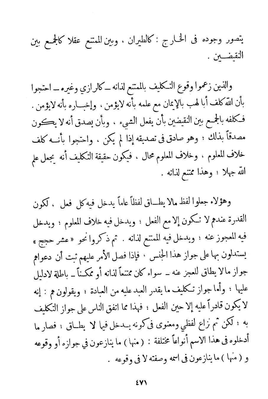 يُتَصَوَّرُ وُجُودُهُ فِي الْخَارِجِ: كَالطَّيَرَانِ وَبَيْنَ الْمُمْتَنِعِ عَقْلًا كَالْجَمْعِ بَيْنَ النَّقِيضَيْنِ. وَاَلَّذِينَ زَعَمُوا وُقُوعَ التَّكْلِيفِ بِالْمُمْتَنِعِ لِذَاتِهِ - كالرَّازِي وَغَيْرِهِ - احْتَجُّوا بِأَنَّ اللَّهَ كَلَّفَ أَبَا لَهَبٍ بِالْإِيمَانِ مَعَ عِلْمِهِ بِأَنَّهُ لَا يُؤْمِنُ وَإِخْبَارِهِ بِأَنَّهُ لَا يُؤْمِنُ. فَكَلَّفَهُ بِالْجَمْعِ بَيْنَ النَّقِيضَيْنِ بِأَنْ يَفْعَلَ الشَّيْءَ وَبِأَنْ يُصَدِّقَ أَنَّهُ لَا يَكُونُ مُصَدِّقًا بِذَلِكَ؛ وَهُوَ صَادِقٌ فِي تَصْدِيقِهِ إذَا لَمْ يَكُنْ وَاحْتَجُّوا بِأَنَّهُ كُلِّفَ خِلَافَ الْمَعْلُومِ وَخِلَافُ الْمَعْلُومِ مُحَالٌ فَيَكُونُ حَقِيقَةُ التَّكْلِيفِ أَنَّهُ يَجْعَلُ عِلْمَ اللَّهِ جَهْلًا؛ وَهَذَا مُمْتَنِعٌ لِذَاتِهِ. وَهَؤُلَاءِ جَعَلُوا لَفْظَ مَا لَا يُطَاقُ لَفْظًا عَامًّا يَدْخُلُ فِيهِ كُلُّ فِعْلٍ لِكَوْنِ الْقُدْرَةِ عِنْدَهُمْ لَا تَكُونُ إلَّا مَعَ الْفِعْلِ؛ وَيَدْخُلُ فِيهِ خِلَافُ الْمَعْلُومِ؛ وَيَدْخُلُ فِيهِ الْمَعْجُوزُ عَنْهُ؛ وَيَدْخُلُ فِيهِ الْمُمْتَنِعُ لِذَاتِهِ. ثُمَّ ذَكَرُوا نَحْوَ " عَشْرِ حُجَجٍ " يَسْتَدِلُّونَ بِهَا عَلَى جَوَازِ هَذَا الْجِنْسِ فَإِذَا فَصَّلَ الْأَمْرَ عَلَيْهِمْ ثَبَتَ أَنَّ دَعْوَاهُمْ جَوَازَ مَا لَا يُطَاقُ لِلْعَجْزِ عَنْهُ - سَوَاءٌ كَانَ مُمْتَنِعًا لِذَاتِهِ أَوْ مُمْكِنًا - بَاطِلَةٌ لَا دَلِيلَ عَلَيْهَا؛ وَأَمَّا جَوَازُ تَكْلِيفِ مَا يَقْدِرُ الْعَبْدُ عَلَيْهِ مِنْ الْعِبَادَةِ؛ وَيَقُولُونَ هُمْ: إنَّهُ لَا يَكُونُ قَادِرًا عَلَيْهِ إلَّا حِينَ الْفِعْلِ؛ فَهَذَا مِمَّا اتَّفَقَ النَّاسُ عَلَى جَوَازِ التَّكْلِيفِ بِهِ؛ لَكِنْ ثَمَّ نِزَاعٌ لَفْظِيٌّ وَمَعْنَوِيٌّ فِي كَوْنِهِ يَدْخُلُ فِيمَا لَا يُطَاقُ؛ فَصَارَ مَا أَدْخَلُوهُ فِي هَذَا الِاسْمِ أَنْوَاعًا مُخْتَلِفَةً: مِنْهَا مَا يُنَازِعُونَ فِي جَوَازِهِ أَوْ وُقُوعِهِ وَ (مِنْهَا مَا يُنَازِعُونَ فِي اسْمِهِ وَصِفَتِهِ لَا فِي وُقُوعِهِ.