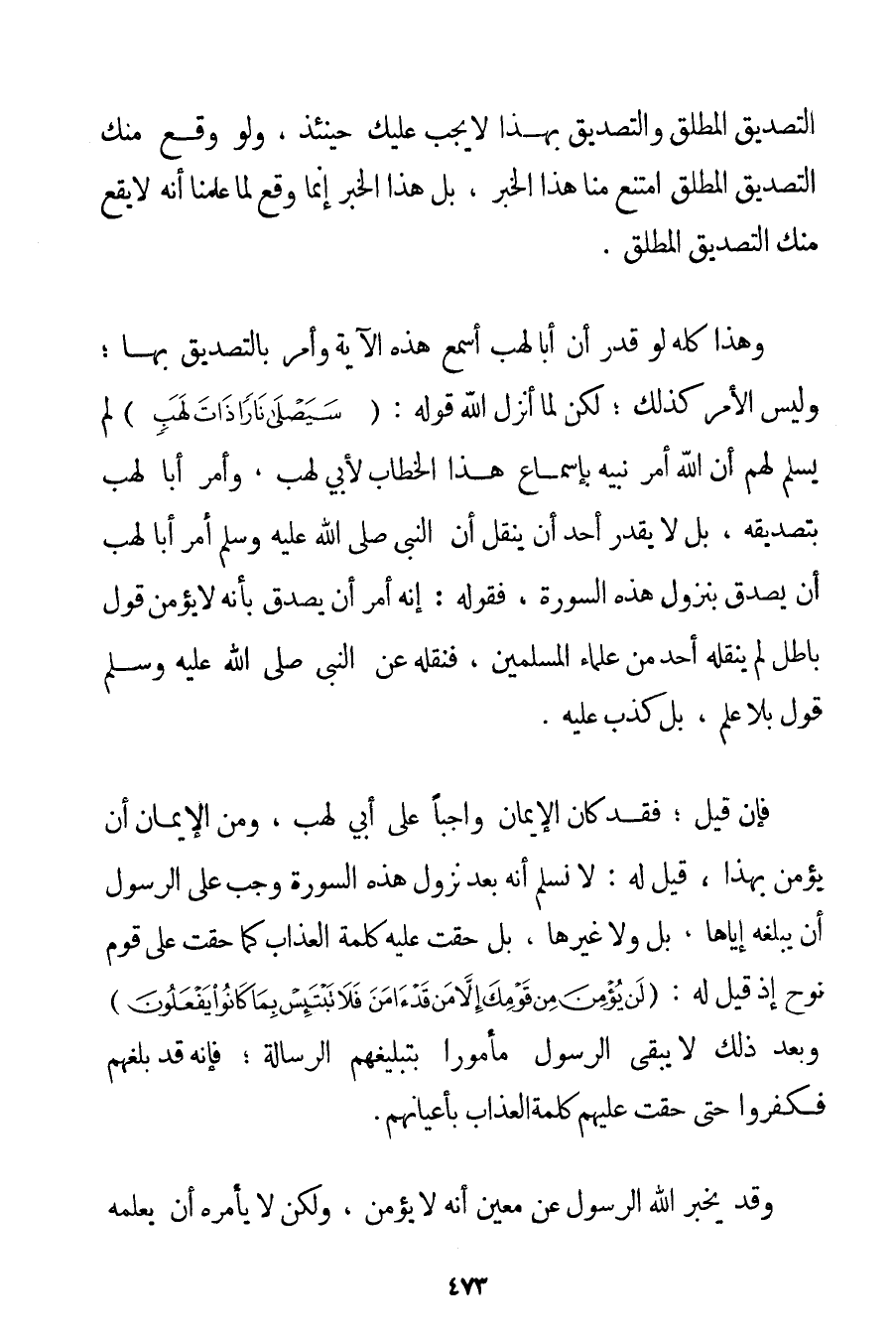 التَّصْدِيقُ الْمُطْلَقُ وَالتَّصْدِيقُ بِهَذَا لَا يَجِبُ عَلَيْكَ حِينَئِذٍ وَلَوْ وَقَعَ مِنْكَ التَّصْدِيقُ الْمُطْلَقُ امْتَنَعَ مِنَّا هَذَا الْخَبَرُ بَلْ هَذَا الْخَبَرُ إنَّمَا وَقَعَ لِمَا عَلِمْنَا أَنَّهُ لَا يَقَعُ مِنْكَ التَّصْدِيقُ الْمُطْلَقُ. وَهَذَا كُلُّهُ لَوْ قُدِّرَ أَنَّ أَبَا لَهَبٍ أُسْمِعَ هَذِهِ الْآيَةَ وَأُمِرَ بِالتَّصْدِيقِ بِهَا؛ وَلَيْسَ الْأَمْرُ كَذَلِكَ؛ لَكِنْ لَمَّا أَنْزَلَ اللَّهُ قَوْلَهُ: {سَيَصْلَى نَارًا ذَاتَ لَهَبٍ} لَمْ يَسْلَمْ لَهُمْ أَنَّ اللَّهَ أَمَرَ نَبِيَّهُ بِإِسْمَاعِ هَذَا الْخِطَابِ لِأَبِي لَهَبٍ وَأَمَرَ أَبَا لَهَبٍ بِتَصْدِيقِهِ بَلْ لَا يَقْدِرُ أَحَدٌ أَنْ يَنْقُلَ أَنَّ النَّبِيَّ صَلَّى اللَّهُ عَلَيْهِ وَسَلَّمَ أَمَرَ أَبَا لَهَبٍ أَنْ يُصَدِّقَ بِنُزُولِ هَذِهِ السُّورَةِ فَقَوْلُهُ: إنَّهُ أُمِرَ أَنْ يُصَدِّقَ بِأَنَّهُ لَا يُؤْمِنُ قَوْلٌ بَاطِلٌ لَمْ يَنْقُلْهُ أَحَدٌ مِنْ عُلَمَاءِ الْمُسْلِمِينَ فَنَقْلُهُ عَنْ النَّبِيِّ صَلَّى اللَّهُ عَلَيْهِ وَسَلَّمَ قَوْلٌ بِلَا عِلْمٍ بَلْ كَذِبٌ عَلَيْهِ. فَإِنْ قِيلَ؛ فَقَدْ كَانَ الْإِيمَانُ وَاجِبًا عَلَى أَبِي لَهَبٍ وَمِنْ الْإِيمَانِ أَنْ يُؤْمِنَ بِهَذَا قِيلَ لَهُ: لَا نُسَلِّمُ أَنَّهُ بَعْدَ نُزُولِ هَذِهِ السُّورَةِ وَجَبَ عَلَى الرَّسُولِ أَنْ يُبَلِّغَهُ إيَّاهَا بَلْ وَلَا غَيْرَهَا بَلْ حَقَّتْ عَلَيْهِ كَلِمَةُ الْعَذَابِ كَمَا حَقَّتْ عَلَى قَوْمِ نُوحٍ إذْ قِيلَ لَهُ: {لَنْ يُؤْمِنَ مِنْ قَوْمِكَ إلَّا مَنْ قَدْ آمَنَ فَلَا تَبْتَئِسْ بِمَا كَانُوا يَفْعَلُونَ} وَبَعْدَ ذَلِكَ لَا يَبْقَى الرَّسُولُ مَأْمُورًا بِتَبْلِيغِهِمْ الرِّسَالَةَ؛ فَإِنَّهُ قَدْ بَلَّغَهُمْ فَكَفَرُوا حَتَّى حَقَّتْ عَلَيْهِمْ كَلِمَةُ الْعَذَابِ بِأَعْيَانِهِمْ. وَقَدْ يُخْبِرُ اللَّهُ الرَّسُولَ عَنْ مُعَيَّنٍ أَنَّهُ لَا يُؤْمِنُ، وَلَكِنْ لَا يَأْمُرُهُ أَنْ يُعْلِمَهُ