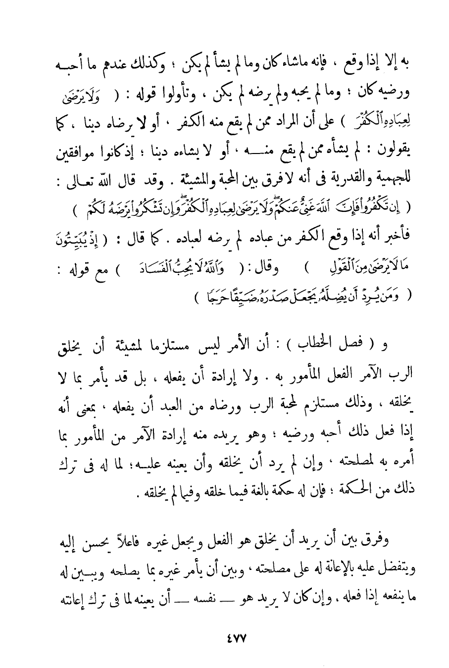 بِهِ إلَّا إذَا وَقَعَ فَإِنَّهُ مَا شَاءَ كَانَ وَمَا لَمْ يَشَأْ لَمْ يَكُنْ؛ وَكَذَلِكَ عِنْدَهُمْ مَا أَحَبَّهُ وَرَضِيَهُ كَانَ؛ وَمَا لَمْ يُحِبَّهُ وَلَمْ يَرْضَهُ لَمْ يَكُنْ وَتَأَوَّلُوا قَوْلَهُ: {وَلَا يَرْضَى لِعِبَادِهِ الْكُفْرَ} عَلَى أَنَّ الْمُرَادَ مِمَّنْ لَمْ يَقَعْ مِنْهُ الْكُفْرُ أَوْ لَا يَرْضَاهُ دِينًا كَمَا يَقُولُونَ: لَمْ يَشَأْهُ مِمَّنْ لَمْ يَقَعْ مِنْهُ أَوْ لَا يشاءه دِينًا؛ إذْ كَانُوا مُوَافِقِينَ للجهمية وَالْقَدَرِيَّةِ فِي أَنَّهُ لَا فَرْقَ بَيْنَ الْمَحَبَّةِ وَالْمَشِيئَةِ. وَقَدْ قَالَ اللَّهُ تَعَالَى: {إنْ تَكْفُرُوا فَإِنَّ اللَّهَ غَنِيٌّ عَنْكُمْ وَلَا يَرْضَى لِعِبَادِهِ الْكُفْرَ وَإِنْ تَشْكُرُوا يَرْضَهُ لَكُمْ} فَأَخْبَرَ أَنَّهُ إذَا وَقَعَ الْكُفْرُ مِنْ عِبَادِهِ لَمْ يَرْضَهُ لِعِبَادِهِ. كَمَا قَالَ: {إذْ يُبَيِّتُونَ مَا لَا يَرْضَى مِنَ الْقَوْلِ} وَقَالَ: {وَاللَّهُ لَا يُحِبُّ الْفَسَادَ} مَعَ قَوْلِهِ: {وَمَنْ يُرِدْ أَنْ يُضِلَّهُ يَجْعَلْ صَدْرَهُ ضَيِّقًا حَرَجًا} . وَ (فَصْلُ الْخِطَابِ: أَنَّ الْأَمْرَ لَيْسَ مُسْتَلْزِمًا لِمَشِيئَةِ أَنْ يَخْلُقَ الرَّبُّ الْآمِرُ الْفِعْلَ الْمَأْمُورَ بِهِ. وَلَا إرَادَةَ أَنْ يَفْعَلَهُ بَلْ قَدْ يَأْمُرُ بِمَا لَا يَخْلُقُهُ وَذَلِكَ مُسْتَلْزِمٌ لِمَحَبَّةِ الرَّبِّ وَرِضَاهُ مِنْ الْعَبْدِ أَنْ يَفْعَلَهُ بِمَعْنَى أَنَّهُ إذَا فَعَلَ ذَلِكَ أَحَبَّهُ وَرَضِيَهُ؛ وَهُوَ يُرِيدُهُ مِنْهُ إرَادَةَ الْآمِرِ مِنْ الْمَأْمُورِ بِمَا أَمَرَهُ بِهِ لِمَصْلَحَتِهِ وَإِنْ لَمْ يُرِدْ أَنْ يَخْلُقَهُ وَأَنْ يُعِينَهُ عَلَيْهِ؛ لِمَا لَهُ فِي تَرْكِ ذَلِكَ مِنْ الْحِكْمَةِ؛ فَإِنَّ لَهُ حِكْمَةً بَالِغَةً فِيمَا خَلَقَهُ وَفِيمَا لَمْ يَخْلُقْهُ. وَفَرْقٌ بَيْنَ أَنْ يُرِيدَ أَنْ يَخْلُقَ هُوَ الْفِعْلَ وَيَجْعَلَ غَيْرَهُ فَاعِلًا يُحْسِنُ إلَيْهِ وَيَتَفَضَّلُ عَلَيْهِ بِالْإِعَانَةِ لَهُ عَلَى مَصْلَحَتِهِ وَبَيْنَ أَنْ يَأْمُرَ غَيْرَهُ بِمَا يُصْلِحُهُ وَيُبَيِّنَ لَهُ مَا يَنْفَعُهُ إذَا فَعَلَهُ وَإِنْ كَانَ لَا يُرِيدُ هُوَ - نَفْسُهُ - أَنْ يُعِينَهُ لِمَا فِي تَرْكِ إعَانَتِهِ