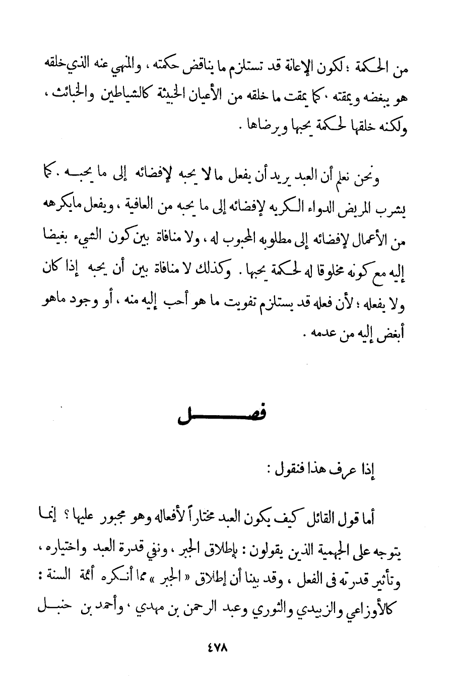 إذَا عُرِفَ هَذَا فَنَقُولُ: أَمَّا قَوْلُ الْقَائِلِ كَيْفَ يَكُونُ الْعَبْدُ مُخْتَارًا لِأَفْعَالِهِ وَهُوَ مَجْبُورٌ عَلَيْهَا؟ إنَّمَا يَتَوَجَّهُ عَلَى الْجَهْمِيَّة الَّذِينَ يَقُولُونَ: بِإِطْلَاقِ الْجَبْرِ وَنَفْيِ قُدْرَةِ الْعَبْدِ وَاخْتِيَارِهِ وَتَأْثِيرِ قُدْرَتِهِ فِي الْفِعْلِ وَقَدْ بَيَّنَّا أَنَّ إطْلَاقَ " الْجَبْرِ " مِمَّا أَنْكَرَهُ أَئِمَّةُ السُّنَّةِ: كالأوزاعي وَالزُّبَيْدِيِّ وَالثَّوْرِيِّ وَعَبْدِ الرَّحْمَنِ بْنِ مَهْدِيٍّ وَأَحْمَد بْنِ حَنْبَلٍ