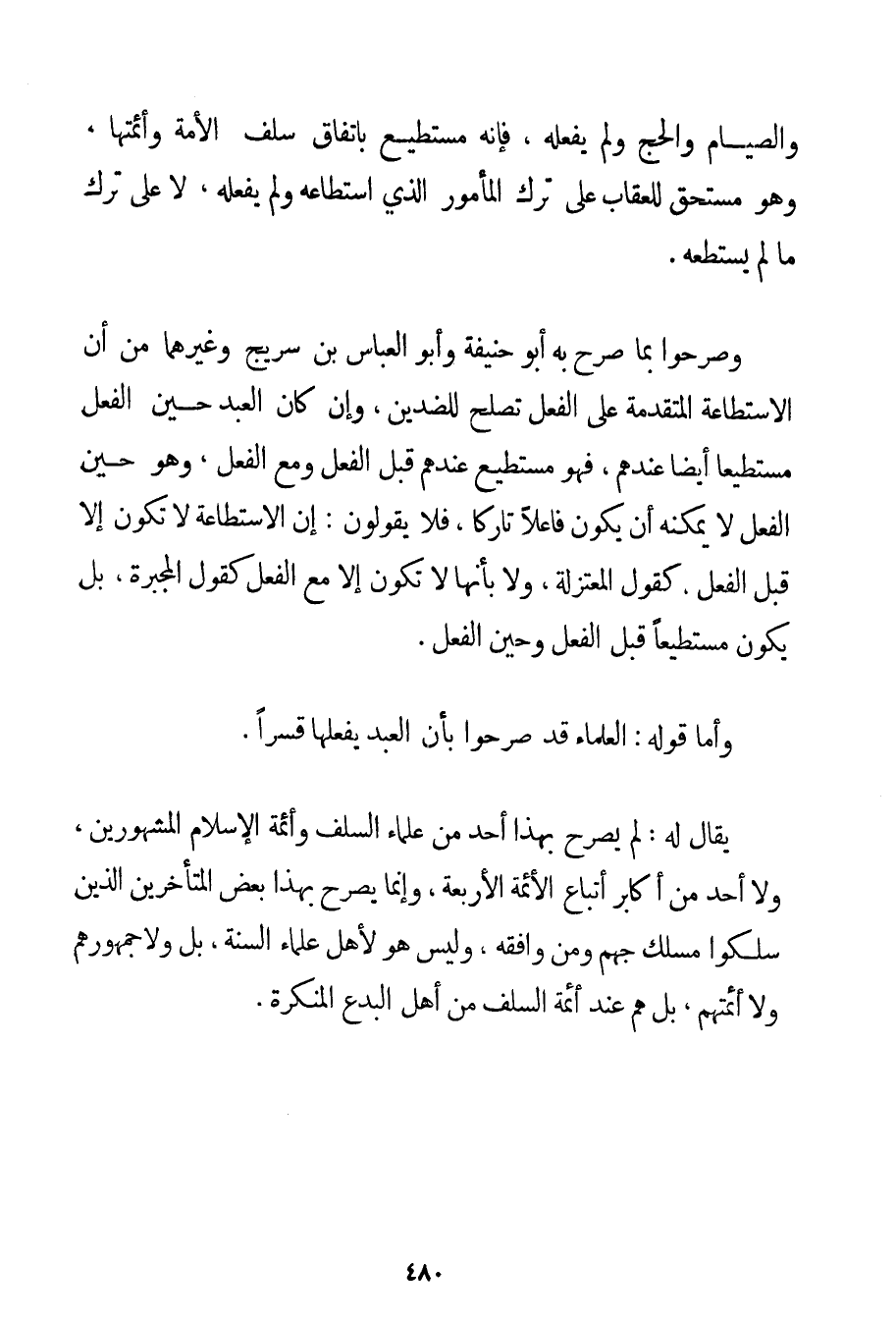 وَالصِّيَامِ وَالْحَجِّ وَلَمْ يَفْعَلْهُ فَإِنَّهُ مُسْتَطِيعٌ بِاتِّفَاقِ سَلَفِ الْأُمَّةِ وَأَئِمَّتِهَا وَهُوَ مُسْتَحِقٌّ لِلْعِقَابِ عَلَى تَرْكِ الْمَأْمُورِ الَّذِي اسْتَطَاعَهُ وَلَمْ يَفْعَلْهُ لَا عَلَى تَرْكِ مَا لَمْ يَسْتَطِعْهُ. وَصَرَّحُوا بِمَا صَرَّحَ بِهِ أَبُو حَنِيفَةَ وَأَبُو الْعَبَّاسِ ابْنُ سُرَيْجٍ وَغَيْرُهُمَا مِنْ أَنَّ الِاسْتِطَاعَةَ الْمُتَقَدِّمَةَ عَلَى الْفِعْلِ تَصْلُحُ لِلضِّدَّيْنِ وَإِنْ كَانَ الْعَبْدُ حِينَ الْفِعْلِ مُسْتَطِيعًا أَيْضًا عِنْدَهُمْ فَهُوَ مُسْتَطِيعٌ عِنْدَهُمْ قَبْلَ الْفِعْلِ وَمَعَ الْفِعْلِ وَهُوَ حِينَ الْفِعْلِ لَا يُمْكِنُهُ أَنْ يَكُونَ فَاعِلًا تَارِكًا فَلَا يَقُولُونَ: إنَّ الِاسْتِطَاعَةَ لَا تَكُونُ إلَّا قَبْلَ الْفِعْلِ، كَقَوْلِ الْمُعْتَزِلَةِ وَلَا بِأَنَّهَا لَا تَكُونُ إلَّا مَعَ الْفِعْلِ كَقَوْلِ الْمُجَبِّرَةِ بَلْ يَكُونُ مُسْتَطِيعًا قَبْلَ الْفِعْلِ وَحِينَ الْفِعْلِ. وَأَمَّا قَوْلُهُ: الْعُلَمَاءُ قَدْ صَرَّحُوا بِأَنَّ الْعَبْدَ يَفْعَلُهَا قَسْرًا. يُقَالُ لَهُ: لَمْ يُصَرِّحْ بِهَذَا أَحَدٌ مِنْ عُلَمَاءِ السَّلَفِ وَأَئِمَّةِ الْإِسْلَامِ الْمَشْهُورِينَ وَلَا أَحَدٌ مِنْ أَكَابِرِ أَتْبَاعِ الْأَئِمَّةِ الْأَرْبَعَةِ وَإِنَّمَا يُصَرِّحُ بِهَذَا بَعْضُ الْمُتَأَخِّرِينَ الَّذِينَ سَلَكُوا مَسْلَكَ جَهْمٍ وَمَنْ وَافَقَهُ وَلَيْسَ هُوَ لِأَهْلِ عُلَمَاءِ السُّنَّةِ بَلْ وَلَا جُمْهُورِهِمْ وَلَا أَئِمَّتِهِمْ بَلْ هُمْ عِنْدَ أَئِمَّةِ السَّلَفِ مِنْ أَهْلِ الْبِدَعِ الْمُنْكَرَةِ.