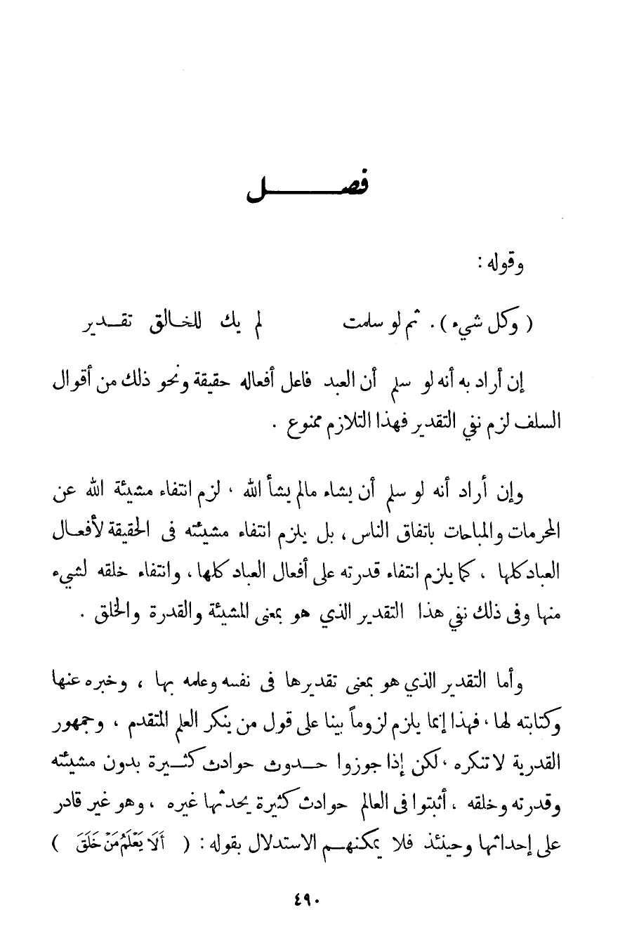 إنْ أَرَادَ بِهِ أَنَّهُ لَوْ سَلِمَ أَنَّ الْعَبْدَ فَاعِلٌ أَفْعَالَهُ حَقِيقَةً وَنَحْوَ ذَلِكَ مِنْ أَقْوَالِ السَّلَفِ لَزِمَ نَفْيُ التَّقْدِيرِ فَهَذَا التَّلَازُمُ مَمْنُوعٌ. وَإِنْ أَرَادَ أَنَّهُ لَوْ سَلِمَ أَنْ يَشَاءَ مَا لَمْ يَشَأْ اللَّهُ لَزِمَ انْتِفَاءُ مَشِيئَةِ اللَّهِ عَنْ الْمُحَرَّمَاتِ وَالْمُبَاحَاتِ بِاتِّفَاقِ النَّاسِ بَلْ يَلْزَمُ انْتِفَاءُ مَشِيئَتِهِ فِي الْحَقِيقَةِ لِأَفْعَالِ الْعِبَادِ كُلِّهَا كَمَا يَلْزَمُ انْتِفَاءُ قُدْرَتِهِ عَلَى أَفْعَالِ الْعِبَادِ كُلِّهَا وَانْتِفَاءُ خَلْقِهِ لِشَيْءِ مِنْهَا وَفِي ذَلِكَ نَفْيُ هَذَا التَّقْدِيرِ الَّذِي هُوَ بِمَعْنَى الْمَشِيئَةِ وَالْقُدْرَةِ وَالْخَلْقِ. وَأَمَّا التَّقْدِيرُ الَّذِي هُوَ بِمَعْنَى تَقْدِيرِهَا فِي نَفْسِهِ وَعِلْمِهِ بِهَا وَخَبَرِهِ عَنْهَا وَكِتَابَتِهِ لَهَا فَهَذَا إنَّمَا يَلْزَمُ لُزُومًا بَيِّنًا عَلَى قَوْلِ مَنْ يُنْكِرُ الْعِلْمَ الْمُتَقَدِّمَ وَجُمْهُورُ الْقَدَرِيَّةِ لَا تُنْكِرُهُ لَكِنْ إذَا جَوَّزُوا حُدُوثَ حَوَادِثَ كَثِيرَةٍ بِدُونِ مَشِيئَتِهِ وَقُدْرَتِهِ وَخَلْقِهِ أَثْبَتُوا فِي الْعَالَمِ حَوَادِثَ كَثِيرَةً يُحْدِثُهَا غَيْرُهُ وَهُوَ غَيْرُ قَادِرٍ عَلَى إحْدَاثِهَا وَحِينَئِذٍ فَلَا يُمْكِنُهُمْ الِاسْتِدْلَالُ بِقَوْلِهِ: {أَلَا يَعْلَمُ مَنْ خَلَقَ}