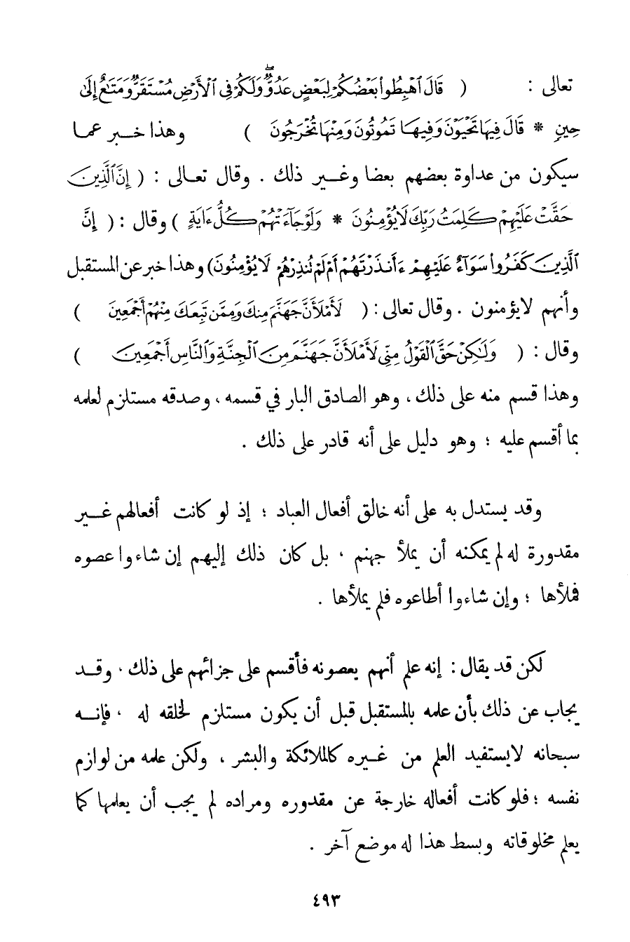وَقَالَ تَعَالَى: {قَالَ اهْبِطُوا بَعْضُكُمْ لِبَعْضٍ عَدُوٌّ وَلَكُمْ فِي الْأَرْضِ مُسْتَقَرٌّ وَمَتَاعٌ إلَى حِينٍ} {قَالَ فِيهَا تَحْيَوْنَ وَفِيهَا تَمُوتُونَ وَمِنْهَا تُخْرَجُونَ} وَهَذَا خَبَرٌ عَمَّا سَيَكُونُ مِنْ عَدَاوَةِ بَعْضِهِمْ بَعْضًا وَغَيْرِ ذَلِكَ. وَقَالَ تَعَالَى: {إنَّ الَّذِينَ حَقَّتْ عَلَيْهِمْ كَلِمَةُ رَبِّكَ لَا يُؤْمِنُونَ} {وَلَوْ جَاءَتْهُمْ كُلُّ آيَةٍ} وَقَالَ: {إنَّ الَّذِينَ كَفَرُوا سَوَاءٌ عَلَيْهِمْ أَأَنْذَرْتَهُمْ أَمْ لَمْ تُنْذِرْهُمْ لَا يُؤْمِنُونَ} وَهَذَا خَبَرٌ عَنْ الْمُسْتَقْبَلِ وَأَنَّهُمْ لَا يُؤْمِنُونَ. وَقَالَ تَعَالَى: {لَأَمْلَأَنَّ جَهَنَّمَ مِنْكَ وَمِمَّنْ تَبِعَكَ مِنْهُمْ أَجْمَعِينَ} وَقَالَ: {وَلَكِنْ حَقَّ الْقَوْلُ مِنِّي لَأَمْلَأَنَّ جَهَنَّمَ مِنَ الْجِنَّةِ وَالنَّاسِ أَجْمَعِينَ} وَهَذَا قَسَمٌ مِنْهُ عَلَى ذَلِكَ وَهُوَ الصَّادِقُ الْبَارُّ فِي قَسَمِهِ وَصِدْقُهُ مُسْتَلْزِمٌ لِعِلْمِهِ بِمَا أَقْسَمَ عَلَيْهِ؛ وَهُوَ دَلِيلٌ عَلَى أَنَّهُ قَادِرٌ عَلَى ذَلِكَ. وَقَدْ يُسْتَدَلُّ بِهِ عَلَى أَنَّهُ خَالِقُ أَفْعَالِ الْعِبَادِ؛ إذْ لَوْ كَانَتْ أَفْعَالُهُمْ غَيْرَ مَقْدُورَةٍ لَهُ لَمْ يُمْكِنْهُ أَنْ يَمْلَأَ جَهَنَّمَ بَلْ كَانَ ذَلِكَ إلَيْهِمْ إنْ شَاءُوا عَصَوْهُ فَمَلَأَهَا؛ وَإِنْ شَاءُوا أَطَاعُوهُ فَلَمْ يَمْلَأْهَا. لَكِنْ قَدْ يُقَالُ: إنَّهُ عَلِمَ أَنَّهُمْ يَعْصُونَهُ فَأَقْسَمَ عَلَى جَزَائِهِمْ عَلَى ذَلِكَ وَقَدْ يُجَابُ عَنْ ذَلِكَ بِأَنَّ عِلْمَهُ بِالْمُسْتَقْبَلِ قَبْلَ أَنْ يَكُونَ مُسْتَلْزِمٌ لِخَلْقِهِ لَهُ فَإِنَّهُ سُبْحَانَهُ لَا يَسْتَفِيدُ الْعِلْمَ مِنْ غَيْرِهِ كَالْمَلَائِكَةِ وَالْبَشَرِ وَلَكِنَّ عِلْمَهُ مِنْ لَوَازِمِ نَفْسِهِ؛ فَلَوْ كَانَتْ أَفْعَالُهُ خَارِجَةً عَنْ مَقْدُورِهِ وَمُرَادِهِ لَمْ يَجِبْ أَنْ يَعْلَمَهَا كَمَا يَعْلَمُ مَخْلُوقَاتُهُ وَبَسْطُ هَذَا لَهُ مَوْضِعٌ آخَرُ.