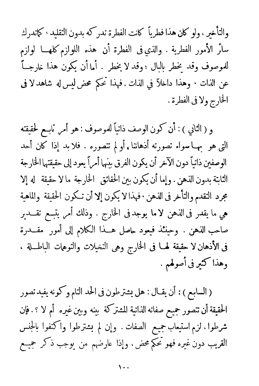 وَالتَّأْخِيرَ وَلَوْ كَانَ هَذَا فِطْرِيًّا كَانَتْ الْفِطْرَةُ تُدْرِكُهُ بِدُونِ التَّقْلِيدِ كَمَا تُدْرِكُ سَائِرَ الْأُمُورِ الْفِطْرِيَّةِ. وَاَلَّذِي فِي الْفِطْرَةِ أَنَّ هَذِهِ اللَّوَازِمَ كُلَّهَا لَوَازِمُ لِلْمَوْصُوفِ وَقَدْ يَخْطِرُ بِالْبَالِ؛ وَقَدْ لَا يَخْطِرُ. أَمَّا أَنْ يَكُونَ هَذَا خَارِجًا عَنْ الذَّاتِ وَهَذَا دَاخِلًا فِي الذَّاتِ. فَهَذَا تَحَكُّمٌ مَحْضٌ لَيْسَ لَهُ شَاهِدٌ لَا فِي الْخَارِجِ وَلَا فِي الْفِطْرَةِ.