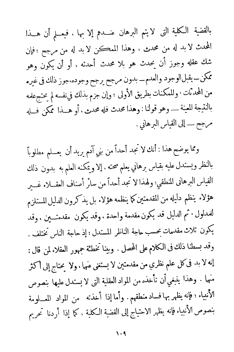 بِالْقَضِيَّةِ الْكُلِّيَّةِ الَّتِي لَا يَتِمُّ الْبُرْهَانُ عِنْدَهُمْ إلَّا بِهَا فَيُعْلَمُ أَنَّ هَذَا الْحَدَثَ لَا بُدَّ لَهُ مِنْ مُحْدِثٍ وَهَذَا الْمُمْكِنُ لَا بُدَّ لَهُ مِنْ مُرَجِّحٍ؛ فَإِنْ شَكَّ عَقْلُهُ وَجَوَّزَ أَنْ يُحْدِثَ هُوَ بِلَا مُحْدَثٍ أَحْدَثَهُ أَوْ أَنْ يَكُونَ وَهُوَ مُمْكِنٌ - يَقْبَلُ الْوُجُودَ وَالْعَدَمَ - بِدُونِ مُرَجِّحٍ يُرَجِّحُ وُجُودَهُ جُوِّزَ ذَلِكَ فِي غَيْرِهِ مِنْ الْمُحْدَثَاتِ وَالْمُمْكِنَاتِ بِطَرِيقِ الْأَوْلَى؛ وَإِنْ جَزَمَ بِذَلِكَ فِي نَفْسِهِ لَمْ يَحْتَجْ عِلْمُهُ بِالنَّتِيجَةِ الْمُعَيَّنَةِ - وَهُوَ قَوْلُنَا: وَهَذَا مُحْدَثٌ فَلَهُ مُحْدِثٌ أَوْ هَذَا مُمْكِنٌ فَلَهُ مُرَجِّحٌ - إلَى الْقِيَاسِ الْبُرْهَانِيِّ. وَمِمَّا يُوضِحُ هَذَا: أَنَّك لَا تَجِدُ أَحَدًا مِنْ بَنِي آدَمَ يُرِيدُ أَنْ يَعْلَمَ مَطْلُوبًا بِالنَّظَرِ وَيَسْتَدِلَّ عَلَيْهِ بِقِيَاسِ بُرْهَانِيٍّ يَعْلَمُ صِحَّتَهُ إلَّا وَيُمْكِنُهُ الْعِلْمُ بِهِ بِدُونِ ذَلِكَ الْقِيَاسِ الْبُرْهَانِيِّ الْمَنْطِقِيِّ؛ وَلِهَذَا لَا تَجِدُ أَحَدًا مِنْ سَائِرِ أَصْنَافِ الْعُقَلَاءِ غَيْرَ هَؤُلَاءِ يَنْظِمُ دَلِيلَهُ مِنْ الْمُقَدِّمَتَيْنِ كَمَا يَنْظِمُهُ هَؤُلَاءِ بَلْ يَذْكُرُونَ الدَّلِيلَ الْمُسْتَلْزِمَ لِلْمَدْلُولِ ثُمَّ الدَّلِيلُ قَدْ يَكُونُ مُقَدِّمَةً وَاحِدَةً وَقَدْ يَكُونُ مُقَدِّمَتَيْنِ وَقَدْ يَكُونُ ثَلَاثَ مُقَدِّمَاتٍ بِحَسَبِ حَاجَةِ النَّاظِرِ الْمُسْتَدِلِّ؛ إذْ حَاجَةُ النَّاسِ تَخْتَلِفُ. وَقَدْ بَسَطْنَا ذَلِكَ فِي الْكَلَامِ عَلَى الْمُحَصِّلِ. وَبَيَّنَّا تَخْطِئَةَ جُمْهُورِ الْعُقَلَاءِ لِمَنْ قَالَ: إنَّهُ لَا بُدَّ فِي كُلِّ عِلْمٍ نَظَرِيٍّ مِنْ مُقَدِّمَتَيْنِ لَا يُسْتَغْنَى عَنْهُمَا وَلَا يُحْتَاجُ إلَى أَكْثَرَ مِنْهُمَا. وَهَذَا يَنْبَغِي أَنْ تَأْخُذَهُ مِنْ الْمَوَادِّ الْعَقْلِيَّةِ الَّتِي لَا يُسْتَدَلُّ عَلَيْهَا بِنُصُوصِ الْأَنْبِيَاءِ؛ فَإِنَّهُ يَظْهَرُ بِهَا فَسَادُ مَنْطِقِهِمْ. وَأَمَّا إذَا أَخَذْته مِنْ الْمَوَادِّ الْمَعْلُومَةِ بِنُصُوصِ الْأَنْبِيَاءِ فَإِنَّهُ يَظْهَرُ الِاحْتِيَاجُ إلَى الْقَضِيَّةِ الْكُلِّيَّةِ كَمَا إذَا أَرَدْنَا تَحْرِيمَ
