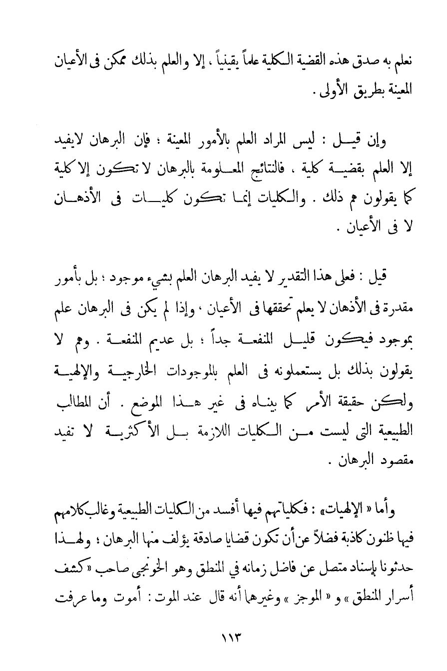 نَعْلَمُ بِهِ صِدْقَ هَذِهِ الْقَضِيَّةِ الْكُلِّيَّةِ عِلْمًا يَقِينِيًّا إلَّا وَالْعِلْمُ بِذَلِكَ مُمْكِنٌ فِي الْأَعْيَانِ الْمُعَيَّنَةِ بِطَرِيقِ الْأَوْلَى. وَإِنْ قِيلَ: لَيْسَ الْمُرَادُ الْعِلْمَ بِالْأُمُورِ الْمُعَيَّنَةِ؛ فَإِنَّ الْبُرْهَانَ لَا يُفِيدُ إلَّا الْعِلْمَ بِقَضِيَّةِ كُلِّيَّةٍ فَالنَّتَائِجُ الْمَعْلُومَةُ بِالْبُرْهَانِ لَا تَكُونُ إلَّا كُلِّيَّةً كَمَا يَقُولُونَ هُمْ ذَلِكَ. وَالْكُلِّيَّاتُ إنَّمَا تَكُونُ كُلِّيَّاتٍ فِي الْأَذْهَانِ لَا فِي الْأَعْيَانِ. قِيلَ: فَعَلَى هَذَا التَّقْدِيرِ لَا يُفِيدُ الْبُرْهَانُ الْعِلْمَ بِشَيْءِ مَوْجُودٍ؛ بَلْ بِأُمُورِ مُقَدَّرَةٍ فِي الْأَذْهَانِ لَا يُعْلَمُ تَحَقُّقُهَا فِي الْأَعْيَانِ وَإِذَا لَمْ يَكُنْ فِي الْبُرْهَانِ عِلْمٌ بِمَوْجُودِ فَيَكُونُ قَلِيلَ الْمَنْفَعَةِ جِدًّا؛ بَلْ عَدِيمَ الْمَنْفَعَةِ. وَهُمْ لَا يَقُولُونَ بِذَلِكَ بَلْ يَسْتَعْمِلُونَهُ فِي الْعِلْمِ بِالْمَوْجُودَاتِ الْخَارِجِيَّةِ وَالْإِلَهِيَّةِ وَلَكِنَّ حَقِيقَةَ الْأَمْرِ كَمَا بَيَّنَّاهُ فِي غَيْرِ هَذَا الْمَوْضِعِ. أَنَّ الْمَطَالِبَ الطَّبِيعِيَّةَ الَّتِي لَيْسَتْ مِنْ الْكُلِّيَّاتِ اللَّازِمَةِ بَلْ الْأَكْثَرِيَّةِ فَلَا تُفِيدُ مَقْصُودَ الْبُرْهَانِ.