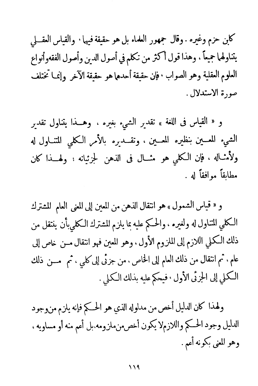 كَابْنِ حَزْمٍ وَغَيْرِهِ. وَقَالَ جُمْهُورُ الْعُلَمَاءِ بَلْ هُوَ حَقِيقَةٌ فِيهِمَا وَالْقِيَاسُ الْعَقْلِيُّ يَتَنَاوَلُهُمَا جَمِيعًا وَهَذَا قَوْلُ أَكْثَرِ مَنْ تَكَلَّمَ فِي أُصُولِ الدِّينِ وَأُصُولِ الْفِقْهِ وَأَنْوَاعِ الْعُلُومِ الْعَقْلِيَّةِ وَهُوَ الصَّوَابُ فَإِنَّ حَقِيقَةَ أَحَدِهِمَا هُوَ حَقِيقَةُ الْآخَرِ وَإِنَّمَا تَخْتَلِفُ صُورَةُ الِاسْتِدْلَالِ. وَ " الْقِيَاسُ فِي اللُّغَةِ " تَقْدِيرُ الشَّيْءِ بِغَيْرِهِ وَهَذَا يَتَنَاوَلُ تَقْدِيرَ الشَّيْءِ الْمُعَيَّنِ بِنَظِيرِهِ الْمُعَيَّنِ وَتَقْدِيرَهُ بِالْأَمْرِ الْكُلِّيِّ الْمُتَنَاوِلِ لَهُ وَلِأَمْثَالِهِ فَإِنَّ الْكُلِّيَّ هُوَ مِثَالٌ فِي الذِّهْنِ لِجُزْئِيَّاتِهِ؛ وَلِهَذَا كَانَ مُطَابِقًا مُوَافِقًا لَهُ. وَ " قِيَاسُ الشُّمُولِ " هُوَ انْتِقَالُ الذِّهْنِ مِنْ الْمُعَيَّنِ إلَى الْمَعْنَى الْعَامِّ الْمُشْتَرَكِ الْكُلِّيِّ الْمُتَنَاوِلِ لَهُ وَلِغَيْرِهِ وَالْحُكْمُ عَلَيْهِ بِمَا يَلْزَمُ الْمُشْتَرَكَ الْكُلِّيَّ بِأَنْ يَنْتَقِلَ مِنْ ذَلِكَ الْكُلِّيِّ اللَّازِمِ إلَى الْمَلْزُومِ الْأَوَّلِ وَهُوَ الْمُعَيَّنُ فَهُوَ انْتِقَالٌ مِنْ خَاصٍّ إلَى عَامٍّ ثُمَّ انْتِقَالٌ مِنْ ذَلِكَ الْعَامِّ إلَى الْخَاصِّ مِنْ جُزْئِيٍّ إلَى كُلِّيٍّ ثُمَّ مِنْ ذَلِكَ الْكُلِّيِّ إلَى الْجُزْئِيِّ الْأَوَّلِ فَيُحْكَمُ عَلَيْهِ بِذَلِكَ الْكُلِّيِّ. وَلِهَذَا كَانَ الدَّلِيلُ أَخَصَّ مِنْ مَدْلُولِهِ الَّذِي هُوَ الْحُكْمُ فَإِنَّهُ يَلْزَمُ مِنْ وُجُودِ الدَّلِيلِ وُجُودُ الْحُكْمِ وَاللَّازِمُ لَا يَكُونُ أَخَصَّ مِنْ مَلْزُومِهِ بَلْ أَعَمَّ مِنْهُ أَوْ مُسَاوِيهِ وَهُوَ الْمُعْنَى بِكَوْنِهِ أَعَمَّ.