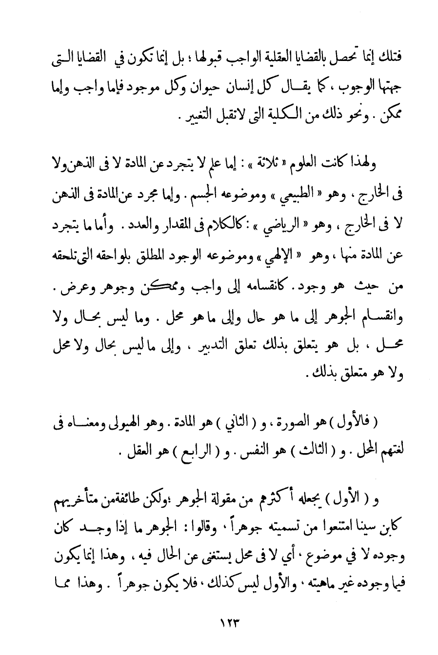 فَتِلْكَ إنَّمَا تَحْصُلُ بِالْقَضَايَا الْعَقْلِيَّةِ الْوَاجِبِ قَبُولُهَا؛ بَلْ إنَّمَا تَكُونُ فِي الْقَضَايَا الَّتِي جِهَتُهَا الْوُجُوبُ كَمَا يُقَالُ كُلُّ إنْسَانٍ حَيَوَانٌ وَكُلُّ مَوْجُودٍ فَإِمَّا وَاجِبٌ وَإِمَّا مُمْكِنٌ. وَنَحْوَ ذَلِكَ مِنْ الْكُلِّيَّةِ الَّتِي لَا تَقْبَلُ التَّغْيِيرَ. وَلِهَذَا كَانَتْ الْعُلُومُ " ثَلَاثَةً ": إمَّا عِلْمٌ لَا يَتَجَرَّدُ عَنْ الْمَادَّةِ لَا فِي الذِّهْنِ وَلَا فِي الْخَارِجِ وَهُوَ " الطَّبِيعِيُّ " وَمَوْضُوعُهُ الْجِسْمُ. وَإِمَّا مُجَرَّدٌ عَنْ الْمَادَّةِ فِي الذِّهْنِ لَا فِي الْخَارِجِ وَهُوَ " الرِّيَاضِيُّ ": كَالْكَلَامِ فِي الْمِقْدَارِ وَالْعَدَدِ. وَأَمَّا مَا يَتَجَرَّدُ عَنْ الْمَادَّةِ مِنْهَا وَهُوَ " الْإِلَهِيُّ " وَمَوْضُوعُهُ الْوُجُودُ الْمُطْلَقُ بِلَوَاحِقِهِ الَّتِي تَلْحَقُهُ مِنْ حَيْثُ هُوَ وُجُودٌ. كَانْقِسَامِهِ إلَى وَاجِبٍ وَمُمْكِنٍ وَجَوْهَرٍ وَعَرَضٍ. وَانْقَسَمَ الْجَوْهَرُ إلَى مَا هُوَ حَالٌّ وَإِلَى مَا هُوَ مَحَلٌّ. وَمَا لَيْسَ بِحَالِّ وَلَا مَحَلٍّ بَلْ هُوَ يَتَعَلَّقُ بِذَلِكَ تَعَلُّقَ التَّدْبِيرِ وَإِلَى مَا لَيْسَ بِحَالِّ وَلَا مَحَلٍّ وَلَا هُوَ مُتَعَلِّقٌ بِذَلِكَ. (فَالْأَوَّلُ هُوَ الصُّورَةُ وَ (الثَّانِي هُوَ الْمَادَّةُ. وَهُوَ الْهَيُولَى وَمَعْنَاهُ فِي لُغَتِهِمْ الْمَحَلُّ. وَ (الثَّالِثُ هُوَ النَّفْسُ. وَ (الرَّابِعُ هُوَ الْعَقْلُ. وَ (الْأَوَّلُ يَجْعَلُهُ أَكْثَرُهُمْ مِنْ مَقُولَةِ الْجَوْهَرِ؛ وَلَكِنَّ طَائِفَةً مِنْ مُتَأَخِّرِيهِمْ كَابْنِ سِينَا امْتَنَعُوا مِنْ تَسْمِيَتِهِ جَوْهَرًا وَقَالُوا: الْجَوْهَرُ مَا إذَا وُجِدَ كَانَ وُجُودُهُ لَا فِي مَوْضُوعٍ أَيْ لَا فِي مَحَلٍّ يَسْتَغْنِي عَنْ الْحَالِّ فِيهِ وَهَذَا إنَّمَا يَكُونُ فِيمَا وُجُودُهُ غَيْرُ مَاهِيَّتِهِ وَالْأَوَّلُ لَيْسَ كَذَلِكَ فَلَا يَكُونُ جَوْهَرًا. وَهَذَا مِمَّا