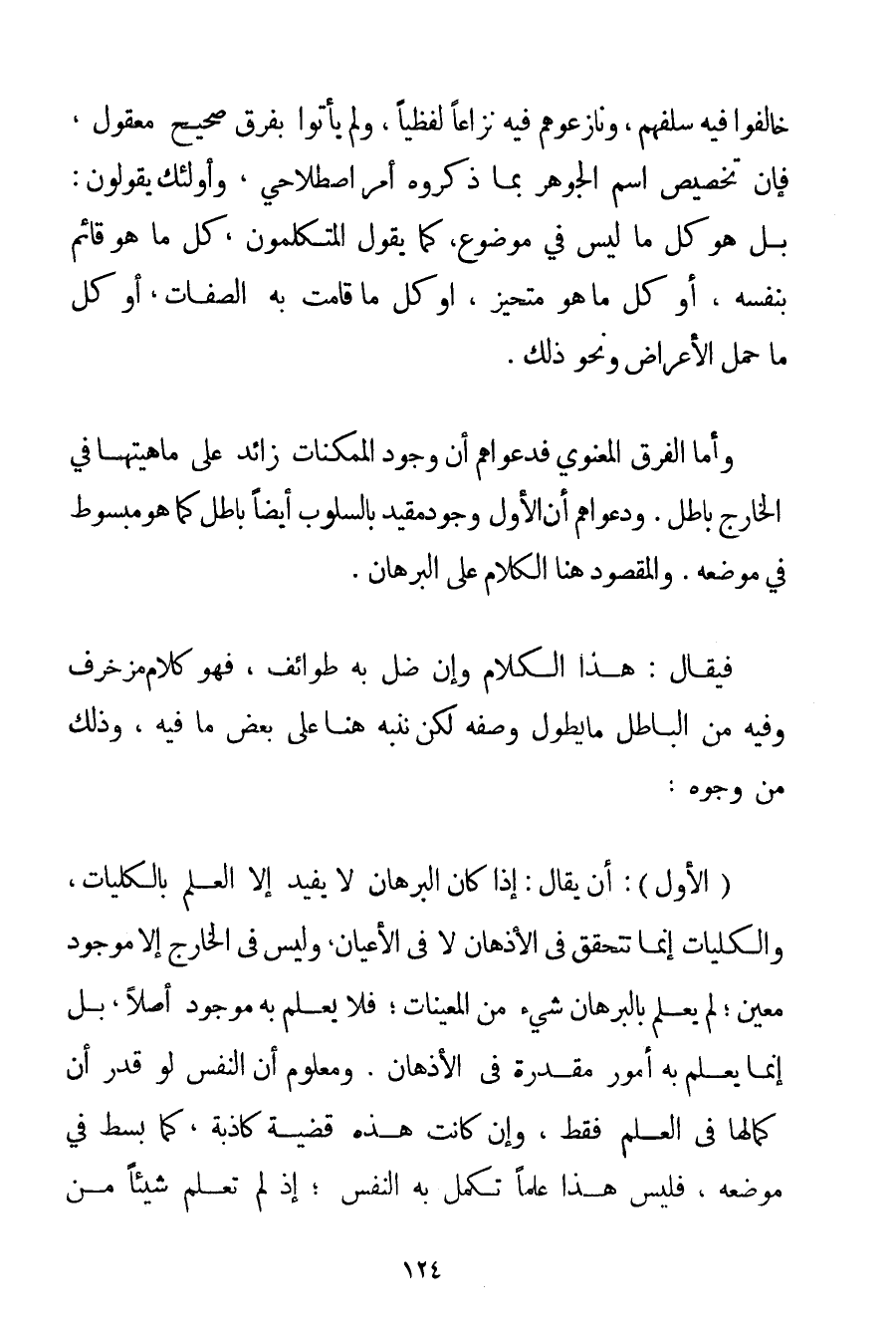 خَالَفُوا فِيهِ سَلَفَهُمْ وَنَازَعُوهُمْ فِيهِ نِزَاعًا لَفْظِيًّا وَلَمْ يَأْتُوا بِفَرْقِ صَحِيحٍ مَعْقُولٍ فَإِنَّ تَخْصِيصَ اسْمِ الْجَوْهَرِ بِمَا ذَكَرُوهُ أَمْرٌ اصْطِلَاحِيٌّ وَأُولَئِكَ يَقُولُونَ: بَلْ هُوَ كُلُّ مَا لَيْسَ فِي مَوْضُوعٍ كَمَا يَقُولُ الْمُتَكَلِّمُونَ كُلُّ مَا هُوَ قَائِمٌ بِنَفْسِهِ أَوْ كُلُّ مَا هُوَ مُتَحَيِّزٌ أَوْ كُلُّ مَا قَامَتْ بِهِ الصِّفَاتُ أَوْ كُلُّ مَا حَمَلَ الْأَعْرَاضَ وَنَحْوَ ذَلِكَ. وَأَمَّا الْفَرْقُ الْمَعْنَوِيُّ فَدَعْوَاهُمْ أَنَّ وُجُودَ الْمُمْكِنَاتِ زَائِدٌ عَلَى مَاهِيَّتِهَا فِي الْخَارِجِ بَاطِلٌ. وَدَعْوَاهُمْ أَنَّ الْأَوَّلَ وُجُودٌ مُقَيَّدٌ بِالسُّلُوبِ أَيْضًا بَاطِلٌ كَمَا هُوَ مَبْسُوطٌ فِي مَوْضِعِهِ. وَالْمَقْصُودُ هُنَا الْكَلَامُ عَلَى الْبُرْهَانِ. فَيُقَالُ: هَذَا الْكَلَامُ وَإِنْ ضَلَّ بِهِ طَوَائِفُ فَهُوَ كَلَامٌ مُزَخْرَفٌ وَفِيهِ مِنْ الْبَاطِلِ مَا يَطُولُ وَصْفُهُ لَكِنْ نُنَبِّهُ هُنَا عَلَى بَعْضِ مَا فِيهِ وَذَلِكَ مِنْ وُجُوهٍ: (الْأَوَّلُ: أَنْ يُقَالَ: إذَا كَانَ الْبُرْهَانُ لَا يُفِيدُ إلَّا الْعِلْمَ بِالْكُلِّيَّاتِ وَالْكُلِّيَّاتُ إنَّمَا تَتَحَقَّقُ فِي الْأَذْهَانِ لَا فِي الْأَعْيَانِ وَلَيْسَ فِي الْخَارِجِ إلَّا مَوْجُودٌ مُعَيَّنٌ؛ لَمْ يُعْلَمْ بِالْبُرْهَانِ شَيْءٌ مِنْ الْمُعَيَّنَاتِ؛ فَلَا يُعْلَمُ بِهِ مَوْجُودٌ أَصْلًا بَلْ إنَّمَا يُعْلَمُ بِهِ أُمُورٌ مُقَدَّرَةٌ فِي الْأَذْهَانِ. وَمَعْلُومٌ أَنَّ النَّفْسَ لَوْ قُدِّرَ أَنَّ كَمَالَهَا فِي الْعِلْمِ فَقَطْ وَإِنْ كَانَتْ هَذِهِ قَضِيَّةً كَاذِبَةً كَمَا بُسِطَ فِي مَوْضِعِهِ فَلَيْسَ هَذَا عِلْمًا تَكْمُلُ بِهِ النَّفْسُ؛ إذْ لَمْ تَعْلَمْ شَيْئًا مِنْ