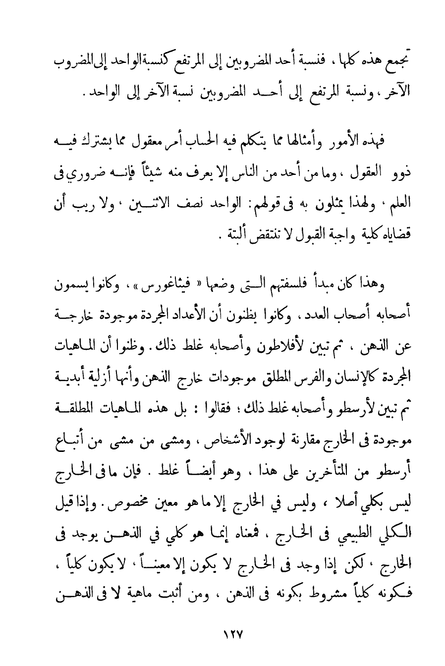 وَهَذَا كَانَ مَبْدَأَ فَلْسَفَتِهِمْ الَّتِي وَضَعَهَا " فيثاغورس " وَكَانُوا يُسَمُّونَ أَصْحَابَهُ أَصْحَابَ الْعَدَدِ وَكَانُوا يَظُنُّونَ أَنَّ الْأَعْدَادَ الْمُجَرَّدَةَ مَوْجُودَةٌ خَارِجَةٌ عَنْ الذِّهْنِ ثُمَّ تَبَيَّنَ لِأَفْلَاطُونَ وَأَصْحَابِهِ غَلَطُ ذَلِكَ. وَظَنُّوا أَنَّ الْمَاهِيَّاتِ الْمُجَرَّدَةَ كَالْإِنْسَانِ وَالْفَرَسِ الْمُطْلَقِ مَوْجُودَاتٌ خَارِجَ الذِّهْنِ وَأَنَّهَا أَزَلِيَّةٌ أَبَدِيَّةٌ ثُمَّ تَبَيَّنَ لِأَرِسْطُو وَأَصْحَابِهِ غَلَطُ ذَلِكَ؛ فَقَالُوا: بَلْ هَذِهِ الْمَاهِيَّاتُ الْمُطْلَقَةُ مَوْجُودَةٌ فِي الْخَارِجِ مُقَارِنَةٌ لِوُجُودِ الْأَشْخَاصِ وَمَشَى مَنْ مَشَى مِنْ أَتْبَاعِ أَرِسْطُو مِنْ الْمُتَأَخِّرِينَ عَلَى هَذَا وَهُوَ أَيْضًا غَلَطٌ. فَإِنَّ مَا فِي الْخَارِجِ لَيْسَ بِكُلِّيٍّ أَصْلًا وَلَيْسَ فِي الْخَارِجِ إلَّا مَا هُوَ مُعَيَّنٌ مَخْصُوصٌ. وَإِذَا قِيلَ الْكُلِّيُّ الطَّبِيعِيُّ فِي الْخَارِجِ فَمَعْنَاهُ إنَّمَا هُوَ كُلِّيٌّ فِي الذِّهْنِ يُوجَدُ فِي الْخَارِجِ لَكِنْ إذَا وُجِدَ فِي الْخَارِجِ لَا يَكُونُ إلَّا مُعَيَّنًا لَا يَكُونُ كُلِّيًّا فَكَوْنُهُ كُلِّيًّا مَشْرُوطٌ بِكَوْنِهِ فِي الذِّهْنِ وَمَنْ أَثْبَتَ مَاهِيَّةً لَا فِي الذِّهْنِ