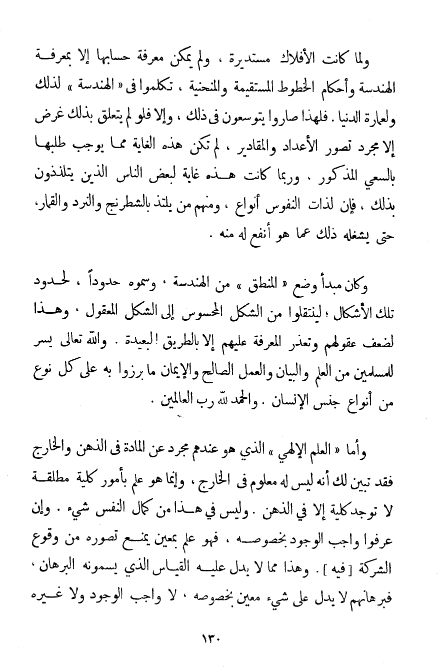 وَلَمَّا كَانَتْ الْأَفْلَاكُ مُسْتَدِيرَةً وَلَمْ يُمْكِنْ مَعْرِفَةُ حِسَابِهَا إلَّا بِمَعْرِفَةِ الْهَنْدَسَةِ وَأَحْكَامِ الْخُطُوطِ الْمُسْتَقِيمَةِ وَالْمُنْحَنِيَةِ تَكَلَّمُوا فِي " الْهَنْدَسَةِ " لِذَلِكَ وَلِعِمَارَةِ الدُّنْيَا. فَلِهَذَا صَارُوا يَتَوَسَّعُونَ فِي ذَلِكَ وَإِلَّا فَلَوْ لَمْ يَتَعَلَّقْ بِذَلِكَ غَرَضٌ إلَّا مُجَرَّدُ تَصَوُّرِ الْأَعْدَادِ وَالْمَقَادِيرِ لَمْ تَكُنْ هَذِهِ الْغَايَةُ مِمَّا يُوجَبُ طَلَبُهَا بِالسَّعْيِ الْمَذْكُورِ وَرُبَّمَا كَانَتْ هَذِهِ غَايَةً لِبَعْضِ النَّاسِ الَّذِينَ يَتَلَذَّذُونَ بِذَلِكَ فَإِنَّ لَذَّاتِ النُّفُوسِ أَنْوَاعٌ وَمِنْهُمْ مَنْ يَلْتَذُّ بِالشَّطْرَنْجِ وَالنَّرْدِ وَالْقِمَارِ حَتَّى يَشْغَلَهُ ذَلِكَ عَمَّا هُوَ أَنْفَعُ لَهُ مِنْهُ. وَكَانَ مَبْدَأُ وَضْعِ " الْمَنْطِقِ " مِنْ الْهَنْدَسَةِ وَسَمَّوْهُ حُدُودًا لِحُدُودِ تِلْكَ الْأَشْكَالِ؛ لِيَنْتَقِلُوا مِنْ الشَّكْلِ الْمَحْسُوسِ إلَى الشَّكْلِ الْمَعْقُولِ وَهَذَا لِضَعْفِ عُقُولِهِمْ وَتَعَذُّرِ الْمَعْرِفَةِ عَلَيْهِمْ إلَّا بِالطَّرِيقِ الْبَعِيدَةِ. وَاَللَّهُ تَعَالَى يَسَّرَ لِلْمُسْلِمِينَ مِنْ الْعِلْمِ وَالْبَيَانِ وَالْعَمَلِ الصَّالِحِ وَالْإِيمَانِ مَا بَرَزُوا بِهِ عَلَى كُلِّ نَوْعٍ مِنْ أَنْوَاعِ جِنْسِ الْإِنْسَانِ. وَالْحَمْدُ لِلَّهِ رَبِّ الْعَالَمِينَ. وَأَمَّا " الْعِلْمُ الْإِلَهِيُّ " الَّذِي هُوَ عِنْدَهُمْ مُجَرَّدٌ عَنْ الْمَادَّةِ فِي الذِّهْنِ وَالْخَارِجِ فَقَدْ تَبَيَّنَ لَك أَنَّهُ لَيْسَ لَهُ مَعْلُومٌ فِي الْخَارِجِ وَإِنَّمَا هُوَ عَامٌّ بِأُمُورِ كُلِّيَّةٍ مُطْلَقَةٍ لَا تُوجَدُ كُلِّيَّةً إلَّا فِي الذِّهْنِ. وَلَيْسَ فِي هَذَا مِنْ كَمَالِ النَّفْسِ شَيْءٌ. وَإِنْ عَرَفُوا وَاجِبَ الْوُجُودِ بِخُصُوصِهِ فَهُوَ عِلْمٌ بِمُعَيَّنِ يَمْنَعُ تَصَوُّرُهُ مِنْ وُقُوعِ الشَّرِكَةِ فِيهِ. وَهَذَا مِمَّا لَا يَدُلُّ عَلَيْهِ الْقِيَاسُ الَّذِي يُسَمُّونَهُ الْبُرْهَانَ فَبُرْهَانُهُمْ لَا يَدُلُّ عَلَى شَيْءٍ مُعَيَّنٍ بِخُصُوصِهِ، لَا وَاجِبِ الْوُجُودِ وَلَا غَيْرِهِ