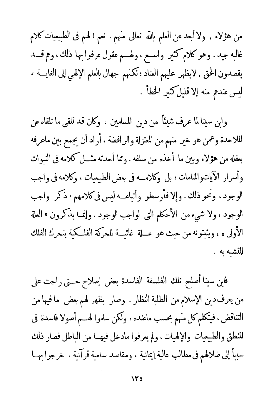 مِنْ هَؤُلَاءِ وَلَا أَبْعَدُ عَنْ الْعِلْمِ بِاَللَّهِ تَعَالَى مِنْهُمْ. نَعَمْ لَهُمْ فِي الطَّبِيعِيَّاتِ كَلَامٌ غَالِبُهُ جَيِّدٌ. وَهُوَ كَلَامٌ كَثِيرٌ وَاسِعٌ وَلَهُمْ عُقُولٌ عَرَفُوا بِهَا ذَلِكَ وَهُمْ قَدْ يَقْصِدُونَ الْحَقَّ لَا يَظْهَرُ عَلَيْهِمْ الْعِنَادُ؛ لَكِنَّهُمْ جُهَّالٌ بِالْعِلْمِ الْإِلَهِيِّ إلَى الْغَايَةِ لَيْسَ عِنْدَهُمْ مِنْهُ إلَّا قَلِيلٌ كَثِيرُ الْخَطَأِ. وَابْنُ سِينَا لَمَّا عَرَفَ شَيْئًا مِنْ دِينِ الْمُسْلِمِينَ وَكَانَ قَدْ تَلَقَّى مَا تَلَقَّاهُ عَنْ الْمَلَاحِدَةِ وَعَمَّنْ هُوَ خَيْرٌ مِنْهُمْ مَنْ الْمُعْتَزِلَةِ وَالرَّافِضَةِ أَرَادَ أَنْ يَجْمَعَ بَيْنَ مَا عَرَفَهُ بِعَقْلِهِ مِنْ هَؤُلَاءِ وَبَيْنَ مَا أَخَذَهُ مِنْ سَلَفِهِ. وَمِمَّا أَحْدَثَهُ مِثْلَ كَلَامِهِ فِي النُّبُوَّاتِ وَأَسْرَارِ الْآيَاتِ وَالْمَنَامَاتِ؛ بَلْ وَكَلَامِهِ فِي بَعْضِ الطَّبِيعِيَّاتِ وَكَلَامِهِ فِي وَاجِبِ الْوُجُودِ وَنَحْوِ ذَلِكَ. وَإِلَّا فَأَرِسْطُو وَأَتْبَاعُهُ لَيْسَ فِي كَلَامِهِمْ ذِكْرُ وَاجِبِ الْوُجُودِ وَلَا شَيْءٍ مِنْ الْأَحْكَامِ الَّتِي لِوَاجِبِ الْوُجُودِ وَإِنَّمَا يَذْكُرُونَ " الْعِلَّةَ الْأُولَى " وَيُثْبِتُونَهُ مِنْ حَيْثُ هُوَ عِلَّةٌ غائية لِلْحَرَكَةِ الْفَلَكِيَّةِ يَتَحَرَّكُ الْفَلَكُ لِلتَّشَبُّهِ بِهِ. فَابْنُ سِينَا أَصْلَحَ تِلْكَ الْفَلْسَفَةَ الْفَاسِدَةَ بَعْضَ إصْلَاحٍ حَتَّى رَاجَتْ عَلَى مَنْ يَعْرِفُ دِينَ الْإِسْلَامِ مِنْ الطَّلَبَةِ النُّظَّارِ. وَصَارَ يَظْهَرُ لَهُمْ بَعْضُ مَا فِيهَا مِنْ التَّنَاقُضِ فَيَتَكَلَّمُ كُلٌّ مِنْهُمْ بِحَسَبِ مَا عِنْدَهُ؛ وَلَكِنْ سَلَّمُوا لَهُمْ أُصُولًا فَاسِدَةً فِي الْمَنْطِقِ وَالطَّبِيعِيَّاتِ وَالْإِلَهِيَّاتِ وَلَمْ يَعْرِفُوا مَا دَخَلَ فِيهَا مِنْ الْبَاطِلِ فَصَارَ ذَلِكَ سَبَبًا إلَى ضَلَالِهِمْ فِي مَطَالِبَ عَالِيَةٍ إيمَانِيَّةٍ وَمَقَاصِدَ سَامِيَةٍ قُرْآنِيَّةٍ خَرَجُوا بِهَا