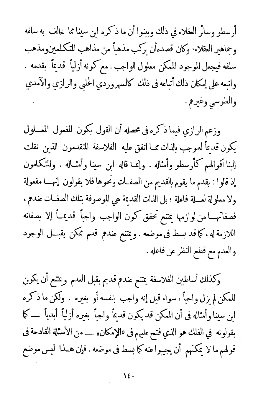 أَرِسْطُو وَسَائِرَ الْعُقَلَاءِ فِي ذَلِكَ وَبَيَّنُوا أَنَّ مَا ذَكَرَهُ ابْنُ سِينَا مِمَّا خَالَفَ بِهِ سَلَفَهُ وَجَمَاهِيرَ الْعُقَلَاءِ وَكَانَ قَصْدُهُ أَنْ يُرَكِّبَ مَذْهَبًا مِنْ مَذَاهِبِ الْمُتَكَلِّمِينَ وَمَذْهَبِ سَلَفِهِ فَيَجْعَلُ الْمَوْجُودَ الْمُمْكِنَ مَعْلُولَ الْوَاجِبِ. مَعَ كَوْنِهِ أَزَلِيًّا قَدِيمًا بِقِدَمِهِ. وَاتَّبَعَهُ عَلَى إمْكَانِ ذَلِكَ أَتْبَاعُهُ فِي ذَلِكَ كالسهروردي الْحَلَبِيِّ وَالرَّازِيَّ وَالْآمِدِيَّ والطوسي وَغَيْرِهِمْ. وَزَعَمَ الرَّازِيَّ فِيمَا ذَكَرَهُ فِي مُحَصِّلِهِ أَنَّ الْقَوْلَ بِكَوْنِ الْمَفْعُولِ الْمَعْلُولِ يَكُونُ قَدِيمًا لِلْمُوجَبِ بِالذَّاتِ مِمَّا اتَّفَقَ عَلَيْهِ الْفَلَاسِفَةُ الْمُتَقَدِّمُونَ الَّذِينَ نُقِلَتْ إلَيْنَا أَقْوَالُهُمْ كَأَرِسْطُو وَأَمْثَالِهِ. وَإِنَّمَا قَالَهُ ابْنُ سِينَا وَأَمْثَالُهُ. والمتكلمون إذْ قَالُوا: بِقِدَمِ مَا يَقُومُ بِالْقَدِيمِ مِنْ الصِّفَاتِ وَنَحْوِهَا فَلَا يَقُولُونَ إنَّهَا مَفْعُولَةٌ وَلَا مَعْلُولَةٌ لِعِلَّةِ فَاعِلَةٍ؛ بَلْ الذَّاتُ الْقَدِيمَةُ هِيَ الْمَوْصُوفَةُ بِتِلْكَ الصِّفَاتِ عِنْدَهُمْ فَصِفَاتُهَا مِنْ لَوَازِمِهَا يَمْتَنِعُ تَحَقُّقُ كَوْنِ الْوَاجِبِ وَاجِبًا قَدِيمًا إلَّا بِصِفَاتِهِ اللَّازِمَةِ لَهُ كَمَا قَدْ بُسِطَ فِي مَوْضِعِهِ. وَيَمْتَنِعُ عِنْدَهُمْ قِدَمٌ مُمْكِنٌ يَقْبَلُ الْوُجُودَ وَالْعَدَمَ مَعَ قَطْعِ النَّظَرِ عَنْ فَاعِلِهِ. وَكَذَلِكَ أَسَاطِينُ الْفَلَاسِفَةِ يَمْتَنِعُ عِنْدَهُمْ قَدِيمٌ يَقْبَلُ الْعَدَمَ وَيَمْتَنِعُ أَنْ يَكُونَ الْمُمْكِنُ لَمْ يَزَلْ وَاجِبًا سَوَاءٌ قِيلَ إنَّهُ وَاجِبٌ بِنَفْسِهِ أَوْ بِغَيْرِهِ. وَلَكِنَّ مَا ذَكَرَهُ ابْنُ سِينَا وَأَمْثَالُهُ فِي أَنَّ الْمُمْكِنَ قَدْ يَكُونُ قَدِيمًا وَاجِبًا بِغَيْرِهِ أَزَلِيًّا أَبَدِيًّا - كَمَا يَقُولُونَهُ فِي الْفَلَكِ هُوَ الَّذِي فَتَحَ عَلَيْهِمْ فِي " الْإِمْكَانِ " - مِنْ الْأَسْئِلَةِ الْقَادِحَةِ فِي قَوْلِهِمْ مَا لَا يُمْكِنُهُمْ أَنْ يُجِيبُوا عَنْهُ كَمَا بُسِطَ فِي مَوْضِعِهِ. فَإِنَّ هَذَا لَيْسَ مَوْضِعَ