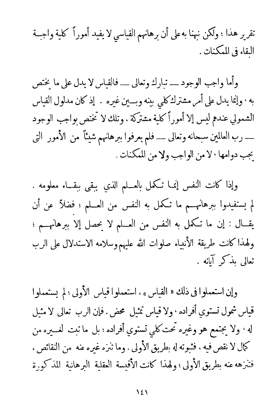تَقْرِيرِ هَذَا؛ وَلَكِنْ نَبَّهْنَا بِهِ عَلَى أَنَّ بُرْهَانَهُمْ الْقِيَاسِيَّ لَا يُفِيدُ أُمُورًا كُلِّيَّةً وَاجِبَةَ الْبَقَاءِ فِي الْمُمْكِنَاتِ. وَأَمَّا وَاجِبُ الْوُجُودِ - تَبَارَكَ وَتَعَالَى - فَالْقِيَاسُ لَا يَدُلُّ عَلَى مَا يَخْتَصُّ بِهِ وَإِنَّمَا يَدُلُّ عَلَى أَمْرٍ مُشْتَرَكٍ كُلِّيٍّ بَيْنَهُ وَبَيْنَ غَيْرِهِ. إذْ كَانَ مَدْلُولُ الْقِيَاسِ الشُّمُولِيِّ عِنْدَهُمْ لَيْسَ إلَّا أُمُورًا كُلِّيَّةً مُشْتَرَكَةً وَتِلْكَ لَا تَخْتَصُّ بِوَاجِبِ الْوُجُودِ - رَبِّ الْعَالَمِينَ سُبْحَانَهُ وَتَعَالَى - فَلَمْ يَعْرِفُوا بِبُرْهَانِهِمْ شَيْئًا مِنْ الْأُمُورِ الَّتِي يَجِبُ دَوَامُهَا لَا مِنْ الْوَاجِبِ وَلَا مِنْ الْمُمْكِنَاتِ. وَإِذَا كَانَتْ النَّفْسُ إنَّمَا تَكْمُلُ بِالْعِلْمِ الَّذِي يَبْقَى بِبَقَاءِ مَعْلُومِهِ. لَمْ يَسْتَفِيدُوا بِبُرْهَانِهِمْ مَا تَكْمُلُ بِهِ النَّفْسُ مِنْ الْعِلْمِ؛ فَضْلًا عَنْ أَنْ يُقَالَ: إنَّ مَا تَكْمُلُ بِهِ النَّفْسَ مِنْ الْعِلْمِ لَا يَحْصُلُ إلَّا بِبُرْهَانِهِمْ؛ وَلِهَذَا كَانَتْ طَرِيقَةُ الْأَنْبِيَاءِ صَلَوَاتُ اللَّهِ عَلَيْهِمْ وَسَلَامُهُ الِاسْتِدْلَالَ عَلَى الرَّبِّ تَعَالَى بِذِكْرِ آيَاتِهِ. وَإِنْ اسْتَعْمَلُوا فِي ذَلِكَ " الْقِيَاسَ " اسْتَعْمَلُوا قِيَاسَ الْأَوْلَى؛ لَمْ يَسْتَعْمِلُوا قِيَاسَ شُمُولٍ تَسْتَوِي أَفْرَادُهُ وَلَا قِيَاسَ تَمْثِيلٍ مَحْضٍ. فَإِنَّ الرَّبَّ تَعَالَى لَا مَثِيلَ لَهُ وَلَا يَجْتَمِعُ هُوَ وَغَيْرُهُ تَحْتَ كُلِّيٍّ تَسْتَوِي أَفْرَادُهُ؛ بَلْ مَا ثَبَتَ لِغَيْرِهِ مِنْ كَمَالٍ لَا نَقْصَ فِيهِ فَثُبُوتُهُ لَهُ بِطَرِيقِ الْأَوْلَى وَمَا تَنَزَّهَ غَيْرُهُ عَنْهُ مِنْ النَّقَائِصِ فَتَنَزُّهُهُ عَنْهُ بِطَرِيقِ الْأَوْلَى؛ وَلِهَذَا كَانَتْ الْأَقْيِسَةُ الْعَقْلِيَّةُ الْبُرْهَانِيَّةُ الْمَذْكُورَةُ