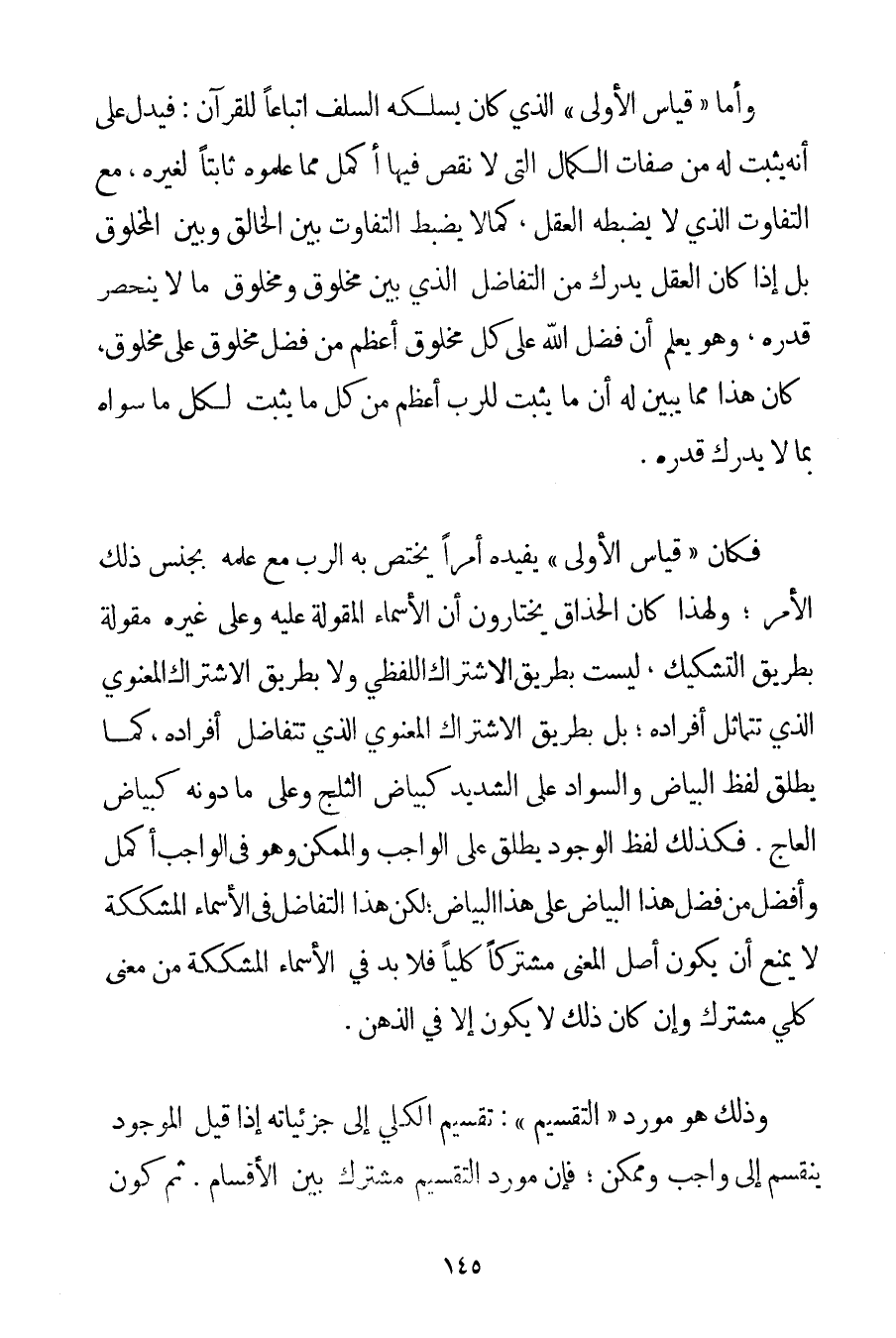 وَأَمَّا " قِيَاسُ الْأَوْلَى " الَّذِي كَانَ يَسْلُكُهُ السَّلَفُ اتِّبَاعًا لِلْقُرْآنِ: فَيَدُلُّ عَلَى أَنَّهُ يَثْبُتُ لَهُ مِنْ صِفَاتِ الْكَمَالِ الَّتِي لَا نَقْصَ فِيهَا أَكْمَلُ مِمَّا عَلِمُوهُ ثَابِتًا لِغَيْرِهِ مَعَ التَّفَاوُتِ الَّذِي لَا يَضْبِطُهُ الْعَقْلُ كَمَا لَا يَضْبِطُ التَّفَاوُتَ بَيْنَ الْخَالِقِ وَبَيْنَ الْمَخْلُوقِ بَلْ إذَا كَانَ الْعَقْلُ يُدْرِكُ مِنْ التَّفَاضُلِ الَّذِي بَيْنَ مَخْلُوقٍ وَمَخْلُوقٍ مَا لَا يَنْحَصِرُ قَدْرُهُ وَهُوَ يَعْلَمُ أَنَّ فَضْلَ اللَّهِ عَلَى كُلِّ مَخْلُوقٍ أَعْظَمُ مِنْ فَضْلِ مَخْلُوقٍ عَلَى مَخْلُوقٍ كَانَ هَذَا مِمَّا يُبَيِّنُ لَهُ أَنَّ مَا يَثْبُتُ لِلرَّبِّ أَعْظَمُ مِنْ كُلِّ مَا يَثْبُتُ لِكُلِّ مَا سِوَاهُ بِمَا لَا يُدْرَكُ قَدْرُهُ. فَكَأَنَّ " قِيَاسَ الْأَوْلَى " يُفِيدُهُ أَمْرًا يَخْتَصُّ بِهِ الرَّبُّ مَعَ عِلْمِهِ بِجِنْسِ ذَلِكَ الْأَمْرِ؛ وَلِهَذَا كَانَ الْحُذَّاقُ يَخْتَارُونَ أَنَّ الْأَسْمَاءَ الْمَقُولَةَ عَلَيْهِ وَعَلَى غَيْرِهِ مَقُولَةٌ بِطْرِيقِ التَّشْكِيكِ لَيْسَتْ بِطَرِيقِ الِاشْتِرَاكِ اللَّفْظِيِّ وَلَا بِطَرِيقِ الِاشْتِرَاكِ الْمَعْنَوِيِّ الَّذِي تَتَمَاثَلُ أَفْرَادُهُ؛ بَلْ بِطَرِيقِ الِاشْتِرَاكِ الْمَعْنَوِيِّ الَّذِي تَتَفَاضَلُ أَفْرَادُهُ كَمَا يُطْلَقُ لَفْظُ الْبَيَاضِ وَالسَّوَادِ عَلَى الشَّدِيدِ كَبَيَاضِ الثَّلْجِ وَعَلَى مَا دُونَهُ كَبَيَاضِ الْعَاجِ. فَكَذَلِكَ لَفْظُ الْوُجُودِ يُطْلَقُ عَلَى الْوَاجِبِ وَالْمُمْكِنِ وَهُوَ فِي الْوَاجِبِ أَكْمَلُ وَأَفْضَلُ مِنْ فَضْلِ هَذَا الْبَيَاضِ عَلَى هَذَا الْبَيَاضِ؛ لَكِنَّ هَذَا التَّفَاضُلَ فِي الْأَسْمَاءِ الْمُشَكَّكَةِ لَا يَمْنَعُ أَنْ يَكُونَ أَصْلُ الْمَعْنَى مُشْتَرَكًا كُلِّيًّا فَلَا بُدَّ فِي الْأَسْمَاءِ الْمُشَكَّكَةِ مِنْ مَعْنًى كُلِّيٍّ مُشْتَرَكٍ وَإِنْ كَانَ ذَلِكَ لَا يَكُونُ إلَّا فِي الذِّهْنِ. وَذَلِكَ هُوَ مَوْرِدُ " التَّقْسِيمِ ": تَقْسِيمُ الْكُلِّيِّ إلَى جُزْئِيَّاتِهِ إذَا قِيلَ الْمَوْجُودُ يَنْقَسِمُ إلَى وَاجِبٍ وَمُمْكِنٍ؛ فَإِنَّ مَوْرِدَ التَّقْسِيمِ مُشْتَرِكٌ بَيْنَ الْأَقْسَامِ. ثُمَّ كَوْنُ