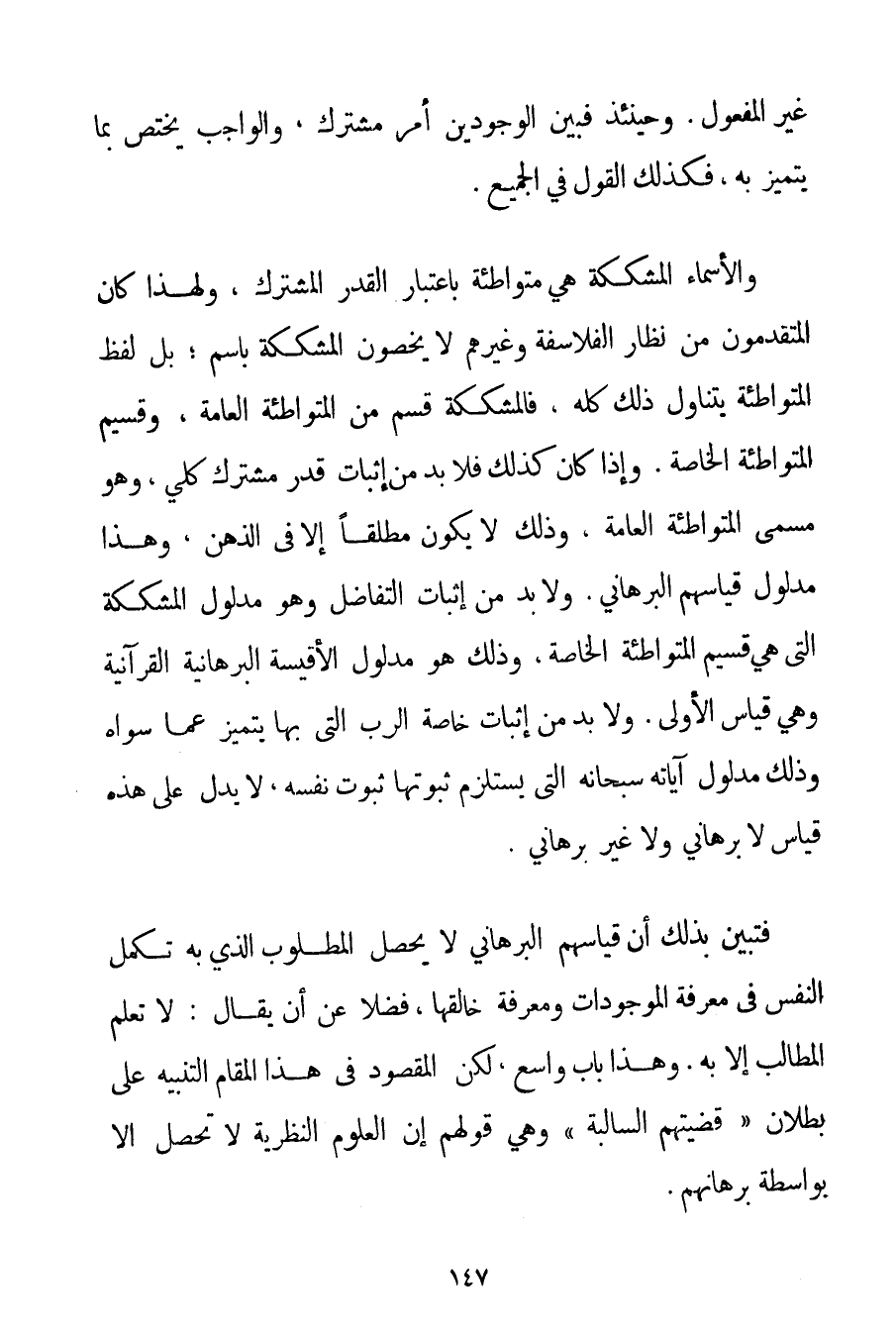 غَيْرِ الْمَفْعُولِ. وَحِينَئِذٍ فَبَيْنَ الْوُجُودَيْنِ أَمْرٌ مُشْتَرَكٌ وَالْوَاجِبُ يَخْتَصُّ بِمَا يَتَمَيَّزُ بِهِ فَكَذَلِكَ الْقَوْلُ فِي الْجَمِيعِ. وَالْأَسْمَاءُ الْمُشَكَّكَةُ هِيَ مُتَوَاطِئَةٌ بِاعْتِبَارِ الْقَدْرِ الْمُشْتَرَكِ وَلِهَذَا كَانَ الْمُتَقَدِّمُونَ مِنْ نُظَّارِ الْفَلَاسِفَةِ وَغَيْرِهِمْ لَا يَخُصُّونَ الْمُشَكَّكَةَ بِاسْمِ؛ بَلْ لَفْظُ الْمُتَوَاطِئَةِ يَتَنَاوَلُ ذَلِكَ كُلَّهُ فَالْمُشَكَّكَةُ قِسْمٌ مِنْ الْمُتَوَاطِئَةِ الْعَامَّةِ وَقَسِيمُ الْمُتَوَاطِئَةِ الْخَاصَّةِ. وَإِذَا كَانَ كَذَلِكَ فَلَا بُدَّ مِنْ إثْبَاتِ قَدْرٍ مُشْتَرَكٍ كُلِّيٍّ وَهُوَ مُسَمَّى الْمُتَوَاطِئَةِ الْعَامَّةِ وَذَلِكَ لَا يَكُونُ مُطْلَقًا إلَّا فِي الذِّهْنِ وَهَذَا مَدْلُولُ قِيَاسِهِمْ الْبُرْهَانِيِّ. وَلَا بُدَّ مِنْ إثْبَاتِ التَّفَاضُلِ وَهُوَ مَدْلُولُ الْمُشَكَّكَةِ الَّتِي هِيَ قَسِيمُ الْمُتَوَاطِئَةِ الْخَاصَّةِ وَذَلِكَ هُوَ مَدْلُولُ الْأَقْيِسَةِ الْبُرْهَانِيَّةِ الْقُرْآنِيَّةِ وَهِيَ قِيَاسُ الْأَوْلَى. وَلَا بُدَّ مِنْ إثْبَاتِ خَاصَّةِ الرَّبِّ الَّتِي بِهَا يَتَمَيَّزُ عَمَّا سِوَاهُ وَذَلِكَ مَدْلُولُ آيَاتِهِ سُبْحَانَهُ الَّتِي يَسْتَلْزِمُ ثُبُوتُهَا ثُبُوتَ نَفْسِهِ لَا يَدُلُّ عَلَى هَذِهِ قِيَاسٌ لَا بُرْهَانِيٌّ وَلَا غَيْرُ بُرْهَانِيٍّ. فَتَبَيَّنَ بِذَلِكَ أَنَّ قِيَاسَهُمْ الْبُرْهَانِيَّ لَا يُحَصِّلُ الْمَطْلُوبَ الَّذِي بِهِ تَكْمُلُ النَّفْسُ فِي مَعْرِفَةِ الْمَوْجُودَاتِ وَمَعْرِفَةِ خَالِقِهَا فَضْلًا عَنْ أَنْ يُقَالَ: لَا تُعْلَمُ الْمَطَالِبُ إلَّا بِهِ. وَهَذَا بَابٌ وَاسِعٌ لَكِنَّ الْمَقْصُودَ فِي هَذَا الْمَقَامِ التَّنْبِيهُ عَلَى بُطْلَانِ " قَضِيَّتِهِمْ السَّالِبَةِ " وَهِيَ قَوْلُهُمْ إنَّ الْعُلُومَ النَّظَرِيَّةَ لَا تَحْصُلُ إلَّا بِوَاسِطَةِ بُرْهَانِهِمْ.