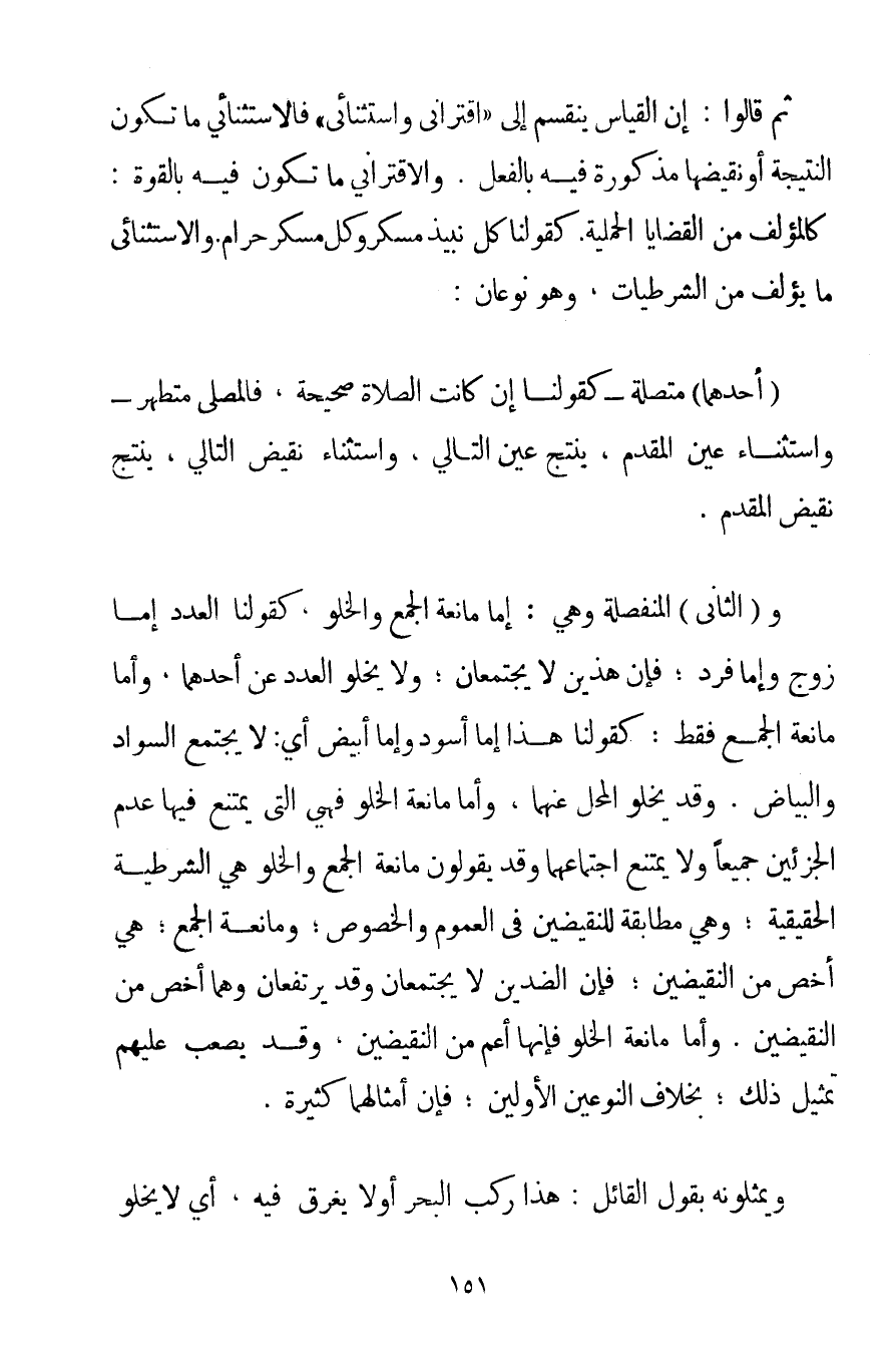 ثُمَّ قَالُوا: إنَّ الْقِيَاسَ يَنْقَسِمُ إلَى " اقْتِرَانِيٍّ وَاسْتِثْنَائِيٍّ " فالاستثنائي مَا تَكُونُ النَّتِيجَةُ أَوْ نَقِيضُهَا مَذْكُورَةً فِيهِ بِالْفِعْلِ. وَالِاقْتِرَانِيُّ مَا تَكُونُ فِيهِ بِالْقُوَّةِ: كَالْمُؤَلَّفِ مِنْ الْقَضَايَا الْحَمْلِيَّةِ. كَقَوْلِنَا كُلُّ نَبِيذٍ مُسْكِرٌ وَكُلُّ مُسْكِرٍ حَرَامٌ. والاستثنائي مَا يُؤَلَّفُ مِنْ الشَّرْطِيَّاتِ وَهُوَ نَوْعَانِ: (أَحَدُهُمَا مُتَّصِلَةٌ - كَقَوْلِنَا إنْ كَانَتْ الصَّلَاةُ صَحِيحَةً فَالْمُصَلِّي مُتَطَهِّرٌ - وَاسْتِثْنَاءُ عَيْنِ الْمُقَدَّمِ يُنْتِجُ عَيْنَ التَّالِي وَاسْتِثْنَاءُ نَقِيضِ التَّالِي يُنْتِجُ نَقِيضَ الْمُقَدَّمِ. وَ (الثَّانِي الْمُنْفَصِلَةُ وَهِيَ: إمَّا مَانِعَةُ الْجَمْعِ وَالْخُلُوِّ كَقَوْلِنَا الْعَدَدُ إمَّا زَوْجٌ وَإِمَّا فَرْدٌ؛ فَإِنَّ هَذَيْنِ لَا يَجْتَمِعَانِ؛ وَلَا يَخْلُو الْعَدَدُ عَنْ أَحَدِهِمَا وَإِمَّا مَانِعَةُ الْجَمْعِ فَقَطْ: كَقَوْلِنَا هَذَا إمَّا أَسْوَدُ وَإِمَّا أَبْيَضُ أَيْ: لَا يَجْتَمِعُ السَّوَادُ وَالْبَيَاضُ. وَقَدْ يَخْلُو الْمَحَلُّ عَنْهُمَا وَأَمَّا مَانِعَةُ الْخُلُوِّ فَهِيَ الَّتِي يَمْتَنِعُ فِيهَا عَدَمُ الْجُزْأَيْنِ جَمِيعًا وَلَا يَمْتَنِعُ اجْتِمَاعُهُمَا وَقَدْ يَقُولُونَ مَانِعَةُ الْجَمْعِ وَالْخُلُوِّ هِيَ الشَّرْطِيَّةُ الْحَقِيقِيَّةُ؛ وَهِيَ مُطَابِقَةٌ لِلنَّقِيضَيْنِ فِي الْعُمُومِ وَالْخُصُوصِ وَمَانِعَةُ الْجَمْعِ؛ هِيَ أَخَصُّ مِنْ النَّقِيضَيْنِ؛ فَإِنَّ الضِّدَّيْنِ لَا يَجْتَمِعَانِ وَقَدْ يَرْتَفِعَانِ وَهُمَا أَخَصُّ مِنْ النَّقِيضَيْنِ. وَأَمَّا مَانِعَةُ الْخُلُوِّ فَإِنَّهَا أَعَمُّ مِنْ النَّقِيضَيْنِ وَقَدْ يَصْعُبُ عَلَيْهِمْ تَمْثِيلُ ذَلِكَ؛ بِخِلَافِ النَّوْعَيْنِ الْأَوَّلَيْنِ؛ فَإِنَّ أَمْثَالَهُمَا كَثِيرَةٌ. وَيُمَثِّلُونَهُ بِقَوْلِ الْقَائِلِ: هَذَا رَكِبَ الْبَحْرَ أَوْ لَا يَغْرَقُ فِيهِ أَيْ لَا يَخْلُو