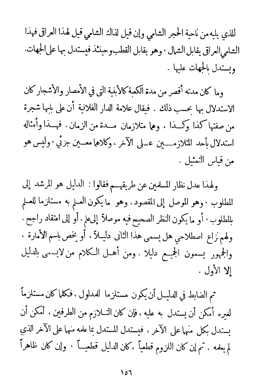 لِلَّذِي يَلِيهِ مِنْ نَاحِيَةِ الْحَجَرِ الشَّامِيِّ وَإِنْ قِيلَ لِذَاكَ الشَّامِيُّ قِيلَ لِهَذَا الْعِرَاقِيُّ فَهَذَا الشَّامِيُّ الْعِرَاقِيُّ يُقَابِلُ الشَّمَالَ وَهُوَ يُقَابِلُ الْقُطْبَ وَحِينَئِذٍ فَيُسْتَدَلُّ بِهَا عَلَى الْجِهَاتِ وَيُسْتَدَلُّ بِالْجِهَاتِ عَلَيْهَا. وَمَا كَانَ مُدَّتُهُ أَقْصَرَ مِنْ مُدَّةِ الْكَعْبَةِ كَالْأَبْنِيَةِ الَّتِي فِي الْأَمْصَارِ وَالْأَشْجَارِ كَانَ الِاسْتِدْلَالُ بِهَا بِحَسَبِ ذَلِكَ. فَيُقَالُ عَلَامَةُ الدَّارِ الْفُلَانِيَّةِ أَنَّ عَلَى بَابِهَا شَجَرَةً مِنْ صِفَتِهَا كَذَا وَكَذَا وَهُمَا مُتَلَازِمَانِ مُدَّةً مِنْ الزَّمَانِ. فَهَذَا وَأَمْثَالُهُ اسْتِدْلَالٌ بِأَحَدِ الْمُتَلَازِمَيْنِ عَلَى الْآخَرِ وَكِلَاهُمَا مُعَيَّنٌ جُزْئِيٌّ وَلَيْسَ هُوَ مِنْ قِيَاسِ التَّمْثِيلِ. وَلِهَذَا عَدَلَ نُظَّارُ الْمُسْلِمِينَ عَنْ طَرِيقِهِمْ فَقَالُوا: الدَّلِيلُ هُوَ الْمُرْشِدُ إلَى الْمَطْلُوبِ وَهُوَ الْمُوَصِّلُ إلَى الْمَقْصُودِ؛ وَهُوَ مَا يَكُونُ الْعِلْمُ بِهِ مُسْتَلْزِمًا لِلْعِلْمِ بِالْمَطْلُوبِ أَوْ مَا يَكُونُ النَّظَرُ الصَّحِيحُ فِيهِ مُوَصِّلًا إلَى عِلْمٍ أَوْ إلَى اعْتِقَادٍ رَاجِحٍ. وَلَهُمْ نِزَاعٌ اصْطِلَاحِيٌّ هَلْ يُسَمَّى هَذَا الثَّانِي دَلِيلًا أَوْ يُخَصُّ بِاسْمِ الْأَمَارَةِ وَالْجُمْهُورُ يُسَمُّونَ الْجَمِيعَ دَلِيلًا. وَمِنْ أَهْلِ الْكَلَامِ مَنْ لَا يُسَمِّي بِالدَّلِيلِ إلَّا الْأَوَّلَ. ثُمَّ الضَّابِطُ فِي الدَّلِيلِ أَنْ يَكُونَ مُسْتَلْزِمًا لِلْمَدْلُولِ فَكُلَّمَا كَانَ مُسْتَلْزِمًا لِغَيْرِهِ أَمْكَنَ أَنْ يُسْتَدَلَّ بِهِ عَلَيْهِ فَإِنْ كَانَ التَّلَازُمُ مِنْ الطَّرَفَيْنِ أَمْكَنَ أَنْ يُسْتَدَلَّ بِكُلِّ مِنْهُمَا عَلَى الْآخَرِ فَيَسْتَدِلُّ الْمُسْتَدِلُّ بِمَا عَلِمَهُ مِنْهُمَا عَلَى الْآخَرِ الَّذِي لَمْ يَعْلَمْهُ. ثُمَّ إنْ كَانَ اللُّزُومُ قَطْعِيًّا كَانَ الدَّلِيلُ قَطْعِيًّا وَإِنْ كَانَ ظَاهِرًا