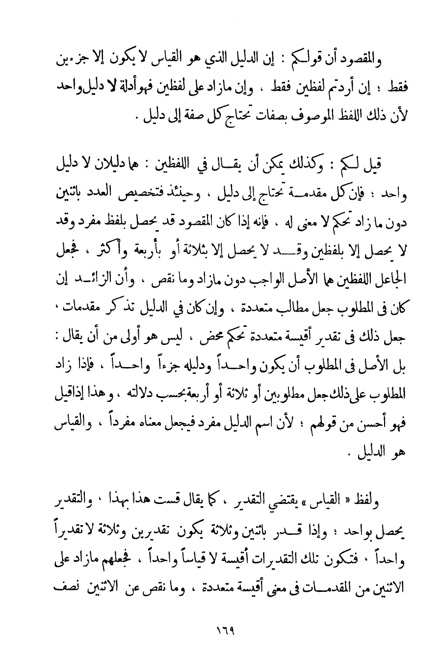 وَالْمَقْصُودُ أَنَّ قَوْلَكُمْ: إنَّ الدَّلِيلَ الَّذِي هُوَ الْقِيَاسُ لَا يَكُونُ إلَّا جُزْأَيْنِ فَقَطْ؛ إنْ أَرَدْتُمْ لَفْظَيْنِ فَقَطْ وَإِنَّ مَا زَادَ عَلَى لَفْظَيْنِ فَهُوَ أَدِلَّةٌ لَا دَلِيلٌ وَاحِدٌ لِأَنَّ ذَلِكَ اللَّفْظَ الْمَوْصُوفَ بِصِفَاتِ تَحْتَاجُ كُلُّ صِفَةٍ إلَى دَلِيلٍ. قِيلَ لَكُمْ: وَكَذَلِكَ يُمْكِنُ أَنْ يُقَالَ فِي اللَّفْظَيْنِ: هُمَا دَلِيلَانِ لَا دَلِيلٌ وَاحِدٌ؛ فَإِنَّ كُلَّ مُقَدِّمَةٍ تَحْتَاجُ إلَى دَلِيلٍ وَحِينَئِذٍ فَتَخْصِيصُ الْعَدَدِ بِاثْنَيْنِ دُونَ مَا زَادَ تَحَكُّمٌ لَا مَعْنَى لَهُ فَإِنَّهُ إذَا كَانَ الْمَقْصُودُ قَدْ يَحْصُلُ بِلَفْظِ مُفْرَدٍ وَقَدْ لَا يَحْصُلُ إلَّا بِلَفْظَيْنِ وَقَدْ لَا يَحْصُلُ إلَّا بِثَلَاثَةٍ أَوْ بِأَرْبَعَةٍ وَأَكْثَرَ فَجَعْلُ الْجَاعِلِ اللَّفْظَيْنِ هُمَا الْأَصْلَ الْوَاجِبَ دُونَ مَا زَادَ وَمَا نَقَصَ وَأَنَّ الزَّائِدَ إنْ كَانَ فِي الْمَطْلُوبِ جُعِلَ مَطَالِبَ مُتَعَدِّدَةً وَإِنْ كَانَ فِي الدَّلِيلِ تُذْكَرُ مُقَدِّمَاتُ جَعْلِ ذَلِكَ فِي تَقْدِيرِ أَقْيِسَةٍ مُتَعَدِّدَةٍ تَحَكُّمٌ مَحْضٌ لَيْسَ هُوَ أَوْلَى مِنْ أَنْ يُقَالَ: بَلْ الْأَصْلُ فِي الْمَطْلُوبِ أَنْ يَكُونَ وَاحِدًا وَدَلِيلَهُ جُزْءًا وَاحِدًا فَإِذَا زَادَ الْمَطْلُوبُ عَلَى ذَلِكَ جَعَلَ مَطْلُوبَيْنِ أَوْ ثَلَاثَةً أَوْ أَرْبَعَةً بِحَسَبِ دَلَالَتِهِ وَهَذَا إذَا قِيلَ فَهُوَ أَحْسَنُ مِنْ قَوْلِهِمْ؛ لِأَنَّ اسْمَ الدَّلِيلِ مُفْرَدٌ فَيُجْعَلُ مَعْنَاهُ مُفْرَدًا وَالْقِيَاسُ هُوَ الدَّلِيلَ. وَلَفْظُ " الْقِيَاسِ " يَقْتَضِي التَّقْدِيرَ كَمَا يُقَالُ قِسْت هَذَا بِهَذَا وَالتَّقْدِيرُ يَحْصُلُ بِوَاحِدِ؛ وَإِذَا قُدِّرَ بِاثْنَيْنِ وَثَلَاثَةٍ يَكُونُ تَقْدِيرَيْنِ وَثَلَاثَةً لَا تَقْدِيرًا وَاحِدًا فَتَكُونُ تِلْكَ التَّقْدِيرَاتُ أَقْيِسَةً لَا قِيَاسًا وَاحِدًا فَجَعْلُهُمْ مَا زَادَ عَلَى الِاثْنَيْنِ مِنْ الْمُقَدِّمَاتِ فِي مَعْنَى أَقْيِسَةٍ مُتَعَدِّدَةٍ وَمَا نَقَصَ عَنْ الِاثْنَيْنِ نِصْفَ