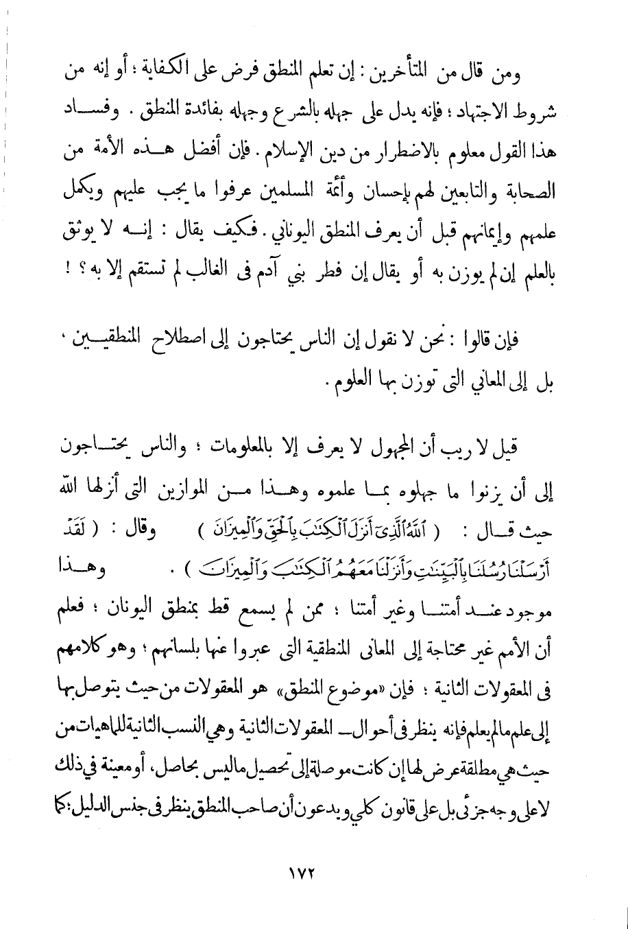 وَمَنْ قَالَ مِنْ الْمُتَأَخِّرِينَ: إنَّ تَعَلُّمَ الْمَنْطِقِ فَرْضٌ عَلَى الْكِفَايَةِ؛ أَوْ إنَّهُ مِنْ شُرُوطِ الِاجْتِهَادِ؛ فَإِنَّهُ يَدُلُّ عَلَى جَهْلِهِ بِالشَّرْعِ وَجَهْلِهِ بِفَائِدَةِ الْمَنْطِقِ. وَفَسَادُ هَذَا الْقَوْلِ مَعْلُومٌ بِالِاضْطِرَارِ مِنْ دِينِ الْإِسْلَامِ. فَإِنَّ أَفْضَلَ هَذِهِ الْأُمَّةِ مِنْ الصَّحَابَةِ وَالتَّابِعِينَ لَهُمْ بِإِحْسَانِ وَأَئِمَّةِ الْمُسْلِمِينَ عَرَفُوا مَا يَجِبُ عَلَيْهِمْ وَيُكْمِلُ عِلْمَهُمْ وَإِيمَانَهُمْ قَبْلَ أَنْ يُعْرَفَ الْمَنْطِقُ الْيُونَانِيُّ. فَكَيْفَ يُقَالُ: إنَّهُ لَا يُوثَقُ بِالْعِلْمِ إنْ لَمْ يُوزَنْ بِهِ أَوْ يُقَالُ إنَّ فِطَرَ بَنِي آدَمَ فِي الْغَالِبِ لَمْ تَسْتَقِمْ إلَّا بِهِ فَإِنْ قَالُوا: نَحْنُ لَا نَقُولُ إنَّ النَّاسَ يَحْتَاجُونَ إلَى اصْطِلَاحِ الْمَنْطِقِيِّينَ بَلْ إلَى الْمَعَانِي الَّتِي تُوزَنُ بِهَا الْعُلُومُ. قِيلَ لَا رَيْبَ أَنَّ الْمَجْهُولَ لَا يُعْرَفُ إلَّا بِالْمَعْلُومَاتِ؛ وَالنَّاسُ يَحْتَاجُونَ إلَى أَنْ يَزِنُوا مَا جَهِلُوهُ بِمَا عَلِمُوهُ وَهَذَا مِنْ الْمَوَازِينِ الَّتِي أَنْزَلَهَا اللَّهُ حَيْثُ قَالَ: {اللَّهُ الَّذِي أَنْزَلَ الْكِتَابَ بِالْحَقِّ وَالْمِيزَانَ} وَقَالَ: {لَقَدْ أَرْسَلْنَا رُسُلَنَا بِالْبَيِّنَاتِ وَأَنْزَلْنَا مَعَهُمُ الْكِتَابَ وَالْمِيزَانَ} . وَهَذَا مَوْجُودٌ عِنْدَ أُمَّتِنَا وَغَيْرِ أُمَّتِنَا؛ مِمَّنْ لَمْ يَسْمَعْ قَطُّ بِمَنْطِقِ الْيُونَانِ؛ فَعُلِمَ أَنَّ الْأُمَمَ غَيْرُ مُحْتَاجَةٍ إلَى الْمَعَانِي الْمَنْطِقِيَّةِ الَّتِي عَبَّرُوا عَنْهَا بِلِسَانِهِمْ؛ وَهُوَ كَلَامُهُمْ فِي الْمَعْقُولَاتِ الثَّانِيَةِ؛ فَإِنَّ " مَوْضُوعَ الْمَنْطِقِ " هُوَ الْمَعْقُولَاتُ مِنْ حَيْثُ يُتَوَصَّلُ بِهَا إلَى عِلْمِ مَا لَمْ يُعْلَمْ فَإِنَّهُ يَنْظُرُ فِي أَحْوَالِ - الْمَعْقُولَاتِ الثَّانِيَةِ وَهِيَ النِّسَبُ الثَّانِيَةُ لِلْمَاهِيَّاتِ مِنْ حَيْثُ هِيَ مُطْلَقَةٌ عَرَضَ لَهَا إنْ كَانَتْ مُوصِلَةً إلَى تَحْصِيلِ مَا لَيْسَ بِحَاصِلِ أَوْ مُعِينَةً فِي ذَلِكَ لَا عَلَى وَجْهٍ جُزْئِيٍّ بَلْ عَلَى قَانُونٍ كُلِّيٍّ وَيَدَّعُونَ أَنَّ صَاحِبَ الْمَنْطِقِ يَنْظُرُ فِي جِنْسِ الدَّلِيلِ؛ كَمَا