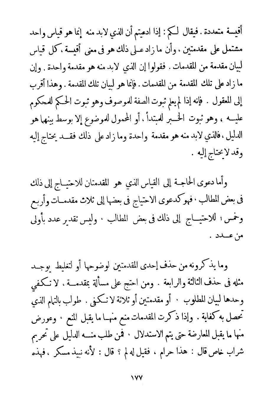 أَقْيِسَةٍ مُتَعَدِّدَةٍ. فَيُقَالُ لَكُمْ: إذَا ادَّعَيْتُمْ أَنَّ الَّذِي لَا بُدَّ مِنْهُ إنَّمَا هُوَ قِيَاسٌ وَاحِدٌ مُشْتَمِلٌ عَلَى مُقَدِّمَتَيْنِ وَأَنَّ مَا زَادَ عَلَى ذَلِكَ هُوَ فِي مَعْنَى أَقْيِسَةٍ كُلُّ قِيَاسٍ لِبَيَانِ مُقَدِّمَةٍ مِنْ الْمُقَدِّمَاتِ. فَقُولُوا إنَّ الَّذِي لَا بُدَّ مِنْهُ هُوَ مُقَدِّمَةٌ وَاحِدَةٌ. وَإِنَّ مَا زَادَ عَلَى تِلْكَ الْمُقَدِّمَةِ مِنْ الْمُقَدِّمَاتِ. فَإِنَّمَا هُوَ لِبَيَانِ تِلْكَ الْمُقَدِّمَةِ. وَهَذَا أَقْرَبُ إلَى الْمَعْقُولِ. فَإِنَّهُ إذَا لَمْ يُعْلَمْ ثُبُوتَ الصِّفَةِ لِلْمَوْصُوفِ وَهُوَ ثُبُوتُ الْحُكْمِ لِلْمَحْكُومِ عَلَيْهِ وَهُوَ ثُبُوتُ الْخَبَرِ لِلْمُبْتَدَأِ أَوْ الْمَحْمُولِ لِلْمَوْضُوعِ إلَّا بِوَسَطِ بَيْنَهُمَا هُوَ الدَّلِيلُ فَاَلَّذِي لَا بُدَّ مِنْهُ هُوَ مُقَدِّمَةٌ وَاحِدَةٌ وَمَا زَادَ عَلَى ذَلِكَ فَقَدْ يُحْتَاجُ إلَيْهِ وَقَدْ لَا يُحْتَاجُ إلَيْهِ. وَأَمَّا دَعْوَى الْحَاجَةِ إلَى الْقِيَاسِ الَّذِي هُوَ الْمُقَدِّمَتَانِ لِلِاحْتِيَاجِ إلَى ذَلِكَ فِي بَعْضِ الْمَطَالِبِ فَهُوَ كَدَعْوَى الِاحْتِيَاجِ فِي بَعْضِهَا إلَى ثَلَاثِ مُقَدِّمَاتٍ وَأَرْبَعٍ وَخَمْسٍ؛ لِلِاحْتِيَاجِ إلَى ذَلِكَ فِي بَعْضِ الْمَطَالِبِ وَلَيْسَ تَقْدِيرُ عَدَدٍ بِأَوْلَى مِنْ عَدَدٍ. وَمَا يَذْكُرُونَهُ مِنْ حَذْفِ إحْدَى الْمُقَدِّمَتَيْنِ لِوُضُوحِهَا أَوْ لِتَغْلِيطِ يُوجَدُ مِثْلُهُ فِي حَذْفِ الثَّالِثَةِ وَالرَّابِعَةِ. وَمَنْ احْتَجَّ عَلَى مَسْأَلَةٍ بِمُقَدِّمَةٍ لَا تَكْفِي وَحْدَهَا لِبَيَانِ الْمَطْلُوبِ أَوْ مُقَدِّمَتَيْنِ أَوْ ثَلَاثَةٍ لَا تَكْفِي. طُولِبَ بِالتَّمَامِ الَّذِي تَحْصُلُ بِهِ كِفَايَةٌ. وَإِذَا ذُكِرَتْ الْمُقَدِّمَاتُ مُنِعَ مِنْهَا مَا يَقْبَلُ الْمَنْعَ وَعُورِضَ مِنْهَا مَا يَقْبَلُ الْمُعَارَضَةَ حَتَّى يَتِمَّ الِاسْتِدْلَالُ فَمَنْ طَلَبَ مِنْهُ الدَّلِيلَ عَلَى تَحْرِيمِ شَرَابٍ خَاصٍّ قَالَ: هَذَا حَرَامٌ فَقِيلَ لَهُ لِمَ؟ قَالَ: لِأَنَّهُ نَبِيذٌ مُسْكِرٌ فَهَذِهِ
