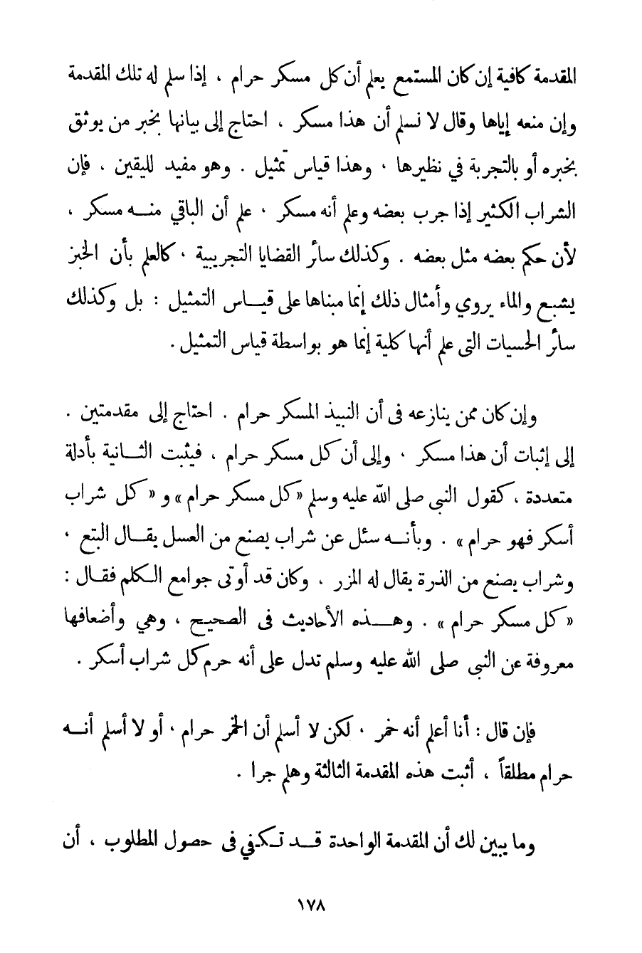 الْمُقَدِّمَةُ كَافِيَةٌ إنْ كَانَ الْمُسْتَمِعُ يَعْلَمُ أَنَّ كُلَّ مُسْكِرٍ حَرَامٌ إذَا سَلَّمَ لَهُ تِلْكَ الْمُقَدِّمَةَ وَإِنْ مَنْعَهُ إيَّاهَا وَقَالَ لَا نُسَلِّمُ أَنَّ هَذَا مُسْكِرٌ احْتَاجَ إلَى بَيَانِهَا بِخَبَرِ مَنْ يُوثَقُ بِخَبَرِهِ أَوْ بِالتَّجْرِبَةِ فِي نَظِيرِهَا وَهَذَا قِيَاسُ تَمْثِيلٍ. وَهُوَ مُفِيدٌ لِلْيَقِينِ فَإِنَّ الشَّرَابَ الْكَثِيرَ إذَا جَرَّبَ بَعْضَهُ وَعَلِمَ أَنَّهُ مُسْكِرٌ عَلِمَ أَنَّ الْبَاقِيَ مِنْهُ مُسْكِرٌ لِأَنَّ حُكْمَ بَعْضِهِ مِثْلُ بَعْضِهِ. وَكَذَلِكَ سَائِرُ الْقَضَايَا التَّجْرِيبِيَّةِ كَالْعِلْمِ بِأَنَّ الْخُبْزَ يُشْبِعُ وَالْمَاءَ يَرْوِي وَأَمْثَالِ ذَلِكَ إنَّمَا مَبْنَاهَا عَلَى قِيَاسِ التَّمْثِيلِ: بَلْ وَكَذَلِكَ سَائِرُ الْحِسِّيَّاتِ الَّتِي عَلِمَ أَنَّهَا كُلِّيَّةٌ إنَّمَا هُوَ بِوَاسِطَةِ قِيَاسِ التَّمْثِيلِ. وَإِنْ كَانَ مِمَّنْ يُنَازِعُهُ فِي أَنَّ النَّبِيذَ الْمُسْكِرَ حَرَامٌ. احْتَاجَ إلَى مُقَدِّمَتَيْنِ. إلَى إثْبَاتِ أَنَّ هَذَا مُسْكِرٌ وَإِلَى أَنَّ كُلَّ مُسْكِرٍ حَرَامٌ فَيُثْبِتُ الثَّانِيَةَ بِأَدِلَّةِ مُتَعَدِّدَةٍ كَقَوْلِ النَّبِيِّ صَلَّى اللَّهُ عَلَيْهِ وَسَلَّمَ {كُلُّ مُسْكِرٍ حَرَامٌ} وَ {كُلُّ شَرَابٍ أَسْكَرَ فَهُوَ حَرَامٌ} . وَبِأَنَّهُ {سُئِلَ عَنْ شَرَابٍ يُصْنَعُ مِنْ الْعَسَلِ يُقَالُ لَهُ الْبِتْعُ وَشَرَابٍ يُصْنَعُ مِنْ الذُّرَةِ يُقَالُ لَهُ الْمِزْرُ وَكَانَ قَدْ أُوتِيَ جَوَامِعَ الْكَلِمِ فَقَالَ: كُلُّ مُسْكِرٍ حَرَامٌ} . وَهَذِهِ الْأَحَادِيثُ فِي الصَّحِيحِ وَهِيَ وَأَضْعَافُهَا مَعْرُوفَةٌ عَنْ النَّبِيِّ صَلَّى اللَّهُ عَلَيْهِ وَسَلَّمَ تَدُلُّ عَلَى أَنَّهُ حَرَّمَ كُلَّ شَرَابٍ أَسْكَرَ. فَإِنْ قَالَ: أَنَا أَعْلَمُ أَنَّهُ خَمْرٌ لَكِنْ لَا أُسَلِّمُ أَنَّ الْخَمْرَ حَرَامٌ أَوْ لَا أُسَلِّمُ أَنَّهُ حَرَامٌ مُطْلَقًا أَثْبَتَ هَذِهِ الْمُقَدِّمَةَ الثَّالِثَةَ وَهَلُمَّ جَرًّا. وَمَا يُبَيِّنُ لَك أَنَّ الْمُقَدِّمَةَ الْوَاحِدَةَ قَدْ تَكْفِي فِي حُصُولِ الْمَطْلُوبِ أَنَّ