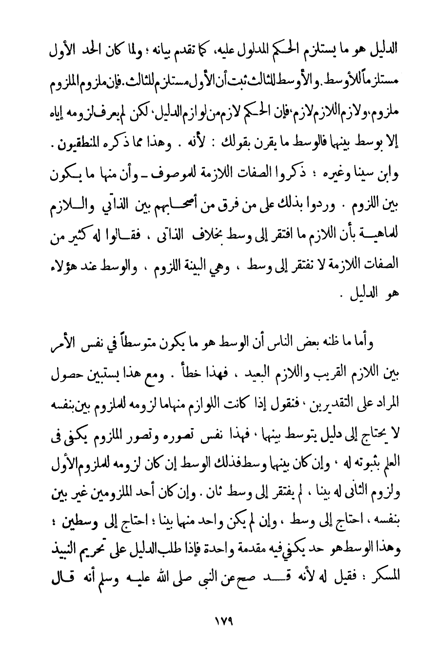 الدَّلِيلَ هُوَ مَا يَسْتَلْزِمُ الْحُكْمَ الْمَدْلُولَ عَلَيْهِ كَمَا تَقَدَّمَ بَيَانُهُ؛ وَلَمَّا كَانَ الْحَدُّ الْأَوَّلُ مُسْتَلْزِمًا لِلْأَوْسَطِ. وَالْأَوْسَطُ لِلثَّالِثِ ثَبَتَ أَنَّ الْأَوَّلَ مُسْتَلْزِمٌ لِلثَّالِثِ. فَإِنَّ مَلْزُومَ الْمَلْزُومِ مَلْزُومٌ وَلَازِمَ اللَّازِمِ لَازِمٌ فَإِنَّ الْحُكْمَ لَازِمٌ مِنْ لَوَازِمِ الدَّلِيلِ لَكِنْ لَمْ يُعْرَفْ لُزُومُهُ إيَّاهُ إلَّا بِوَسَطِ بَيْنَهُمَا فَالْوَسَطُ مَا يُقْرَنُ بِقَوْلِك: لِأَنَّهُ. وَهَذَا مِمَّا ذَكَرَهُ الْمَنْطِقِيُّونَ. وَابْنُ سِينَا وَغَيْرُهُ؛ ذَكَرُوا الصِّفَاتِ اللَّازِمَةَ لِلْمَوْصُوفِ - وَأَنَّ مِنْهَا مَا يَكُونُ بَيِّنَ اللُّزُومِ. وَرَدُّوا بِذَلِكَ عَلَى مَنْ فَرَّقَ مِنْ أَصْحَابِهِمْ بَيْنَ الذَّاتِيِّ وَاللَّازِمِ لِلْمَاهِيَّةِ بِأَنَّ اللَّازِمَ مَا افْتَقَرَ إلَى وَسَطٍ بِخِلَافِ الذَّاتِيِّ فَقَالُوا لَهُ كَثِيرٌ مِنْ الصِّفَاتِ اللَّازِمَةِ لَا تَفْتَقِرُ إلَى وَسَطٍ وَهِيَ الْبَيِّنَةُ اللُّزُومُ وَالْوَسَطُ عِنْدَ هَؤُلَاءِ هُوَ الدَّلِيلُ.