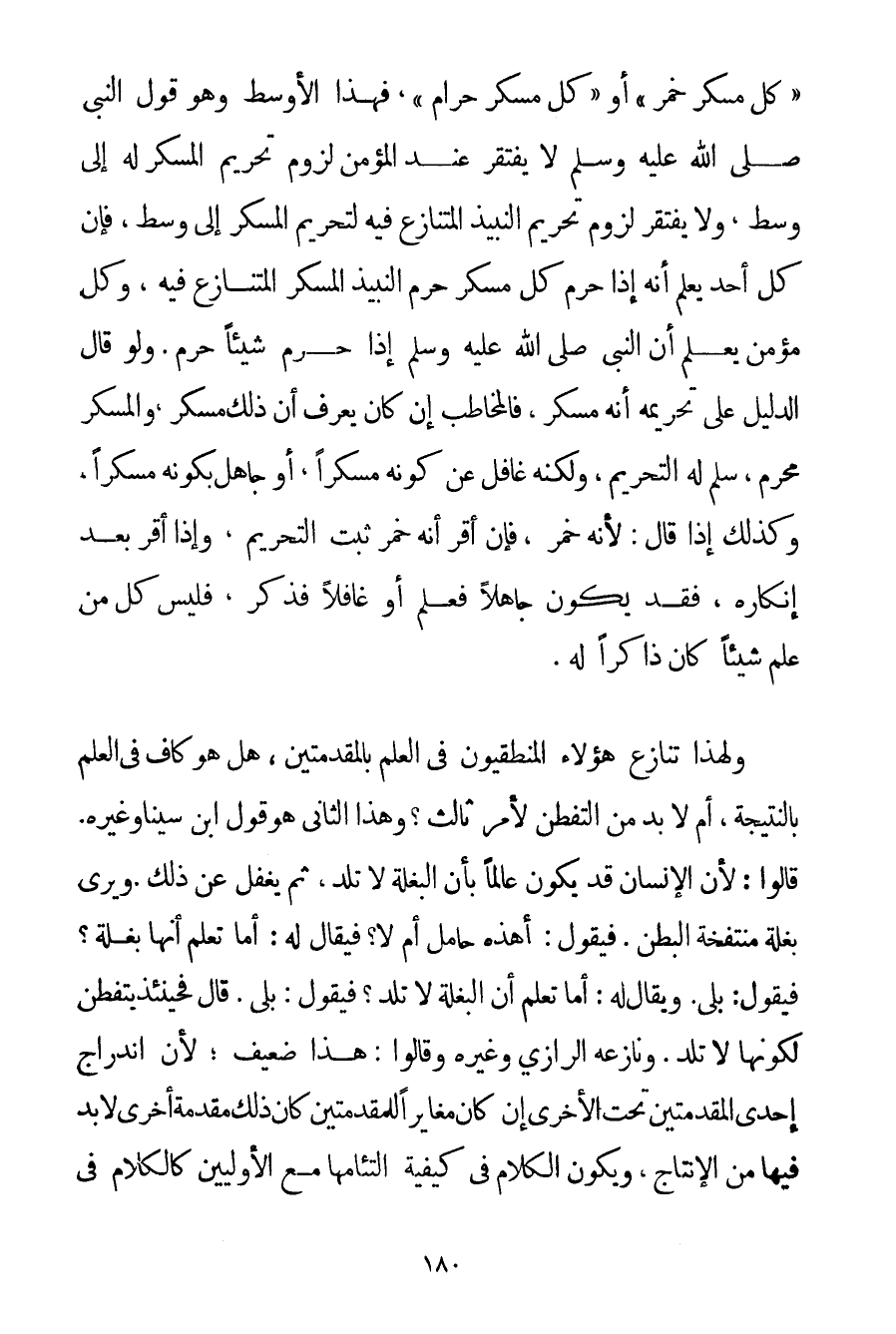 وَلِهَذَا تَنَازَعَ هَؤُلَاءِ الْمَنْطِقِيُّونَ فِي الْعِلْمِ بِالْمُقَدِّمَتَيْن هَلْ هُوَ كَافٍ فِي الْعِلْمِ بِالنَّتِيجَةِ أَمْ لَا بُدَّ مِنْ التَّفَطُّنِ لِأَمْرِ ثَالِثٍ؟ وَهَذَا الثَّانِي هُوَ قَوْلُ ابْنِ سِينَا وَغَيْرِهِ. قَالُوا: لِأَنَّ الْإِنْسَانَ قَدْ يَكُونُ عَالِمًا بِأَنَّ الْبَغْلَةَ لَا تَلِدُ ثُمَّ يَغْفُلُ عَنْ ذَلِكَ. وَيَرَى بَغْلَةً مُنْتَفِخَةَ الْبَطْنِ. فَيَقُولُ: أَهَذِهِ حَامِلٌ أَمْ لَا؟ فَيُقَالُ لَهُ: أَمَا تَعْلَمُ أَنَّهَا بَغْلَةٌ؟ فَيَقُولُ: بَلَى. وَيُقَالُ لَهُ: أَمَا تَعْلَمُ أَنَّ الْبَغْلَةَ لَا تَلِدُ؟ فَيَقُولُ: بَلَى. قَالَ فَحِينَئِذٍ يَتَفَطَّنُ لِكَوْنِهَا لَا تَلِدُ. وَنَازَعَهُ الرَّازِيَّ وَغَيْرُهُ وَقَالُوا: هَذَا ضَعِيفٌ؛ لِأَنَّ انْدِرَاجَ إحْدَى الْمُقَدِّمَتَيْنِ تَحْتَ الْأُخْرَى إنْ كَانَ مُغَايِرًا للمقدمتين كَانَ ذَلِكَ مُقَدِّمَةً أُخْرَى لَا بُدَّ فِيهَا مِنْ الْإِنْتَاجِ وَيَكُونُ الْكَلَامُ فِي كَيْفِيَّةِ الْتِئَامِهَا مَعَ الْأُولَيَيْنِ كَالْكَلَامِ فِي