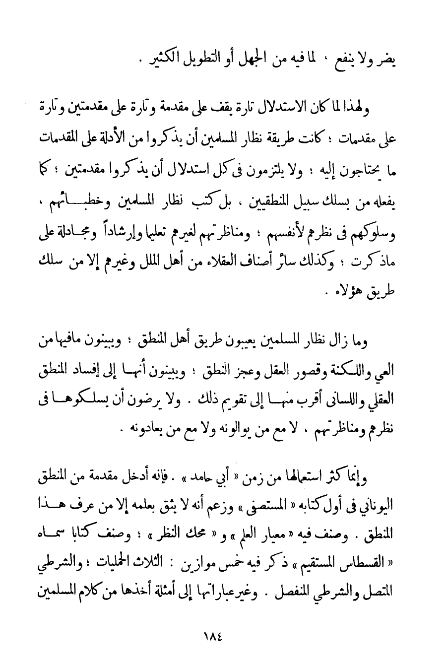 يَضُرُّ وَلَا يَنْفَعُ لِمَا فِيهِ مِنْ الْجَهْلِ أَوْ التَّطْوِيلِ الْكَثِيرِ. وَلِهَذَا لَمَّا كَانَ الِاسْتِدْلَالُ تَارَةً يَقِفُ عَلَى مُقَدِّمَةٍ وَتَارَةً عَلَى مُقَدِّمَتَيْنِ وَتَارَةً عَلَى مُقَدِّمَاتٍ؛ كَانَتْ طَرِيقَةُ نُظَّارِ الْمُسْلِمِينَ أَنْ يَذْكُرُوا مِنْ الْأَدِلَّةِ عَلَى الْمُقَدِّمَاتِ مَا يَحْتَاجُونَ إلَيْهِ؛ وَلَا يَلْتَزِمُونَ فِي كُلِّ اسْتِدْلَالٍ أَنْ يَذْكُرُوا مُقَدِّمَتَيْنِ؛ كَمَا يَفْعَلُهُ مَنْ يَسْلُكُ سَبِيلَ الْمَنْطِقِيِّينَ بَلْ كُتُبُ نُظَّارِ الْمُسْلِمِينَ وَخُطَبَائِهِمْ وَسُلُوكِهِمْ فِي نَظَرِهِمْ لِأَنْفُسِهِمْ؛ وَمُنَاظَرَتِهِمْ لِغَيْرِهِمْ تَعْلِيمًا وَإِرْشَادًا وَمُجَادَلَةً عَلَى مَا ذَكَرْت؛ وَكَذَلِكَ سَائِرُ أَصْنَافِ الْعُقَلَاءِ مِنْ أَهْلِ الْمِلَلِ وَغَيْرِهِمْ إلَّا مَنْ سَلَكَ طَرِيقَ هَؤُلَاءِ. وَمَا زَالَ نُظَّارُ الْمُسْلِمِينَ يَعِيبُونَ طَرِيقَ أَهْلِ الْمَنْطِقِ؛ وَيُبَيِّنُونَ مَا فِيهَا مِنْ الْعِيِّ وَاللُّكْنَةِ وَقُصُورِ الْعَقْلِ وَعَجْزِ النُّطْقِ؛ وَيُبَيِّنُونَ أَنَّهَا إلَى إفْسَادِ الْمَنْطِقِ الْعَقْلِيِّ وَاللِّسَانِيِّ أَقْرَبُ مِنْهَا إلَى تَقْوِيمِ ذَلِكَ. وَلَا يَرْضَوْنَ أَنْ يَسْلُكُوهَا فِي نَظَرِهِمْ وَمُنَاظَرَتِهِمْ لَا مَعَ مَنْ يُوَالُونَهُ وَلَا مَعَ مَنْ يُعَادُونَهُ. وَإِنَّمَا كَثُرَ اسْتِعْمَالُهَا مِنْ زَمَنِ " أَبِي حَامِدٍ ". فَإِنَّهُ أَدْخَلَ مُقَدِّمَةً مِنْ الْمَنْطِقِ الْيُونَانِيِّ فِي أَوَّلِ كِتَابِهِ " الْمُسْتَصْفَى " وَزَعَمَ أَنَّهُ لَا يَثِقُ بِعِلْمِهِ إلَّا مَنْ عَرَفَ هَذَا الْمَنْطِقَ. وَصَنَّفَ فِيهِ " مِعْيَارَ الْعِلْمِ " وَ " مَحَكَّ النَّظَرِ "؛ وَصَنَّفَ كِتَابًا سَمَّاهُ " الْقِسْطَاسَ الْمُسْتَقِيمَ " ذَكَرَ فِيهِ خَمْسَ مَوَازِينَ: الثَّلَاثَ الْحَمْلِيَّاتِ؛ وَالشَّرْطِيَّ الْمُتَّصِلَ وَالشَّرْطِيَّ الْمُنْفَصِلَ. وَغَيَّرَ عِبَارَاتِهَا إلَى أَمْثِلَةٍ أَخَذَهَا مِنْ كَلَامِ الْمُسْلِمِينَ
