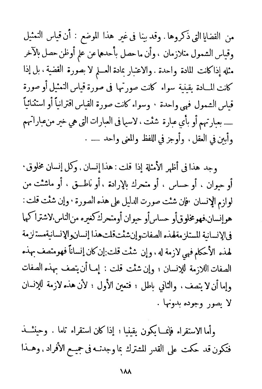 مِنْ الْقَضَايَا الَّتِي ذَكَرُوهَا. وَقَدْ بَيَّنَّا فِي غَيْرِ هَذَا الْمَوْضِعِ: أَنَّ قِيَاسَ التَّمْثِيلِ وَقِيَاسَ الشُّمُولِ مُتَلَازِمَانِ وَأَنَّ مَا حَصَلَ بِأَحَدِهِمَا عَنْ عِلْمٍ أَوْ ظَنٍّ حَصَلَ بِالْآخَرِ مِثْلُهُ إذَا كَانَتْ الْمَادَّةُ وَاحِدَةً. وَالِاعْتِبَارُ بِمَادَّةِ الْعِلْمِ لَا بِصُورَةِ الْقَضِيَّةِ بَلْ إذَا كَانَتْ الْمَادَّةُ يَقِينِيَّةً سَوَاءٌ كَانَتْ صُورَتُهَا فِي صُورَةِ قِيَاسِ التَّمْثِيلِ أَوْ صُورَةِ قِيَاسِ الشُّمُولِ فَهِيَ وَاحِدَةٌ وَسَوَاءٌ كَانَتْ صُورَةُ الْقِيَاسِ اقْتِرَانِيًّا أَوْ اسْتِثْنَائِيًّا - بِعِبَارَتِهِمْ أَوْ بِأَيِّ عِبَارَةٍ شِئْت لَا سِيَّمَا فِي الْعِبَارَاتِ الَّتِي هِيَ خَيْرٌ مِنْ عِبَارَاتِهِمْ وَأَبْيَنُ فِي الْعَقْلِ وَأَوْجَزُ فِي اللَّفْظِ وَالْمَعْنَى وَاحِدٌ -. وُجِدَ هَذَا فِي أَظْهَرِ الْأَمْثِلَةِ إذَا قُلْت: هَذَا إنْسَانٌ وَكُلُّ إنْسَانٍ مَخْلُوقٌ أَوْ حَيَوَانٌ أَوْ حَسَّاسٌ أَوْ مُتَحَرِّكٌ بِالْإِرَادَةِ أَوْ نَاطِقٌ أَوْ مَا شِئْت مِنْ لَوَازِمِ الْإِنْسَانِ فَإِنْ شِئْت صَوَّرْت الدَّلِيلَ عَلَى هَذِهِ الصُّورَةِ وَإِنْ شِئْت قُلْت: هُوَ إنْسَانٌ فَهُوَ مَخْلُوقٌ أَوْ حَسَّاسٌ أَوْ حَيَوَانٌ أَوْ مُتَحَرِّكٌ كَغَيْرِهِ مِنْ النَّاسِ لِاشْتِرَاكِهِمَا فِي الْإِنْسَانِيَّةِ الْمُسْتَلْزِمَةِ لِهَذِهِ الصِّفَاتِ وَإِنْ شِئْت قُلْت هَذَا إنْسَانٌ والإنسانية مُسْتَلْزِمَةٌ لِهَذِهِ الْأَحْكَامِ فَهِيَ لَازِمَةٌ لَهُ وَإِنْ شِئْت قُلْت: إنْ كَانَ إنْسَانًا فَهُوَ مُتَّصِفٌ بِهَذِهِ الصِّفَاتِ اللَّازِمَةِ لِلْإِنْسَانِ؛ وَإِنْ شِئْت قُلْت: إمَّا أَنْ يَتَّصِفَ بِهَذِهِ الصِّفَاتِ وَإِمَّا أَنْ لَا يَتَّصِفَ وَالثَّانِي بَاطِلٌ؛ فَتَعَيَّنَ الْأَوَّلُ؛ لِأَنَّ هَذِهِ لَازِمَةٌ لِلْإِنْسَانِ لَا يُتَصَوَّرُ وُجُودُهُ بِدُونِهَا. وَأَمَّا الِاسْتِقْرَاءُ فَإِنَّمَا يَكُونُ يَقِينِيًّا؛ إذَا كَانَ اسْتِقْرَاءً تَامًّا. وَحِينَئِذٍ فَتَكُونُ قَدْ حَكَمْت عَلَى الْقَدْرِ الْمُشْتَرَكِ بِمَا وَجَدْته فِي جَمِيعِ الْأَفْرَادِ وَهَذَا