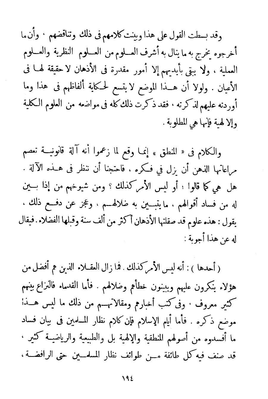 أَحَدُهَا: أَنَّهُ لَيْسَ الْأَمْرُ كَذَلِكَ. فَمَا زَالَ الْعُقَلَاءُ الَّذِينَ هُمْ أَفْضَلُ مِنْ هَؤُلَاءِ يُنْكِرُونَ عَلَيْهِمْ وَيُبَيِّنُونَ خَطَأَهُمْ وَضَلَالَهُمْ. فَأَمَّا الْقُدَمَاءُ فَالنِّزَاعُ بَيْنَهُمْ كَثِيرٌ مَعْرُوفٌ وَفِي كُتُبِ أَخْبَارِهِمْ وَمَقَالَاتِهِمْ مِنْ ذَلِكَ مَا لَيْسَ هَذَا مَوْضِعَ ذِكْرِهِ. فَأَمَّا أَيَّامُ الْإِسْلَامِ فَإِنَّ كَلَامَ نُظَّارِ الْمُسْلِمِينَ فِي بَيَانِ فَسَادِ مَا أَفْسَدُوهُ مِنْ أُصُولِهِمْ الْمَنْطِقِيَّةِ وَالْإِلَهِيَّةِ بَلْ وَالطَّبِيعِيَّةِ وَالرِّيَاضِيَّةِ كَثِيرٌ قَدْ صَنَّفَ فِيهِ كُلُّ طَائِفَةٍ مِنْ طَوَائِفِ نُظَّارِ الْمُسْلِمِينَ حَتَّى الرَّافِضَةِ