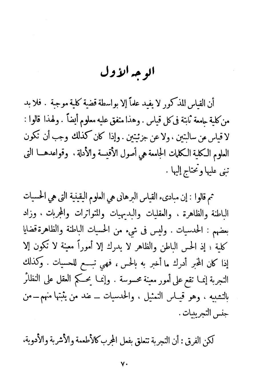 الْوَجْهُ الْأَوَّلُ: أَنَّ الْقِيَاسَ الْمَذْكُورَ لَا يُفِيدُ عِلْمًا إلَّا بِوَاسِطَةِ قَضِيَّةٍ كُلِّيَّةٍ مُوجَبَةٍ. فَلَا بُدَّ مِنْ كُلِّيَّةٍ جَامِعَةٍ ثَابِتَةٍ فِي كُلِّ قِيَاسٍ. وَهَذَا مُتَّفَقٌ عَلَيْهِ مَعْلُومٌ أَيْضًا. وَلِهَذَا قَالُوا: لَا قِيَاسَ عَنْ سَالِبَتَيْنِ وَلَا عَنْ جُزْئِيَّتَيْنِ. وَإِذَا كَانَ كَذَلِكَ وَجَبَ أَنْ تَكُونَ الْعُلُومُ الْكُلِّيَّةُ الْكَلِمَاتِ الْجَامِعَةُ هِيَ أُصُولَ الْأَقْيِسَةِ وَالْأَدِلَّةَ وَقَوَاعِدَهَا الَّتِي تُبْنَى عَلَيْهَا وَتَحْتَاجُ إلَيْهَا. ثُمَّ قَالُوا: إنَّ مَبَادِئَ الْقِيَاسِ الْبُرْهَانِيِّ هِيَ الْعُلُومُ الْيَقِينِيَّةُ الَّتِي هِيَ الْحِسِّيَّاتُ الْبَاطِنَةُ وَالظَّاهِرَةُ وَالْعَقْلِيَّاتُ وَالْبَدِيهِيَّاتُ والمتواترات وَالْمُجَرَّبَاتُ وَزَادَ بَعْضُهُمْ: الْحَدْسِيَّاتُ. وَلَيْسَ فِي شَيْءٍ مِنْ الْحِسِّيَّاتِ الْبَاطِنَةِ وَالظَّاهِرَةِ قَضَايَا كُلِّيَّةٌ؛ إذْ الْحِسُّ الْبَاطِنُ وَالظَّاهِرُ لَا يُدْرِكُ إلَّا أُمُورًا مُعَيَّنَةً لَا تَكُونُ إلَّا إذَا كَانَ الْمُخْبِرُ أَدْرَكَ مَا أَخْبَرَ بِهِ بِالْحِسِّ فَهِيَ تَبَعٌ لِلْحِسِّيَّاتِ. وَكَذَلِكَ التَّجْرِبَةُ إنَّمَا تَقَعُ عَلَى أُمُورٍ مُعَيَّنَةٍ مَحْسُوسَةٍ. وَإِنَّمَا يَحْكُمُ الْعَقْلُ عَلَى النَّظَائِرِ بِالتَّشْبِيهِ وَهُوَ قِيَاسُ التَّمْثِيلِ وَالْحَدْسِيَّاتِ - عِنْدَ مَنْ يُثْبِتُهَا مِنْهُمْ - مِنْ جِنْسِ التَّجْرِيبِيَّاتِ. لَكِنَّ الْفَرْقَ: أَنَّ التَّجْرِبَةَ تَتَعَلَّقُ بِفِعْلِ الْمُجَرِّبِ كَالْأَطْعِمَةِ وَالْأَشْرِبَةِ وَالْأَدْوِيَةِ