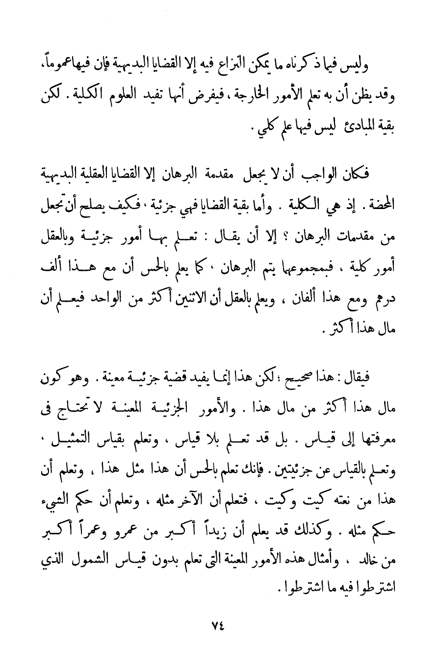 وَلَيْسَ فِيمَا ذَكَرْنَاهُ مَا يُمْكِنُ النِّزَاعُ فِيهِ إلَّا الْقَضَايَا الْبَدِيهِيَّةُ فَإِنَّ فِيهَا عُمُومًا وَقَدْ يَظُنُّ أَنَّ بِهِ تَعَلُّمَ الْأُمُورِ الْخَارِجَةِ فَيَفْرِضُ أَنَّهَا تُفِيدُ الْعُلُومَ الْكُلِّيَّةَ. لَكِنَّ بَقِيَّةَ الْمَبَادِئِ لَيْسَ فِيهَا عِلْمٌ كُلِّيٌّ. فَكَانَ الْوَاجِبُ أَنْ لَا يَجْعَلَ مُقَدِّمَةَ الْبُرْهَانِ إلَّا الْقَضَايَا الْعَقْلِيَّةَ الْبَدِيهِيَّةَ الْمَحْضَةَ. إذْ هِيَ الْكُلِّيَّةُ. وَأَمَّا بَقِيَّةُ الْقَضَايَا فَهِيَ جُزْئِيَّةٌ فَكَيْفَ يَصْلُحُ أَنْ تُجْعَلَ مِنْ مُقَدِّمَاتِ الْبُرْهَانِ؟ إلَّا أَنْ يُقَالَ: تُعْلَمُ بِهَا أُمُورٌ جُزْئِيَّةٌ وَبِالْعَقْلِ أُمُورٌ كُلِّيَّةٌ فَبِمَجْمُوعِهِمَا يَتِمُّ الْبُرْهَانُ كَمَا يُعْلَمُ بِالْحِسِّ أَنَّ مَعَ هَذَا أَلْفَ دِرْهَمٍ وَمَعَ هَذَا أَلْفَانِ وَيُعْلَمُ بِالْعَقْلِ أَنَّ الِاثْنَيْنِ أَكْثَرُ مِنْ الْوَاحِدِ فَيُعْلَمُ أَنَّ مَالَ هَذَا أَكْثَرُ. فَيُقَالُ: هَذَا صَحِيحٌ؛ لَكِنَّ هَذَا إنَّمَا يُفِيدُ قَضِيَّةً جُزْئِيَّةً مُعَيَّنَةً. وَهُوَ كَوْنُ مَالِ هَذَا أَكْثَرَ مِنْ مَالِ هَذَا. وَالْأُمُورُ الْجُزْئِيَّةُ الْمُعَيَّنَةُ لَا تَحْتَاجُ فِي مَعْرِفَتِهَا إلَى قِيَاسٍ. بَلْ قَدْ تُعْلَمُ بِلَا قِيَاسٍ وَتُعْلَمُ بِقِيَاسِ التَّمْثِيلِ وَتُعْلَمُ بِالْقِيَاسِ عَنْ جُزْئِيَّتَيْنِ. فَإِنَّك تَعْلَمُ بِالْحِسِّ أَنَّ هَذَا مِثْلُ هَذَا وَتَعْلَمُ أَنَّ هَذَا مِنْ نَعْتِهِ كَيْت وَكَيْت فَتَعْلَمُ أَنَّ الْآخَرَ مِثْلُهُ وَتَعْلَمُ أَنَّ حُكْمَ الشَّيْءِ حُكْمُ مِثْلِهِ. وَكَذَلِكَ قَدْ يُعْلَمُ أَنَّ زَيْدًا أَكْبَرُ مِنْ عَمْرٍو وَعَمْرًا أَكْبَرُ مِنْ خَالِدٍ وَأَمْثَالُ هَذِهِ الْأُمُورِ الْمُعَيَّنَةِ الَّتِي تُعْلَمُ بِدُونِ قِيَاسِ الشُّمُولِ الَّذِي اشْتَرَطُوا فِيهِ مَا اشْتَرَطُوا.