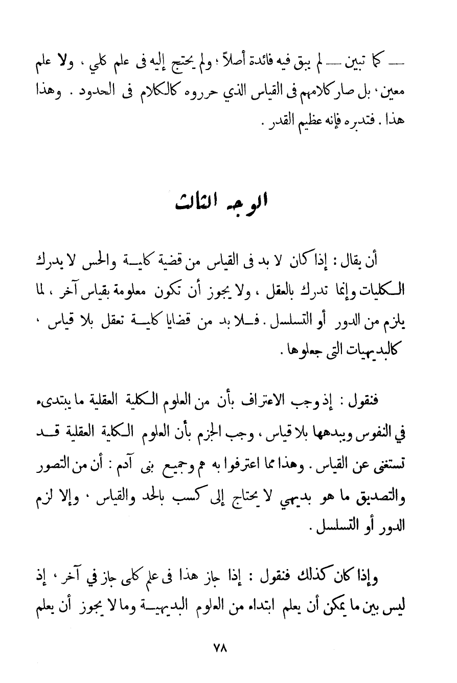 الْوَجْهُ الثَّالِثُ: أَنْ يُقَالَ: إذَا كَانَ لَا بُدَّ فِي الْقِيَاسِ مِنْ قَضِيَّةٍ كُلِّيَّةٍ وَالْحِسُّ لَا يُدْرِكُ الْكُلِّيَّاتِ وَإِنَّمَا تُدْرَكُ بِالْعَقْلِ وَلَا يَجُوزُ أَنْ تَكُونَ مَعْلُومَةً بِقِيَاسِ آخَرَ لِمَا يَلْزَمُ مِنْ الدَّوْرِ أَوْ التَّسَلْسُلِ. فَلَا بُدَّ مِنْ قَضَايَا كُلِّيَّةٍ تُعْقَلُ بِلَا قِيَاسٍ كَالْبَدِيهِيَّاتِ الَّتِي جَعَلُوهَا. فَنَقُولُ: إذْ وَجَبَ الِاعْتِرَافُ بِأَنَّ مِنْ الْعُلُومِ الْكُلِّيَّةِ الْعَقْلِيَّةِ مَا يَبْتَدِئُ فِي النُّفُوسِ وَيَبْدَهُهَا بِلَا قِيَاسٍ وَجَبَ الْجَزْمُ بِأَنَّ الْعُلُومَ الْكُلِّيَّةَ الْعَقْلِيَّةَ قَدْ تَسْتَغْنِي عَنْ الْقِيَاسِ. وَهَذَا مِمَّا اعْتَرَفُوا بِهِ هُمْ وَجَمِيعُ بَنِي آدَمَ: أَنَّ مِنْ التَّصَوُّرِ وَالتَّصْدِيقِ مَا هُوَ بَدِيهِيٌّ لَا يَحْتَاجُ إلَى كَسْبٍ بِالْحَدِّ وَالْقِيَاسِ وَإِلَّا لَزِمَ الدَّوْرُ أَوْ التَّسَلْسُلُ. وَإِذَا كَانَ كَذَلِكَ فَنَقُولُ: إذَا جَازَ هَذَا فِي عِلْمٍ كُلِّيٍّ جَازَ فِي آخَرَ إذْ لَيْسَ بَيْنَ مَا يُمْكِنُ أَنْ يُعْلَمَ ابْتِدَاءً مِنْ الْعُلُومِ الْبَدِيهِيَّةِ وَمَا لَا يَجُوزُ أَنْ يُعْلَمَ
