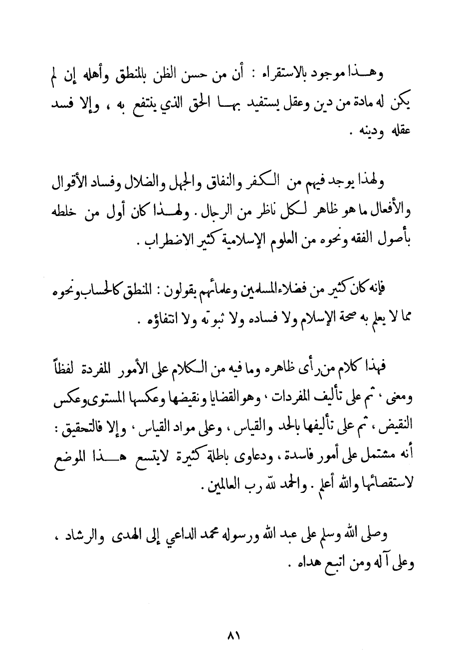 وَهَذَا مَوْجُودٌ بِالِاسْتِقْرَاءِ: أَنَّ مِنْ حُسْنِ الظَّنِّ بِالْمَنْطِقِ وَأَهْلِهِ إنْ لَمْ يَكُنْ لَهُ مَادَّةٌ مِنْ دِينٍ وَعَقْلٍ يَسْتَفِيدُ بِهَا الْحَقَّ الَّذِي يَنْتَفِعُ بِهِ وَإِلَّا فَسَدَ عَقْلُهُ وَدِينُهُ. وَلِهَذَا يُوجَدُ فِيهِمْ مِنْ الْكُفْرِ وَالنِّفَاقِ وَالْجَهْلِ وَالضَّلَالِ وَفَسَادِ الْأَقْوَالِ وَالْأَفْعَالِ مَا هُوَ ظَاهِرٌ لِكُلِّ نَاظِرٍ مِنْ الرِّجَالِ. وَلِهَذَا كَانَ أَوَّلُ مَنْ خَلَطَهُ بِأُصُولِ الْفِقْهِ وَنَحْوِهِ مِنْ الْعُلُومِ الْإِسْلَامِيَّةِ كَثِيرُ الِاضْطِرَابِ. فَإِنَّهُ كَانَ كَثِيرٌ مِنْ فُضَلَاءِ الْمُسْلِمِينَ وَعُلَمَائِهِمْ يَقُولُونَ: الْمَنْطِقُ كَالْحِسَابِ وَنَحْوِهِ مِمَّا لَا يُعْلَمُ بِهِ صِحَّةُ الْإِسْلَامِ وَلَا فَسَادُهُ وَلَا ثُبُوتُهُ وَلَا انْتِفَاؤُهُ. فَهَذَا كَلَامُ مَنْ رَأَى ظَاهِرَهُ وَمَا فِيهِ مِنْ الْكَلَامِ عَلَى الْأُمُورِ الْمُفْرَدَةِ لَفْظًا وَمَعْنًى ثُمَّ عَلَى تَأْلِيفِ الْمُفْرَدَاتِ وَهُوَ الْقَضَايَا وَنَقِيضُهَا وَعَكْسُهَا الْمُسْتَوِي وَعَكْسُ النَّقِيضِ ثُمَّ عَلَى تَأْلِيفِهَا بِالْحَدِّ وَالْقِيَاسِ وَعَلَى مَوَادِّ الْقِيَاسِ وَإِلَّا فَالتَّحْقِيقُ: أَنَّهُ مُشْتَمِلٌ عَلَى أُمُورٍ فَاسِدَةٍ وَدَعَاوَى بَاطِلَةٍ كَثِيرَةٍ لَا يَتَّسِعُ هَذَا الْمَوْضِعُ لِاسْتِقْصَائِهَا وَاَللَّهُ أَعْلَمُ. وَالْحَمْدُ لِلَّهِ رَبِّ الْعَالَمِينَ. وَصَلَّى اللَّهُ وَسَلَّمَ عَلَى عَبْدِ اللَّهِ وَرَسُولِهِ مُحَمَّدٍ الدَّاعِي إلَى الْهُدَى وَالرَّشَادِ وَعَلَى آلِهِ وَمَنْ اتَّبَعَ هُدَاهُ.