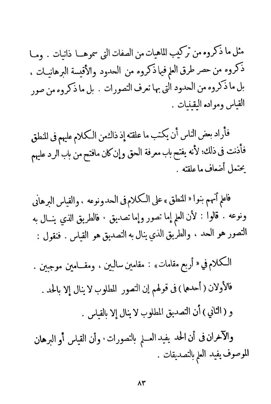 فَنَقُولُ: الْكَلَامُ فِي " أَرْبَعِ مَقَامَاتٍ ": مَقَامَيْنِ سَالِبَيْنِ وَمَقَامَيْنِ مُوجَبَيْنِ. فَالْأَوَّلَانِ أَحَدُهُمَا فِي قَوْلِهِمْ إنَّ التَّصَوُّرَ الْمَطْلُوبَ لَا يُنَالُ إلَّا بِالْحَدِّ. والثَّانِي أَنَّ التَّصْدِيقَ الْمَطْلُوبَ لَا يُنَالُ إلَّا بِالْقِيَاسِ. وَالْآخَرَانِ فِي أَنَّ الْحَدَّ يُفِيدُ الْعِلْمَ بِالتَّصَوُّرَاتِ وَأَنَّ الْقِيَاسَ أَوْ الْبُرْهَانَ الْمَوْصُوفَ يُفِيدُ الْعِلْمَ بِالتَّصْدِيقَاتِ.
