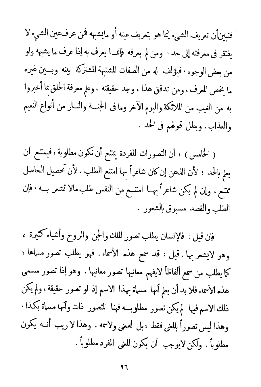 فَتَبَيَّنَ أَنَّ تَعْرِيفَ الشَّيْءِ إنَّمَا هُوَ بِتَعْرِيفِ عَيْنِهِ أَوْ مَا يُشْبِهُهُ فَمَنْ عَرَفَ عَيْنَ الشَّيْءِ لَا يَفْتَقِرُ فِي مَعْرِفَتِهِ إلَى حَدٍّ وَمَنْ لَمْ يَعْرِفْهُ فَإِنَّمَا يَعْرِفُ بِهِ إذَا عَرَفَ مَا يُشْبِهُهُ وَلَوْ مِنْ بَعْضِ الْوُجُوهِ فَيُؤَلِّفُ لَهُ مِنْ الصِّفَاتِ الْمُشْتَبِهَةِ الْمُشْتَرَكَةِ بَيْنَهُ وَبَيْنَ غَيْرِهِ مَا يَخُصُّ الْمُعَرَّفَ وَمَنْ تَدَقَّقَ هَذَا وَجَدَ حَقِيقَتَهُ وَعَلِمَ مَعْرِفَةَ الْخَلْقِ بِمَا أُخْبِرُوا بِهِ مِنْ الْغَيْبِ مِنْ الْمَلَائِكَةِ وَالْيَوْمِ الْآخِرِ وَمَا فِي الْجَنَّةِ وَالنَّارِ مِنْ أَنْوَاعِ النَّعِيمِ وَالْعَذَابِ. وَبَطَلَ قَوْلُهُمْ فِي الْحَدِّ. (الْخَامِسُ: أَنَّ التَّصَوُّرَاتِ الْمُفْرَدَةَ يَمْتَنِعُ أَنْ تَكُونَ مَطْلُوبَةً؛ فَيَمْتَنِعُ أَنْ يُعْلَمَ بِالْحَدِّ؛ لِأَنَّ الذِّهْنَ إنْ كَانَ شَاعِرًا بِهَا امْتَنَعَ الطَّلَبُ لِأَنَّ تَحْصِيلَ الْحَاصِلِ مُمْتَنِعٌ وَإِنْ لَمْ يَكُنْ شَاعِرًا بِهَا امْتَنَعَ مِنْ النَّفْسِ طَلَبُ مَا لَا تَشْعُرُ بِهِ فَإِنَّ الطَّلَبَ وَالْقَصْدَ مَسْبُوقٌ بِالشُّعُورِ. فَإِنْ قِيلَ: فَالْإِنْسَانُ يَطْلُبُ تَصَوُّرَ الْمَلَكِ وَالْجِنِّ وَالرُّوحِ وَأَشْيَاءَ كَثِيرَةٍ وَهُوَ لَا يَشْعُرُ بِهَا. قِيلَ: قَدْ سَمِعَ هَذِهِ الْأَسْمَاءَ. فَهُوَ يَطْلُبُ تَصَوُّرَ مُسَمَّاهَا؛ كَمَا يَطْلُبُ مَنْ سَمِعَ أَلْفَاظًا لَا يَفْهَمُ مَعَانِيَهَا تَصَوُّرَ مَعَانِيَهَا. وَهُوَ إذَا تَصَوَّرَ مُسَمَّى هَذِهِ الْأَسْمَاءِ فَلَا بُدَّ أَنْ يَعْلَمَ أَنَّهَا مُسَمَّاةٌ بِهَذَا الِاسْمِ إذْ لَوْ تَصَوَّرَ حَقِيقَةً وَلَمْ يَكُنْ ذَلِكَ الِاسْمُ فِيهَا لَمْ يَكُنْ تَصَوَّرَ مَطْلُوبَهُ فَهُنَا الْمُتَصَوَّرُ ذَاتٌ وَأَنَّهَا مُسَمَّاةٌ بِكَذَا وَهَذَا لَيْسَ تَصَوُّرًا بِالْمَعْنَى فَقَطْ؛ بَلْ لِلْمَعْنَى وَلِاسْمِهِ. وَهَذَا لَا رَيْبَ أَنَّهُ يَكُونُ مَطْلُوبًا. وَلَكِنْ لَا يُوجِبُ أَنْ يَكُونَ الْمَعْنَى الْمُفْرَدُ مَطْلُوبًا.