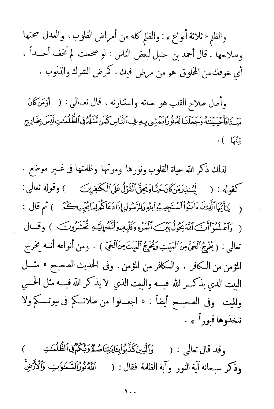 وَالظُّلْمُ " ثَلَاثَةُ أَنْوَاعٍ ": وَالظُّلْمُ كُلُّهُ مِنْ أَمْرَاضِ الْقُلُوبِ وَالْعَدْلُ صِحَّتُهَا وَصَلَاحُهَا. قَالَ أَحْمَد بْنُ حَنْبَلٍ لِبَعْضِ النَّاسِ: لَوْ صَحَحْت لَمْ تَخَفْ أَحَدًا أَيْ خَوْفُك مِنْ الْمَخْلُوقِ هُوَ مِنْ مَرَضٍ فِيك كَمَرَضِ الشِّرْكِ وَالذُّنُوبِ. وَأَصْلُ صَلَاحِ الْقَلْبِ هُوَ حَيَاتُهُ وَاسْتِنَارَتُهُ قَالَ تَعَالَى: {أَوَمَنْ كَانَ مَيْتًا فَأَحْيَيْنَاهُ وَجَعَلْنَا لَهُ نُورًا يَمْشِي بِهِ فِي النَّاسِ كَمَنْ مَثَلُهُ فِي الظُّلُمَاتِ لَيْسَ بِخَارِجٍ مِنْهَا} . لِذَلِكَ ذَكَرَ اللَّهُ حَيَاةَ الْقُلُوبِ وَنُورَهَا وَمَوْتَهَا وَظُلْمَتَهَا فِي غَيْرِ مَوْضِعٍ. كَقَوْلِهِ: {لِيُنْذِرَ مَنْ كَانَ حَيًّا وَيَحِقَّ الْقَوْلُ عَلَى الْكَافِرِينَ} وقَوْله تَعَالَى {يَا أَيُّهَا الَّذِينَ آمَنُوا اسْتَجِيبُوا لِلَّهِ وَلِلرَّسُولِ إذَا دَعَاكُمْ لِمَا يُحْيِيكُمْ} ثُمَّ قَالَ: {وَاعْلَمُوا أَنَّ اللَّهَ يَحُولُ بَيْنَ الْمَرْءِ وَقَلْبِهِ وَأَنَّهُ إلَيْهِ تُحْشَرُونَ} وَقَالَ تَعَالَى: {يُخْرِجُ الْحَيَّ مِنَ الْمَيِّتِ وَيُخْرِجُ الْمَيِّتَ مِنَ الْحَيِّ} . وَمِنْ أَنْوَاعِهِ أَنَّهُ يُخْرِجُ الْمُؤْمِنَ مِنْ الْكَافِرِ وَالْكَافِرَ مِنْ الْمُؤْمِنِ. وَفِي الْحَدِيثِ الصَّحِيحِ {مَثَلُ الْبَيْتِ الَّذِي يُذْكَرُ اللَّهُ فِيهِ وَالْبَيْتِ الَّذِي لَا يُذْكَرُ اللَّهُ فِيهِ مَثَلُ الْحَيِّ وَالْمَيِّتِ} وَفِي الصَّحِيحِ أَيْضًا: {اجْعَلُوا مِنْ صَلَاتِكُمْ فِي بُيُوتِكُمْ وَلَا تَتَّخِذُوهَا قُبُورًا} . وَقَدْ قَالَ تَعَالَى: {وَالَّذِينَ كَذَّبُوا بِآيَاتِنَا صُمٌّ وَبُكْمٌ فِي الظُّلُمَاتِ} وَذَكَرَ سُبْحَانَهُ آيَةَ النُّورِ وَآيَةَ الظُّلْمَةِ فَقَالَ: {اللَّهُ نُورُ السَّمَاوَاتِ وَالْأَرْضِ