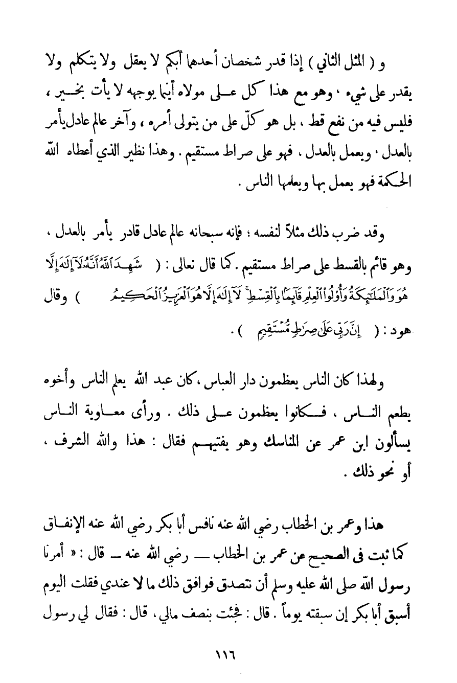 وَالْمَثَلُ الثَّانِي إذَا قُدِّرَ شَخْصَانِ أَحَدُهُمَا أَبْكَمُ لَا يَعْقِلُ وَلَا يَتَكَلَّمُ وَلَا يَقْدِرُ عَلَى شَيْءٍ وَهُوَ مَعَ هَذَا كَلٌّ عَلَى مَوْلَاهُ أَيْنَمَا يُوَجِّهْهُ لَا يَأْتِ بِخَيْرٍ فَلَيْسَ فِيهِ مِنْ نَفْعٍ قَطُّ بَلْ هُوَ كَلٌّ عَلَى مَنْ يَتَوَلَّى أَمْرَهُ وَآخَرُ عَالِمٌ عَادِلٌ يَأْمُرُ بِالْعَدْلِ وَيَعْمَلُ بِالْعَدْلِ فَهُوَ عَلَى صِرَاطٍ مُسْتَقِيمٍ. وَهَذَا نَظِيرُ الَّذِي أَعْطَاهُ اللَّهُ الْحِكْمَةَ فَهُوَ يَعْمَلُ بِهَا وَيُعَلِّمُهَا النَّاسَ. وَقَدْ ضَرَبَ ذَلِكَ مَثَلًا لِنَفْسِهِ؛ فَإِنَّهُ سُبْحَانَهُ عَالِمٌ عَادِلٌ قَادِرٌ يَأْمُرُ بِالْعَدْلِ وَهُوَ قَائِمٌ بِالْقِسْطِ عَلَى صِرَاطٍ مُسْتَقِيمٍ. كَمَا قَالَ تَعَالَى: {شَهِدَ اللَّهُ أَنَّهُ لَا إلَهَ إلَّا هُوَ وَالْمَلَائِكَةُ وَأُولُو الْعِلْمِ قَائِمًا بِالْقِسْطِ لَا إلَهَ إلَّا هُوَ الْعَزِيزُ الْحَكِيمُ} وَقَالَ هُودٌ: {إنَّ رَبِّي عَلَى صِرَاطٍ مُسْتَقِيمٍ} . وَلِهَذَا كَانَ النَّاسُ يُعَظِّمُونَ دَارَ الْعَبَّاسِ كَانَ عَبْدُ اللَّهِ يُعَلِّمُ النَّاسَ وَأَخُوهُ يُطْعِمُ النَّاسَ فَكَانُوا يُعَظِّمُونَ عَلَى ذَلِكَ. وَرَأَى مُعَاوِيَةُ النَّاسَ يَسْأَلُونَ ابْنَ عُمَرَ عَنْ الْمَنَاسِكِ وَهُوَ يُفْتِيهِمْ فَقَالَ: هَذَا وَاَللَّهِ الشَّرَفُ أَوْ نَحْوُ ذَلِكَ. هَذَا وَعُمَرُ بْنُ الْخَطَّابِ رَضِيَ اللَّهُ عَنْهُ نَافَسَ أَبَا بَكْرٍ رَضِيَ اللَّهُ عَنْهُ الْإِنْفَاقَ كَمَا ثَبَتَ فِي الصَّحِيحِ عَنْ عُمَرَ بْنِ الْخَطَّابِ - رَضِيَ اللَّهُ عَنْهُ - قَالَ: {أَمَرَنَا رَسُولُ اللَّهِ صَلَّى اللَّهُ عَلَيْهِ وَسَلَّمَ أَنْ نَتَصَدَّقَ فَوَافَقَ ذَلِكَ مَالًا عِنْدِي فَقُلْت الْيَوْمَ أَسْبِقُ أَبَا بَكْرٍ إنْ سَبَقْته يَوْمًا. قَالَ: فَجِئْت بِنِصْفِ مَالِي قَالَ: فَقَالَ لِي رَسُولُ