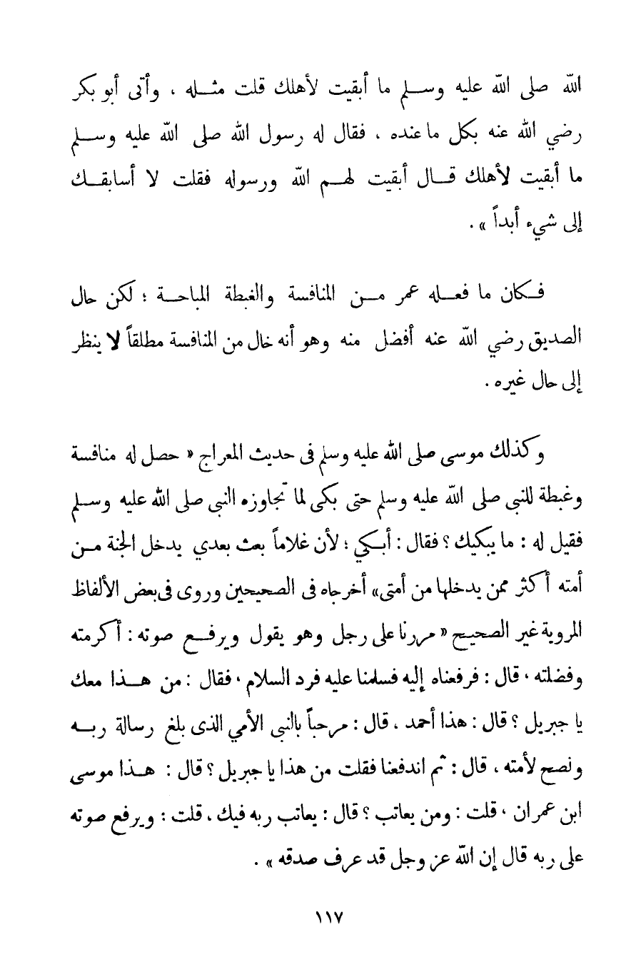 اللَّهِ صَلَّى اللَّهُ عَلَيْهِ وَسَلَّمَ مَا أَبْقَيْت لِأَهْلِك قُلْت مِثْلَهُ وَأَتَى أَبُو بَكْرٍ رَضِيَ اللَّهُ عَنْهُ بِكُلِّ مَا عِنْدَهُ فَقَالَ لَهُ رَسُولُ اللَّهِ صَلَّى اللَّهُ عَلَيْهِ وَسَلَّمَ مَا أَبْقَيْت لِأَهْلِك قَالَ أَبْقَيْت لَهُمْ اللَّهَ وَرَسُولَهُ فَقُلْت لَا أُسَابِقُك إلَى شَيْءٍ أَبَدًا} . فَكَانَ مَا فَعَلَهُ عُمَرُ مِنْ الْمُنَافَسَةِ وَالْغِبْطَةِ الْمُبَاحَةِ؛ لَكِنَّ حَالَ الصِّدِّيقِ رَضِيَ اللَّهُ عَنْهُ أَفْضَلُ مِنْهُ وَهُوَ أَنَّهُ خَالٍ مِنْ الْمُنَافَسَةِ مُطْلَقًا لَا يَنْظُرُ إلَى حَالِ غَيْرِهِ. وَكَذَلِكَ {مُوسَى صَلَّى اللَّهُ عَلَيْهِ وَسَلَّمَ فِي حَدِيثِ الْمِعْرَاجِ حَصَلَ لَهُ مُنَافَسَةٌ وَغِبْطَةٌ لِلنَّبِيِّ صَلَّى اللَّهُ عَلَيْهِ وَسَلَّمَ حَتَّى بَكَى لَمَّا تَجَاوَزَهُ النَّبِيُّ صَلَّى اللَّهُ عَلَيْهِ وَسَلَّمَ فَقِيلَ لَهُ: مَا يُبْكِيك؟ فَقَالَ: أَبْكِي؛ لِأَنَّ غُلَامًا بُعِثَ بَعْدِي يَدْخُلُ الْجَنَّةَ مِنْ أُمَّتِهِ أَكْثَرُ مِمَّنْ يَدْخُلُهَا مِنْ أُمَّتِي} أَخْرَجَاهُ فِي الصَّحِيحَيْنِ وَرُوِيَ فِي بَعْضِ الْأَلْفَاظِ الْمَرْوِيَّةِ غَيْرُ الصَّحِيحِ {مَرَرْنَا عَلَى رَجُلٍ وَهُوَ يَقُولُ وَيَرْفَعُ صَوْتَهُ: أَكْرَمْته وَفَضَّلْته قَالَ: فَرَفَعْنَاهُ إلَيْهِ فَسَلَّمْنَا عَلَيْهِ فَرَدَّ السَّلَامَ فَقَالَ: مَنْ هَذَا مَعَك يَا جِبْرِيلُ؟ قَالَ: هَذَا أَحْمَد قَالَ: مَرْحَبًا بِالنَّبِيِّ الْأُمِّيِّ الَّذِي بَلَّغَ رِسَالَةَ رَبِّهِ وَنَصَحَ لِأُمَّتِهِ قَالَ: ثُمَّ انْدَفَعْنَا فَقُلْت مَنْ هَذَا يَا جِبْرِيلُ؟ قَالَ: هَذَا مُوسَى بْنُ عِمْرَانَ قُلْت: وَمَنْ يُعَاتِبُ؟ قَالَ: يُعَاتِبُ رَبَّهُ فِيك قُلْت: وَيَرْفَعُ صَوْتَهُ عَلَى رَبِّهِ قَالَ إنَّ اللَّهَ عَزَّ وَجَلَّ قَدْ عَرَفَ صِدْقَهُ} .